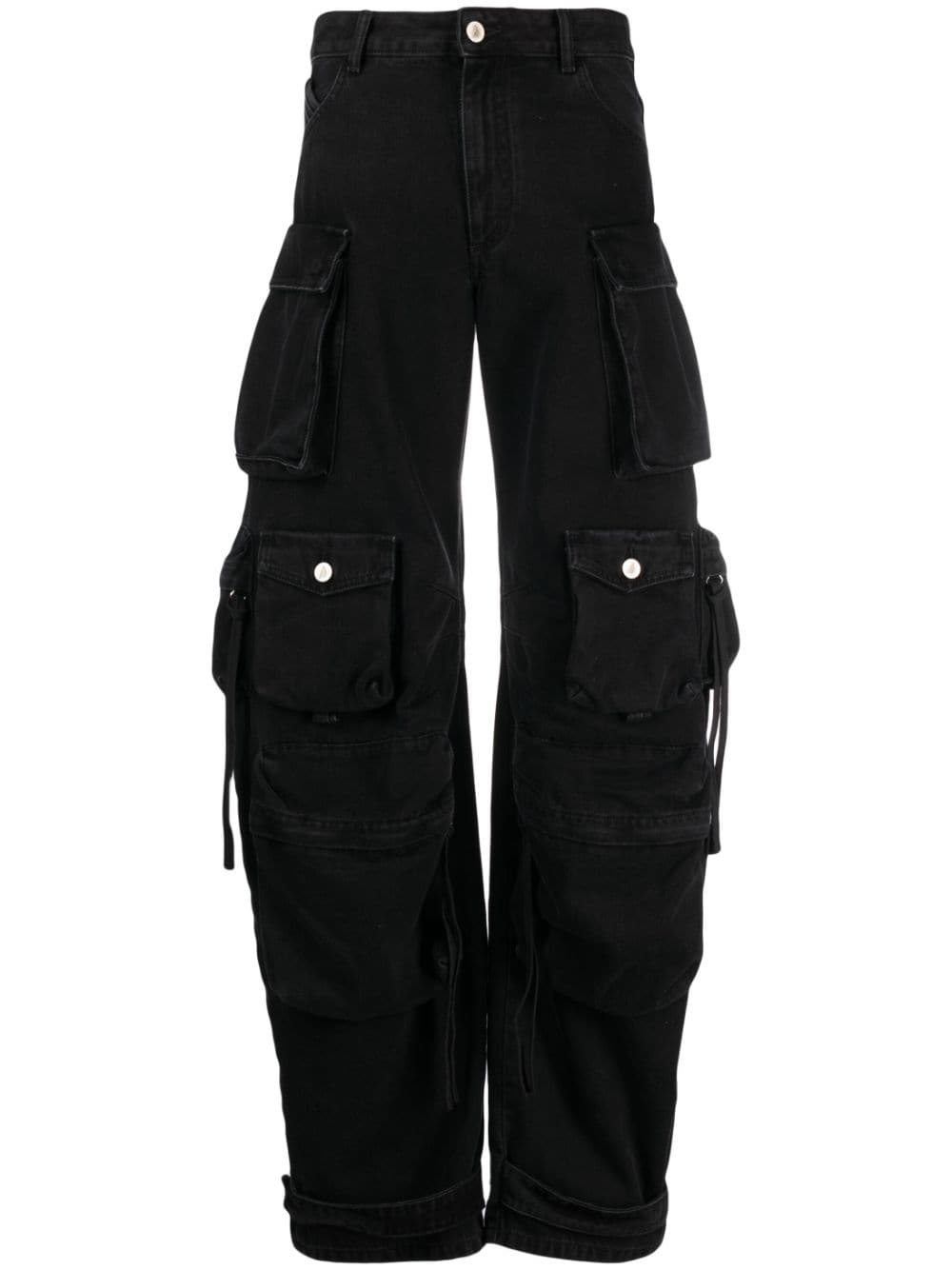 Fern cargo jeans from The Attico featuring black, cotton, denim, silver-tone hardware, high waist, belt loops, front button and zip fastening, classic five pockets, multiple cargo pockets and wide leg.