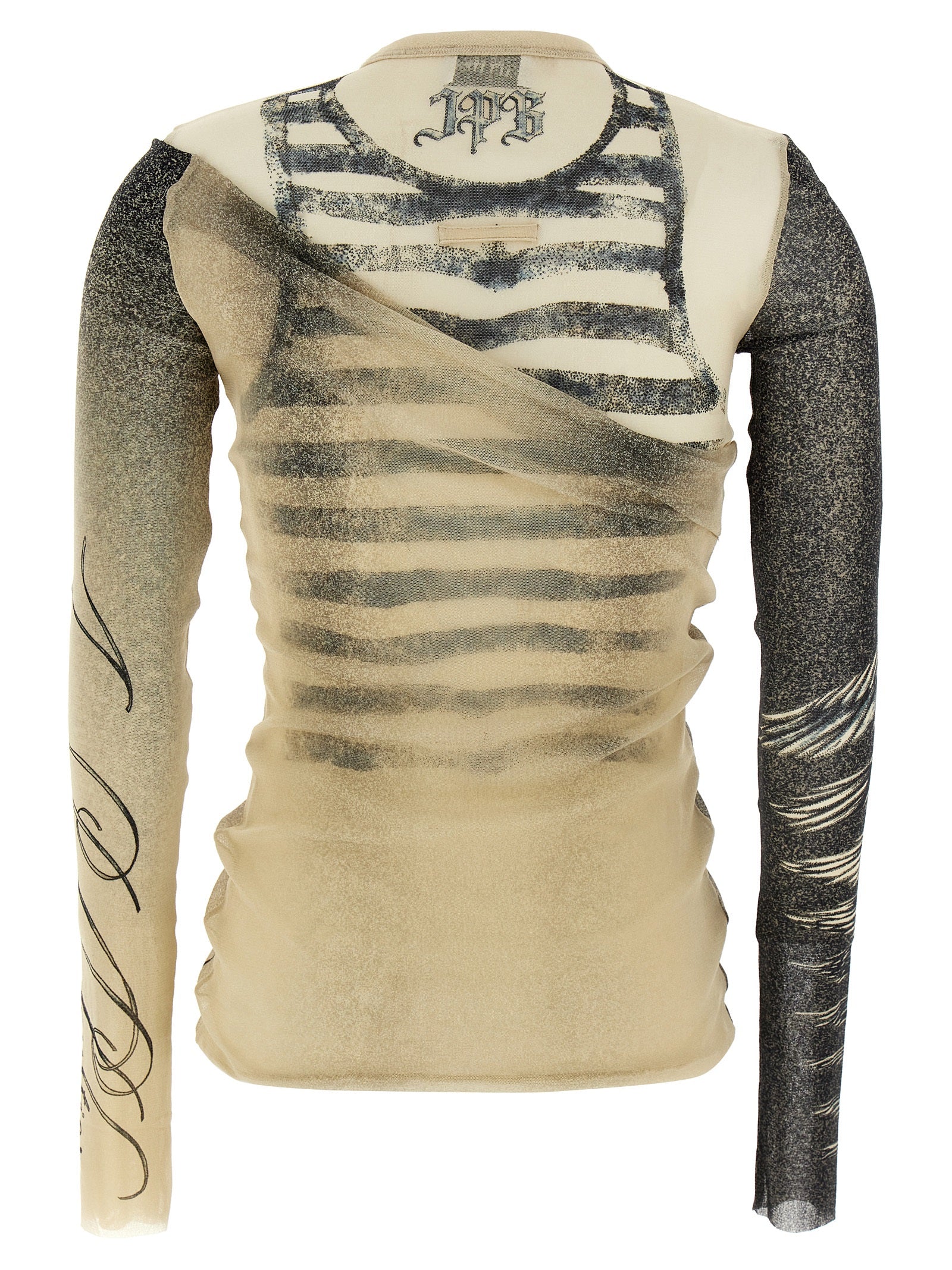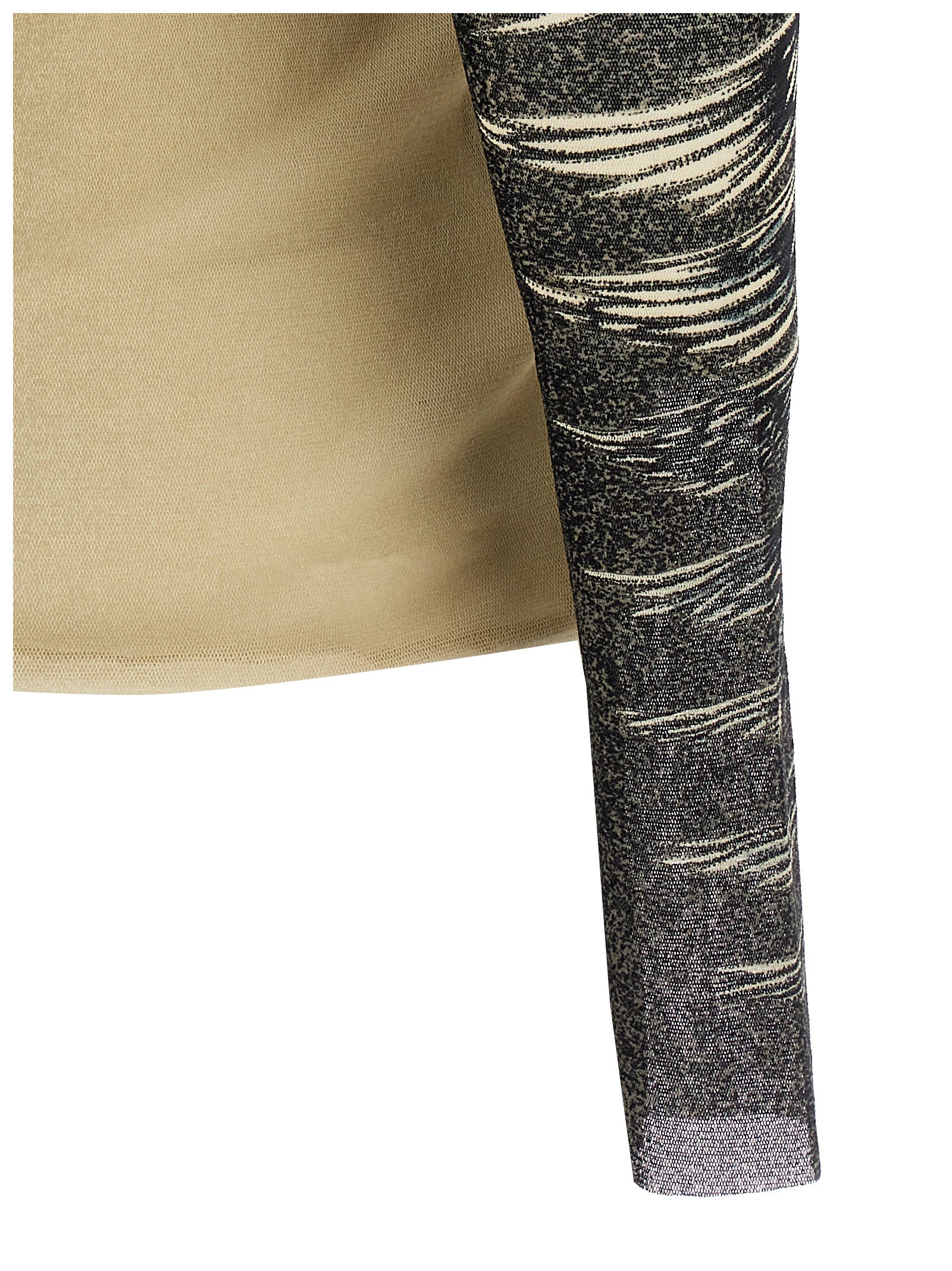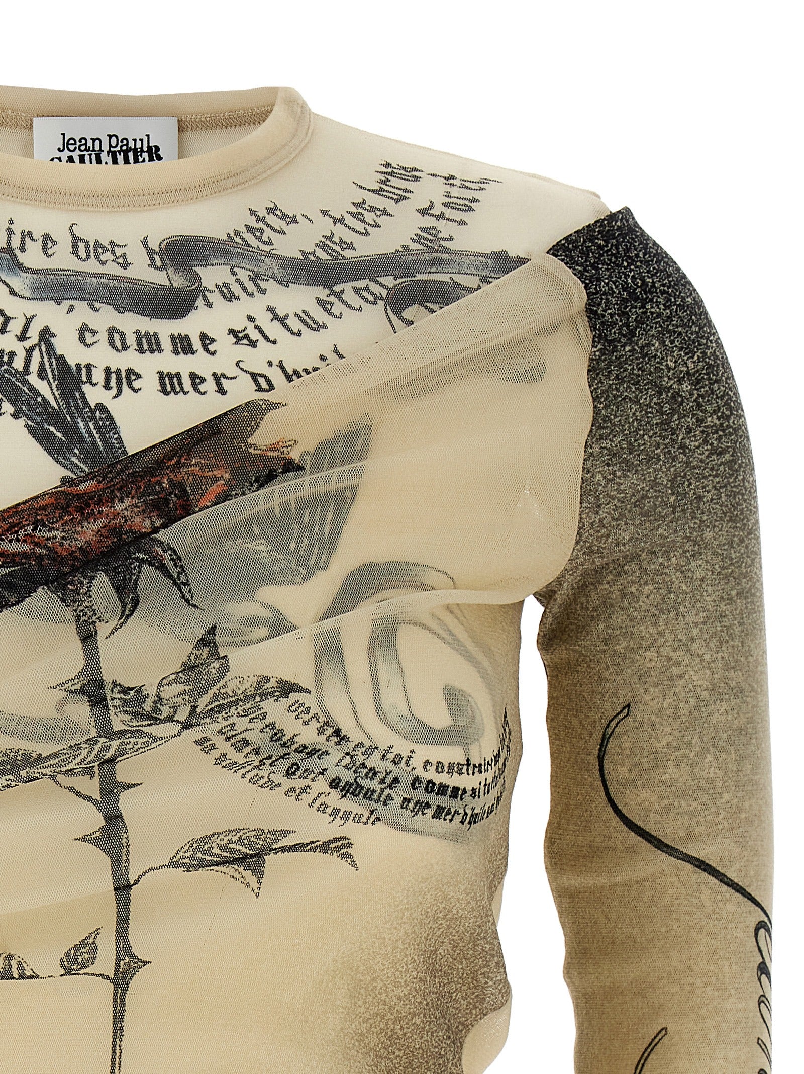 Double layer semi-transparent printed stretch tulle top with front and back draping, crew neck, long sleeves, raw cut hem.