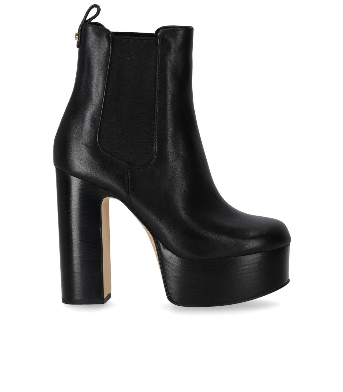 Natasha ankle boot by Michael Kors made of black leather, featuring side elastic bands and rear tongue with monogram pattern. Technical fabric lining and soft leather insole. Rubber sole, 12 cm heel height with 4 cm platform.