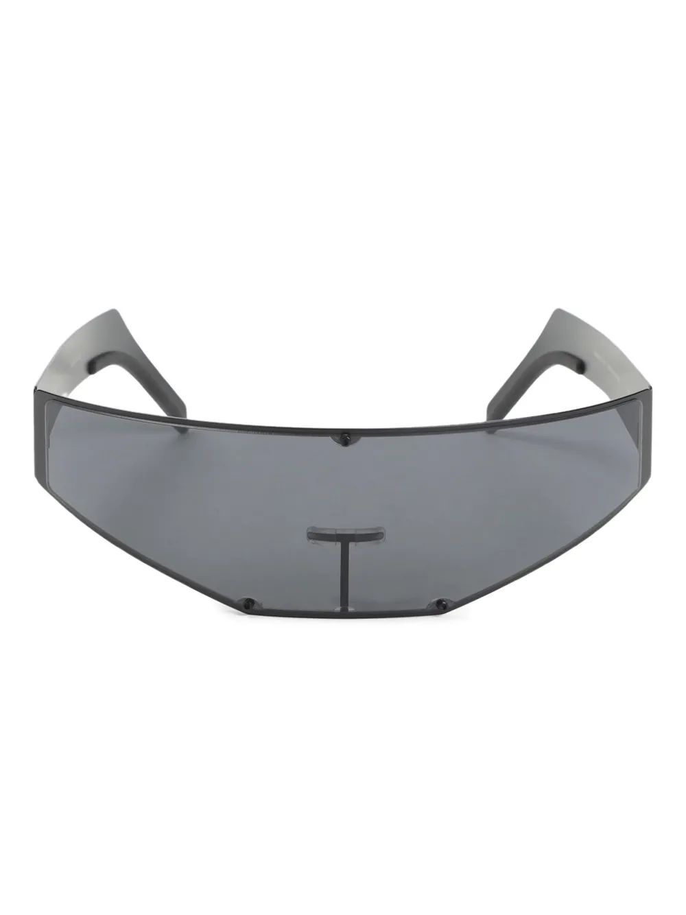 black shield frame grey lenses logo detail These glasses come with a protective case.