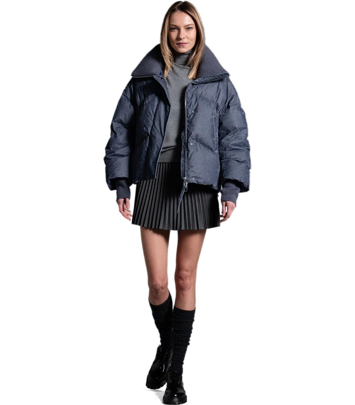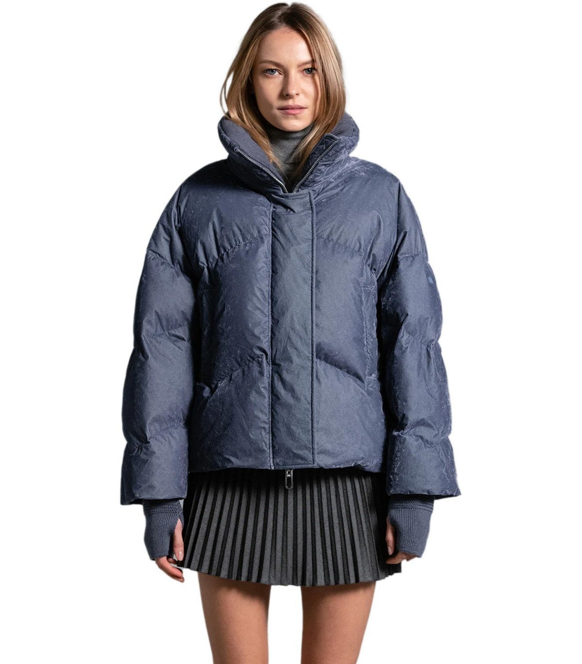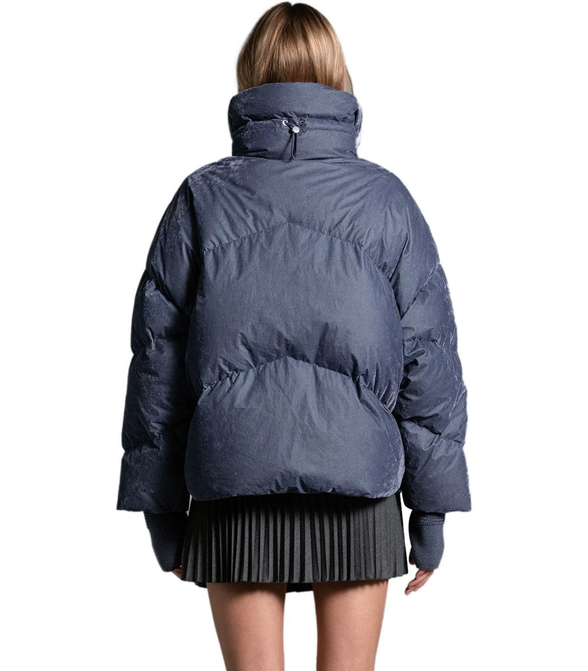 Irma down jacket by Duno, made of technical fabric based on nylon and surface flocking in viscose that illuminates the garment, in navy blue color. Characterized by a double front closure with a double-slider zip and hidden snaps, it features long sleeves with cuffs finished in long wool knit. Adorned with geometric quilting and a high collar, which has an external and internal drawstring, in wide ribbed wool knit. Equipped with closed side welt pockets. Hem with drawstring to ensure an oversized fit. Composition: 55% viscose, 45% polyamide. Padding: 90% down, 10% feather.