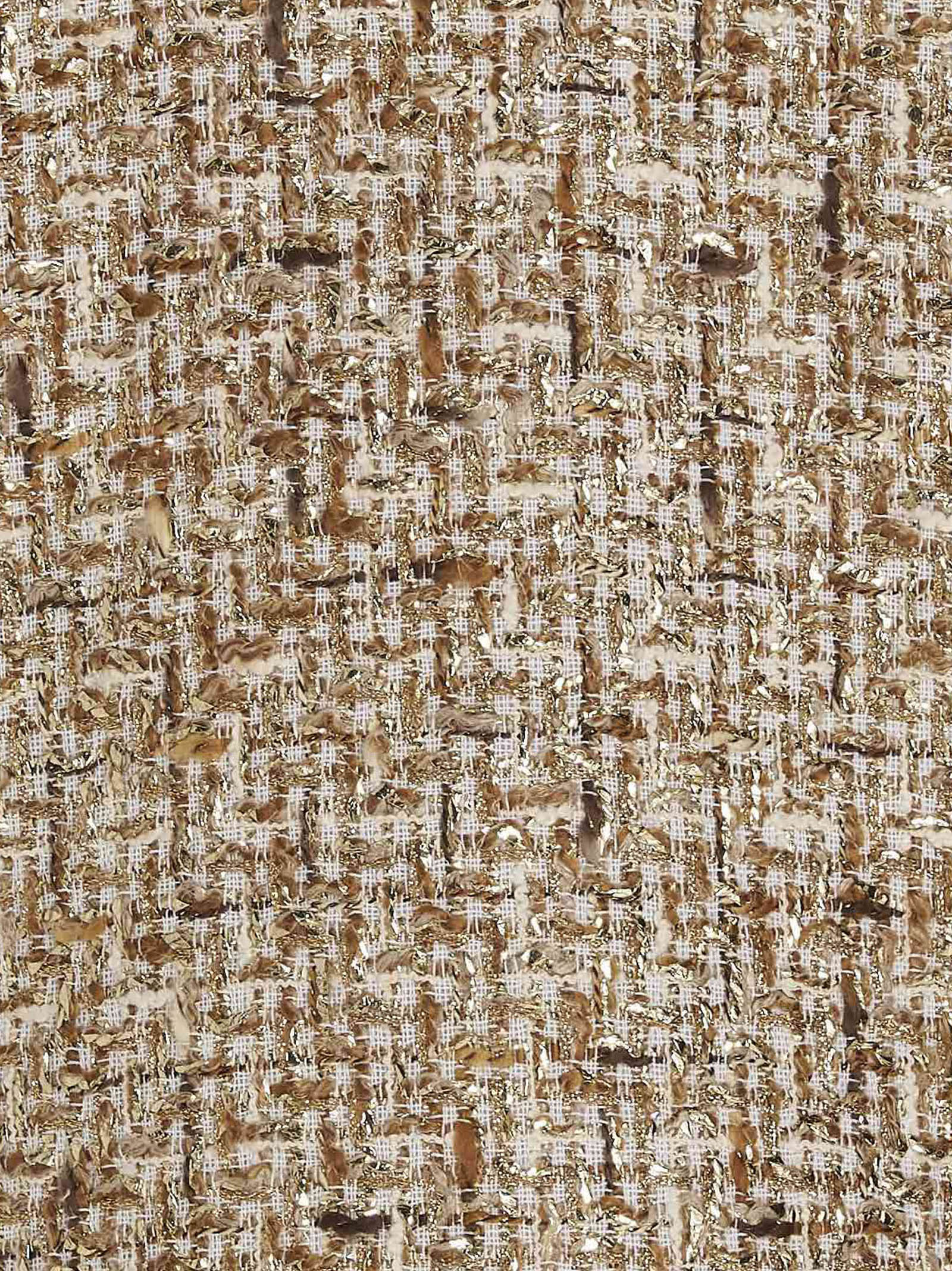 Ivory and gold bouclé coat with shirt collar, five gold signed buttons closure, pockets and long sleeves.