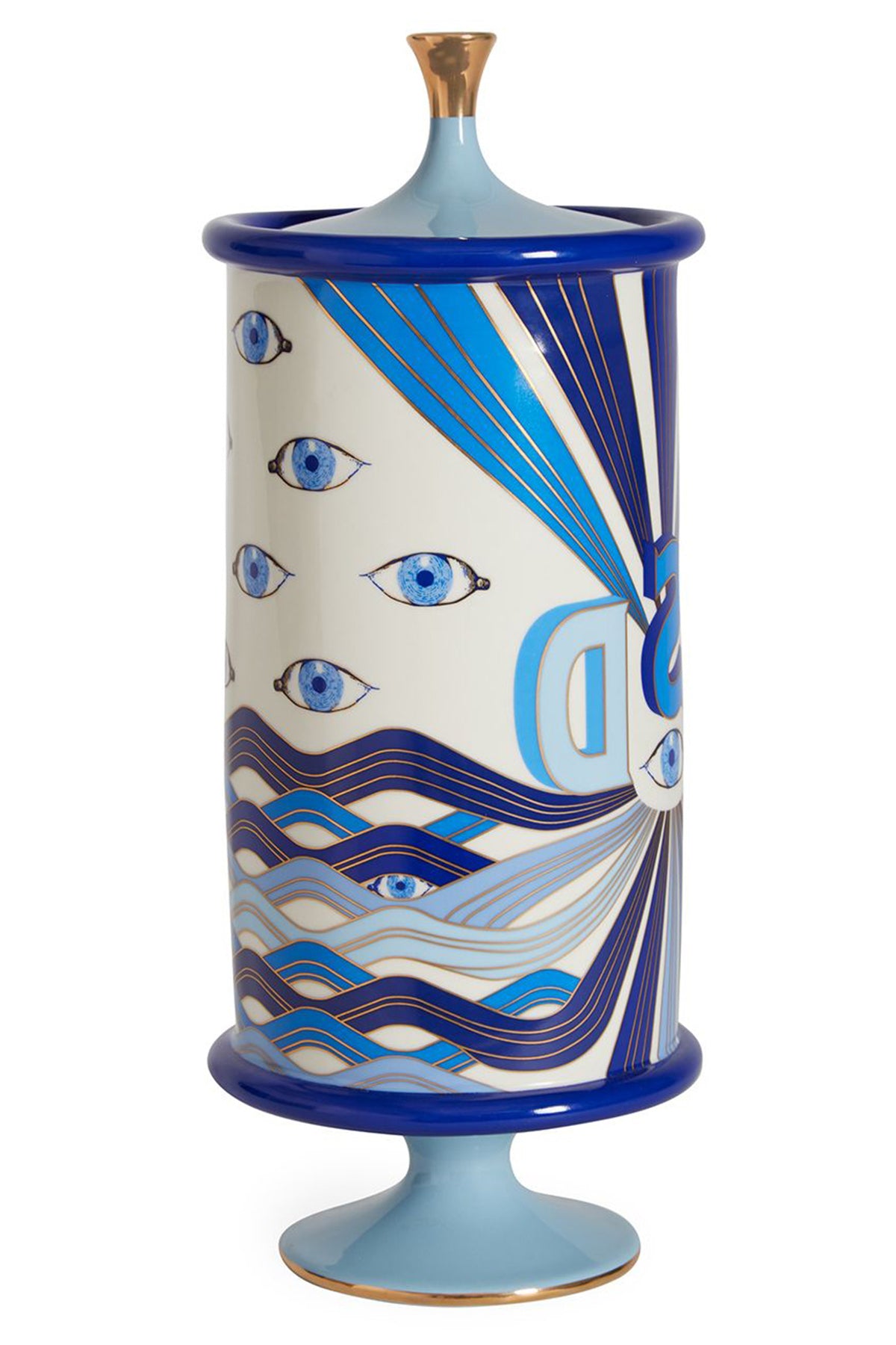 Expand your horizons with our containers for pharmacists. Third eye dreamy mental landscapes rendered in Delft-inspired blue and accented with real sparkling gold. High-fire porcelain elevates the experience. Hide your secrets in one whimsical view or group all four together to create your own surreal pharmacist.