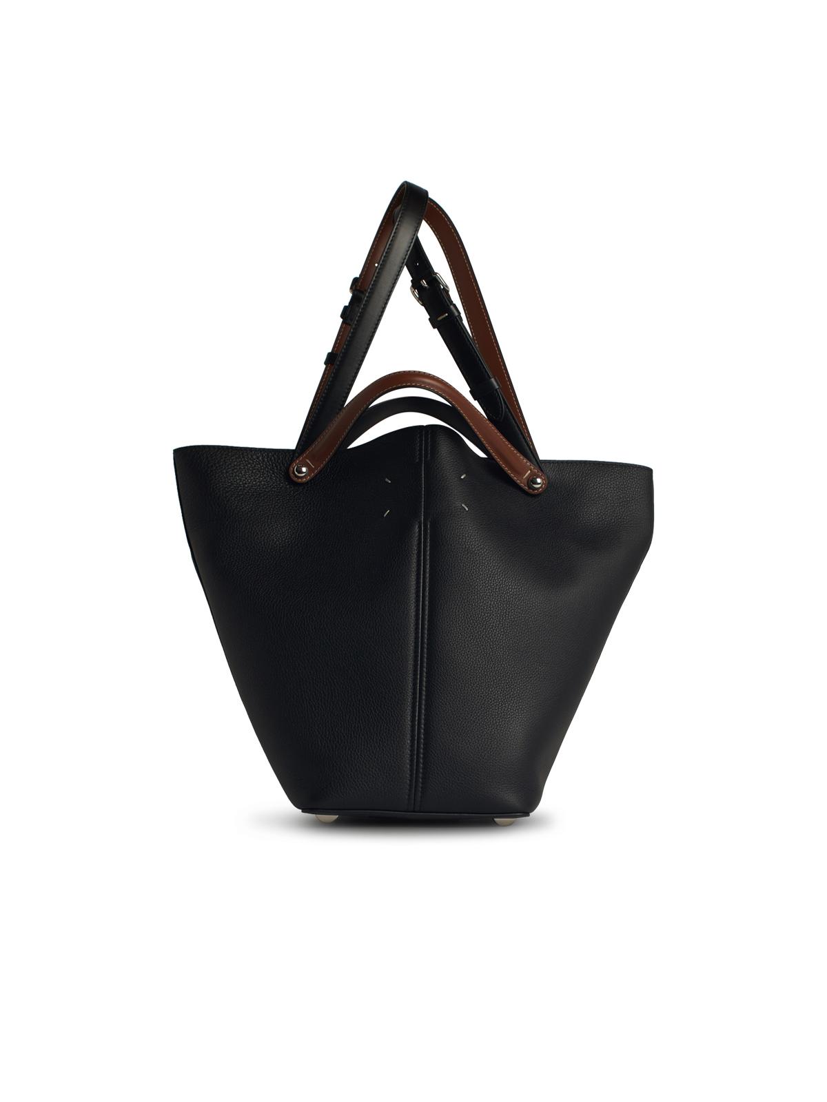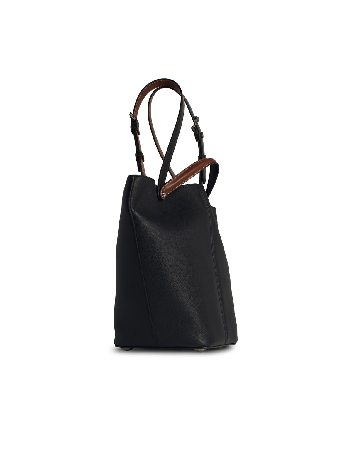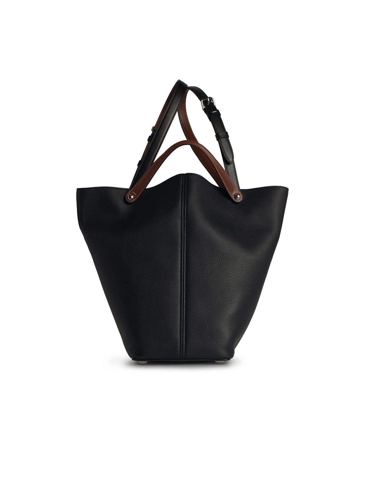 Double handle, adjustable shoulder strap, double magnet closure, tonal stitching, single inner compartment, four slit pockets, metal feet at the base\n31x15x15cm