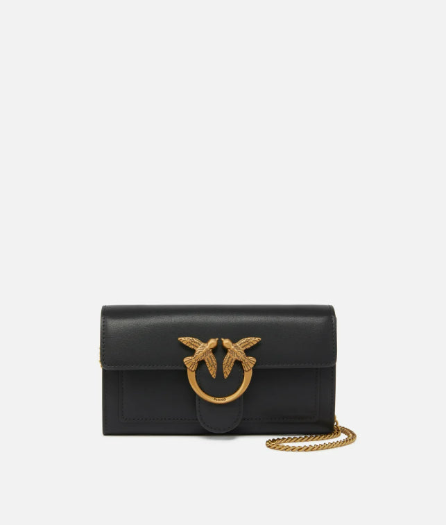 Love Bag soft leather wallet, with a smooth texture, complete with a thin metal chain shoulder strap that allows it to be worn as an evening bag. The leather pod closure with small studs is completed by a Love Birds Diamond Cut metal buckle.