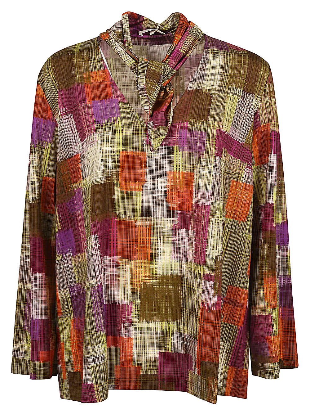 Multicolor shirt, V -neck, neck laces.