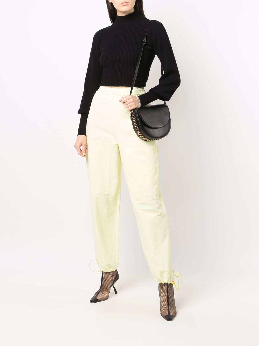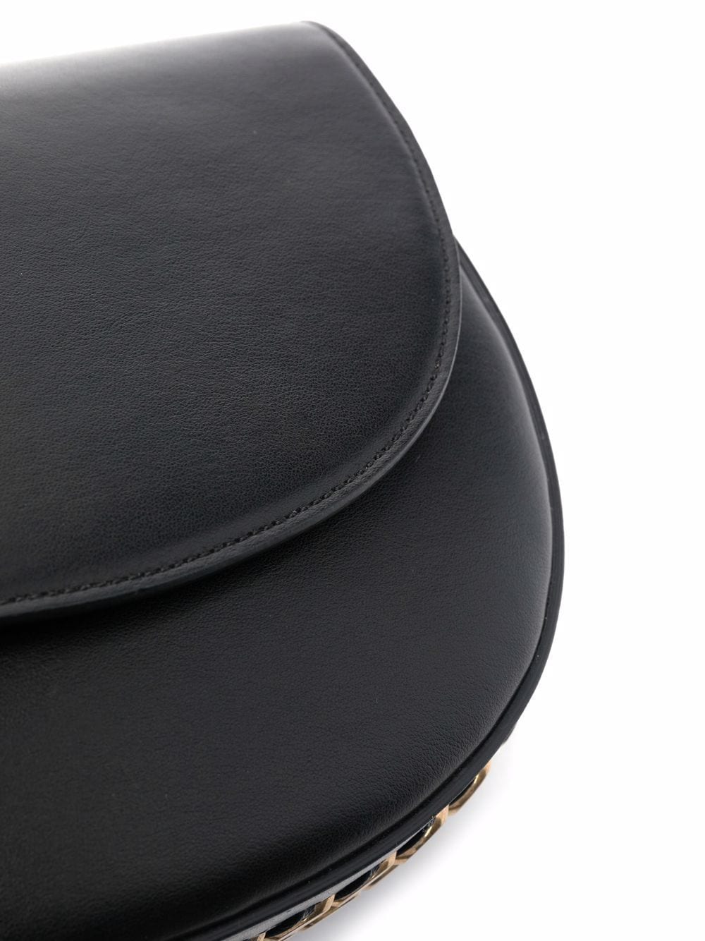 Edge with chain, gold-colored details, silver-colored details, pendant with logo, flap at the top, adjustable shoulder strap, snap button closure and internal bellows pocket. Black colour.