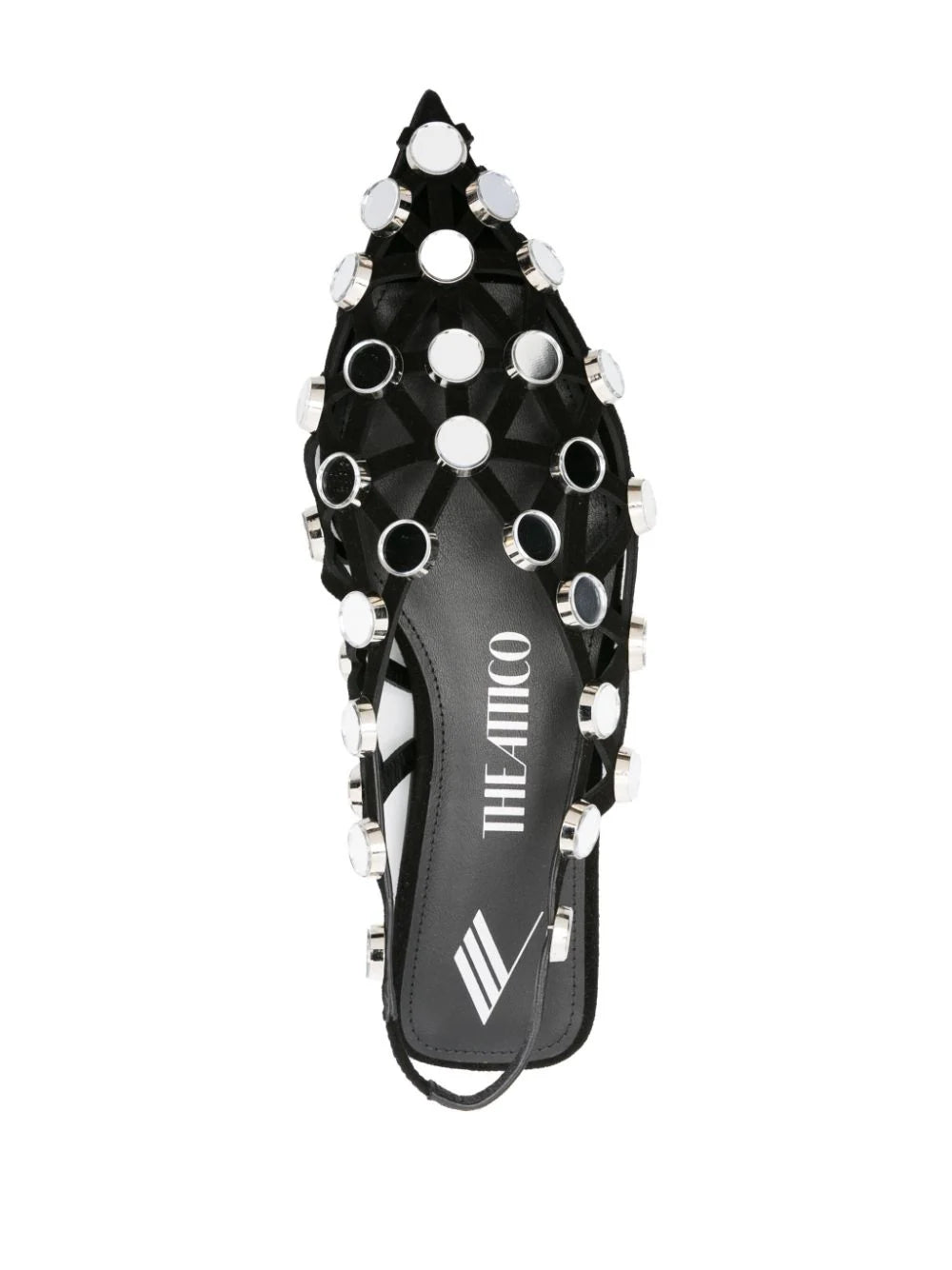 Black, calfskin, synthetic diamond decoration, logo footbed, elasticated heel band, pointed design and flat sole.