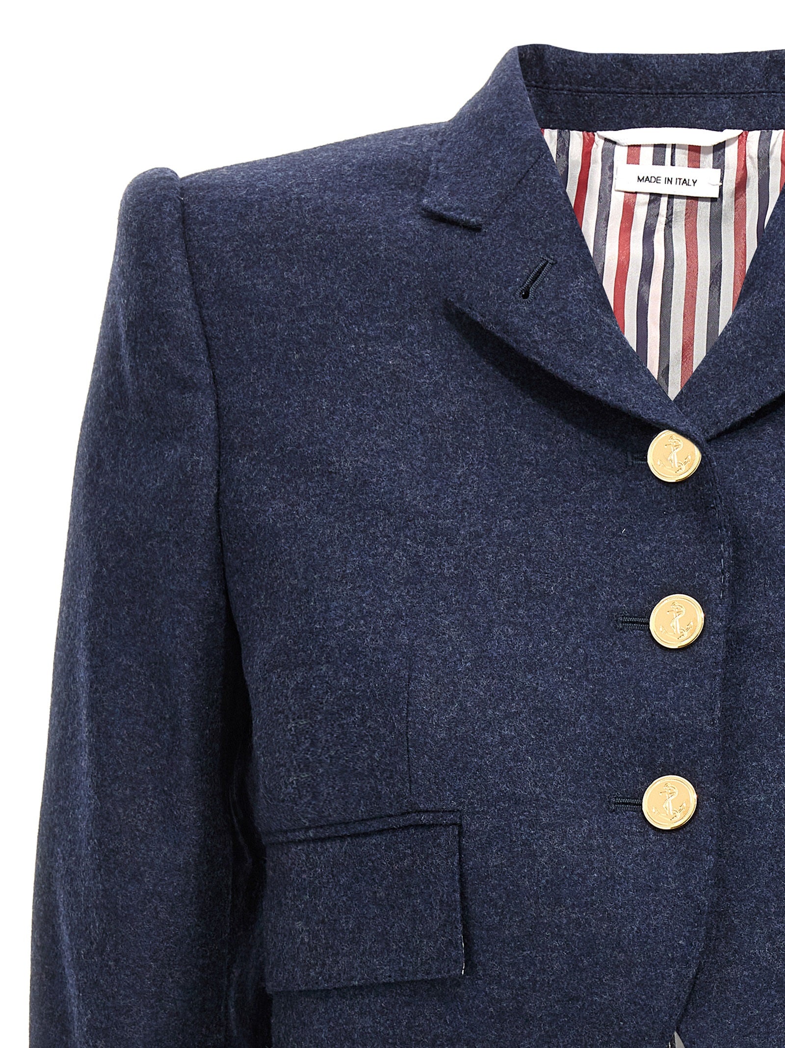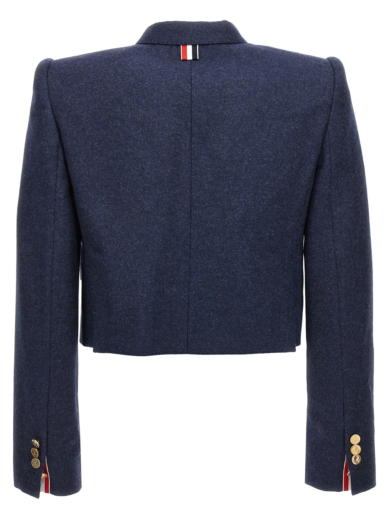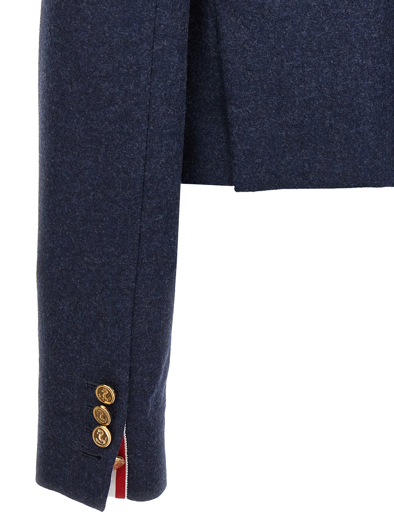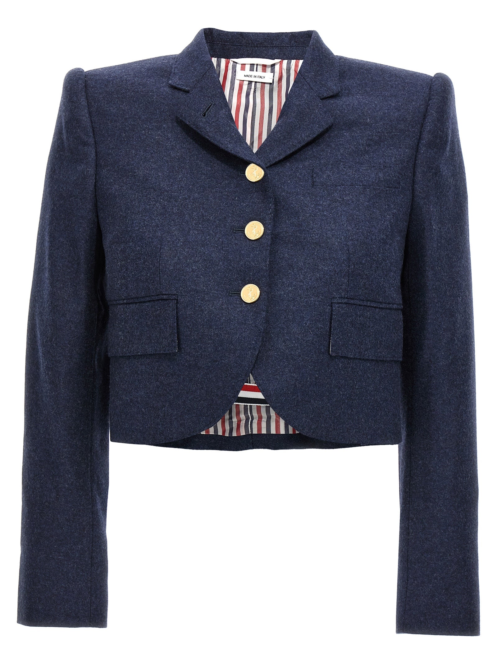 Single-breasted wool flannel cropped jacket with button closure, pockets, long sleeves, back vents.