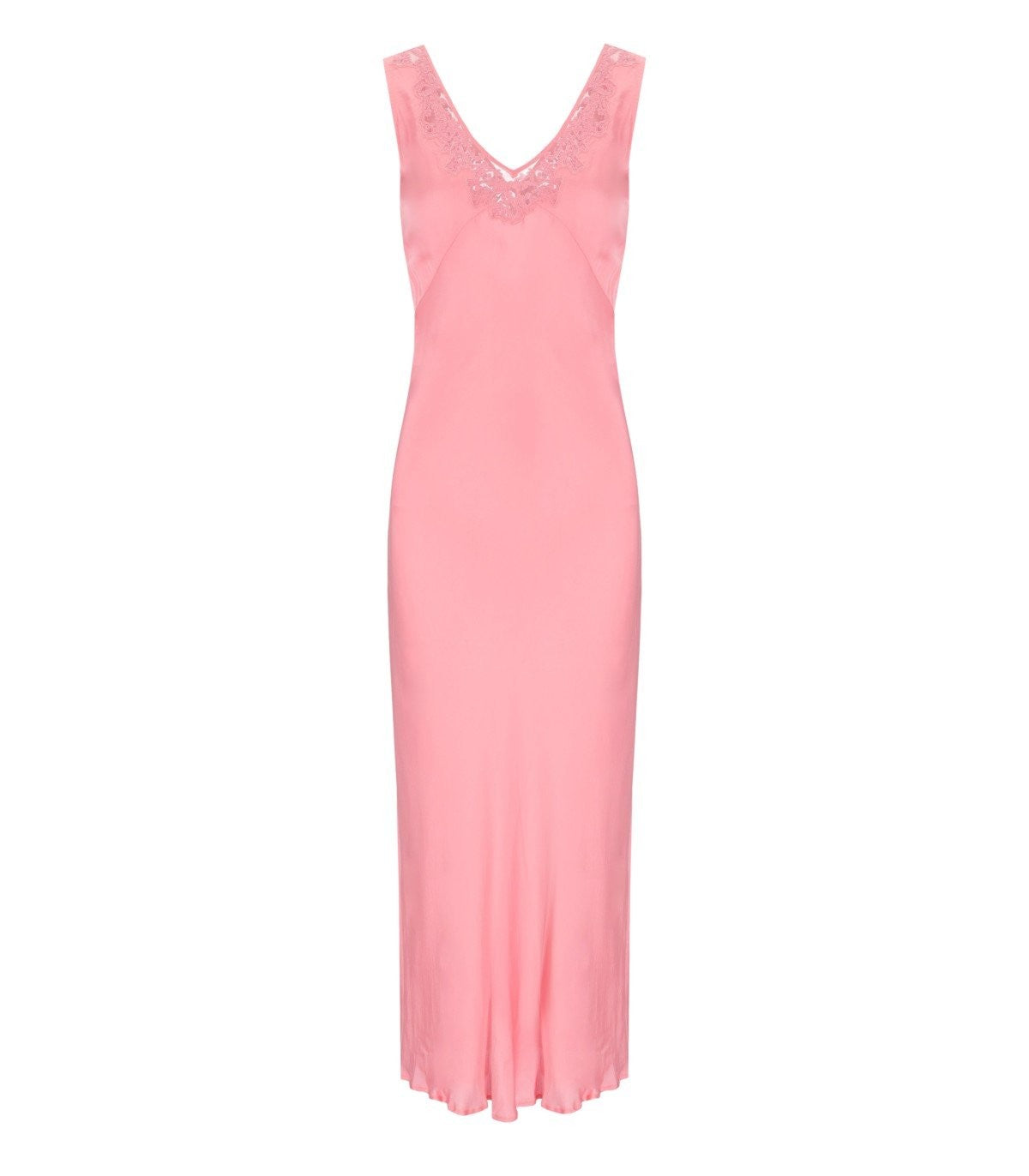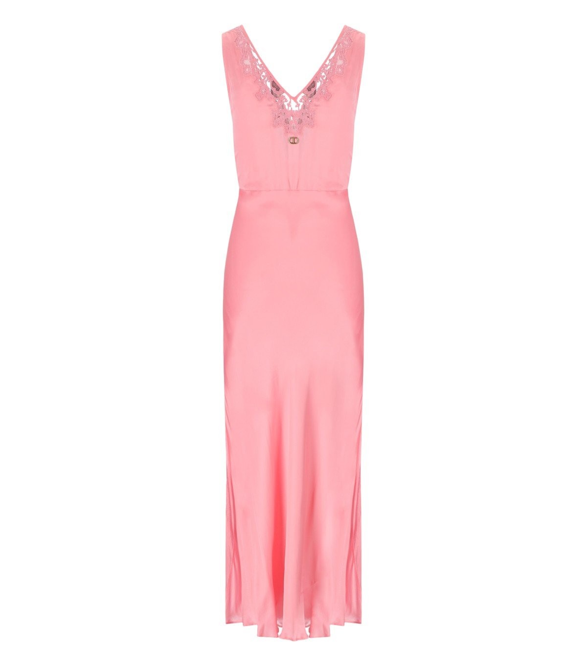 Twinset slip dress made of a viscose blend in peach pink tones with a glossy effect. Sleeveless, it features a V-neck adorned with lace detailing. Finished at the hem with side slits. Soft skirt completed with pleats at the bottom. Enhanced at the back with a gold metal logo plate. Fitted silhouette. The uneven appearance of the product should be considered a true characteristic of the garment's craftsmanship. Fabric composition 1: 100% viscose. Fabric composition 2: 100% polyester, 100% cotton. Embroidery: 100% viscose, 100% polyester. Lining: 100% polyester.