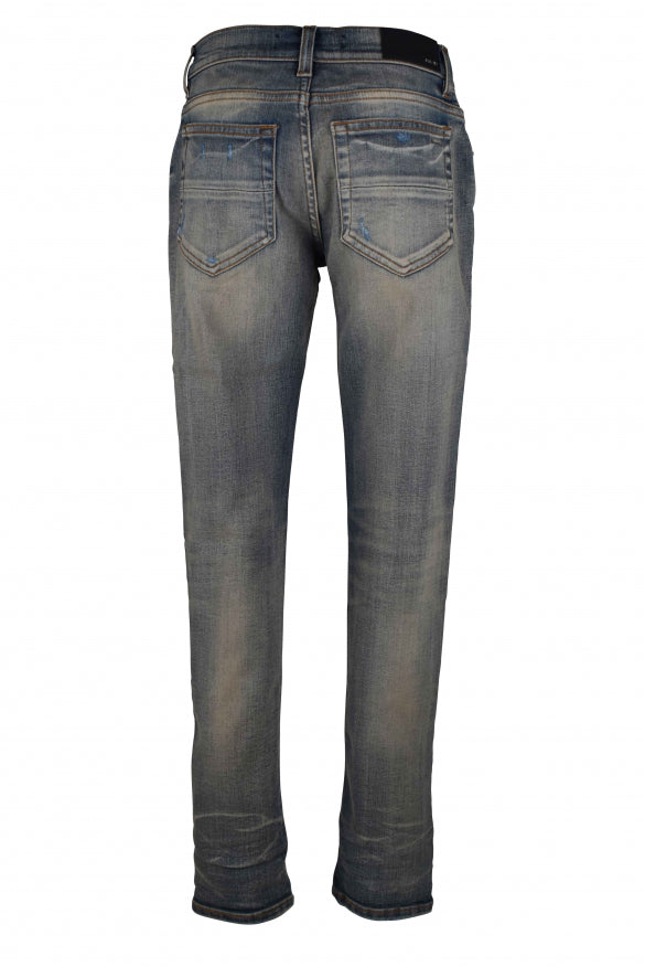LA rock ’n’ roll meets luxury craft—distressed denim, leather, and meticulous detailing by Mike Amiri since 2013.