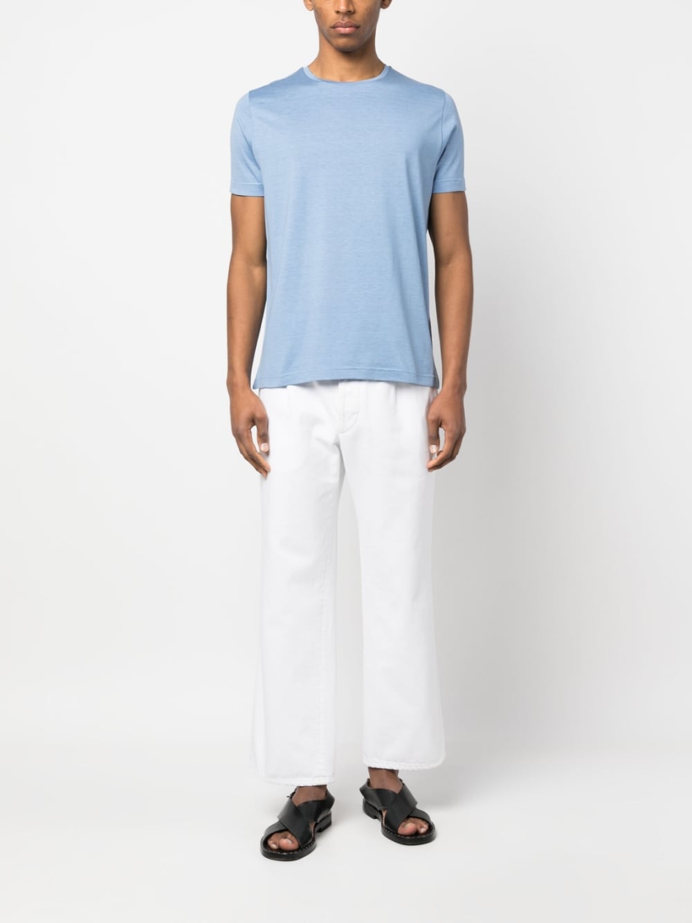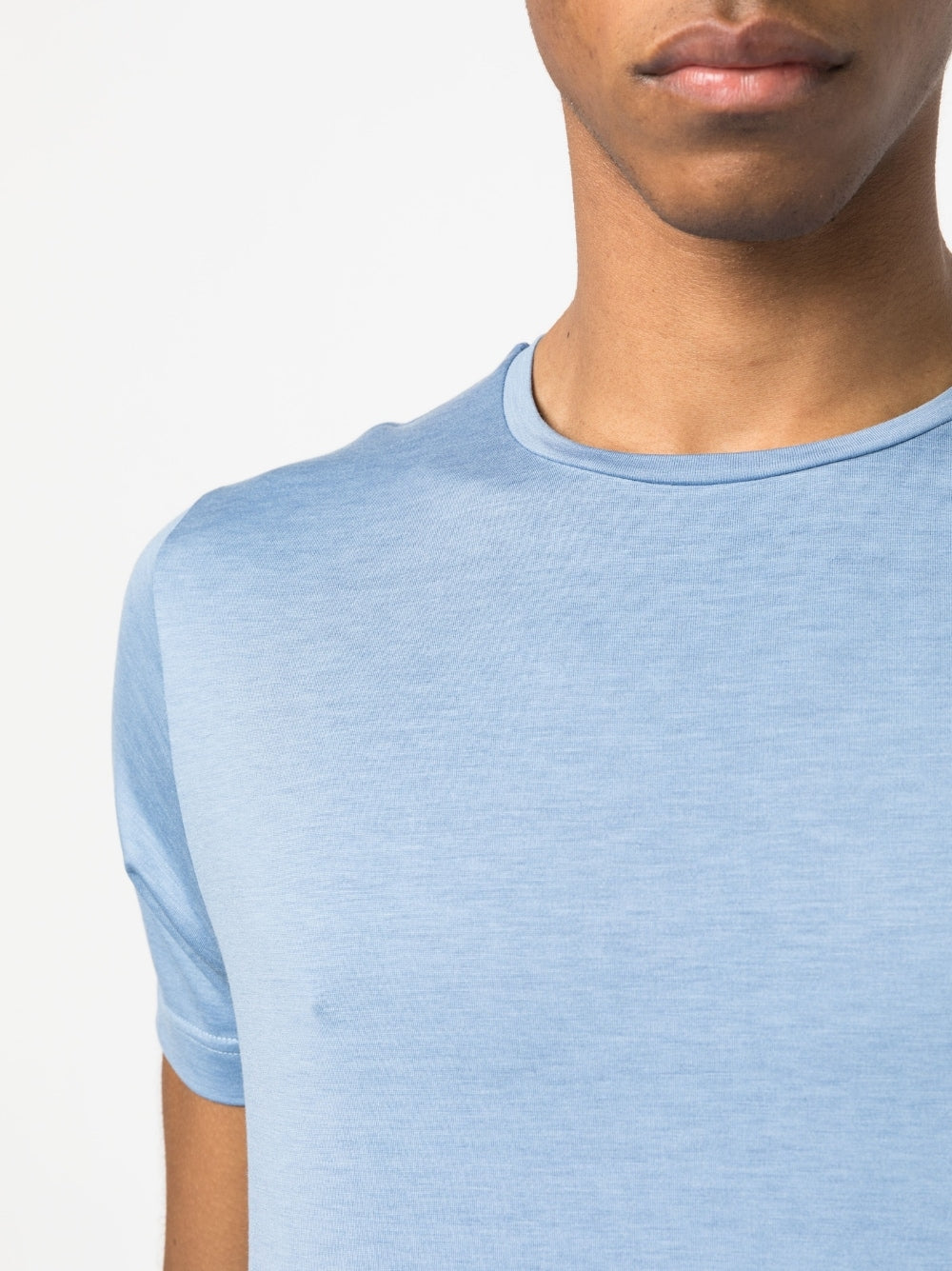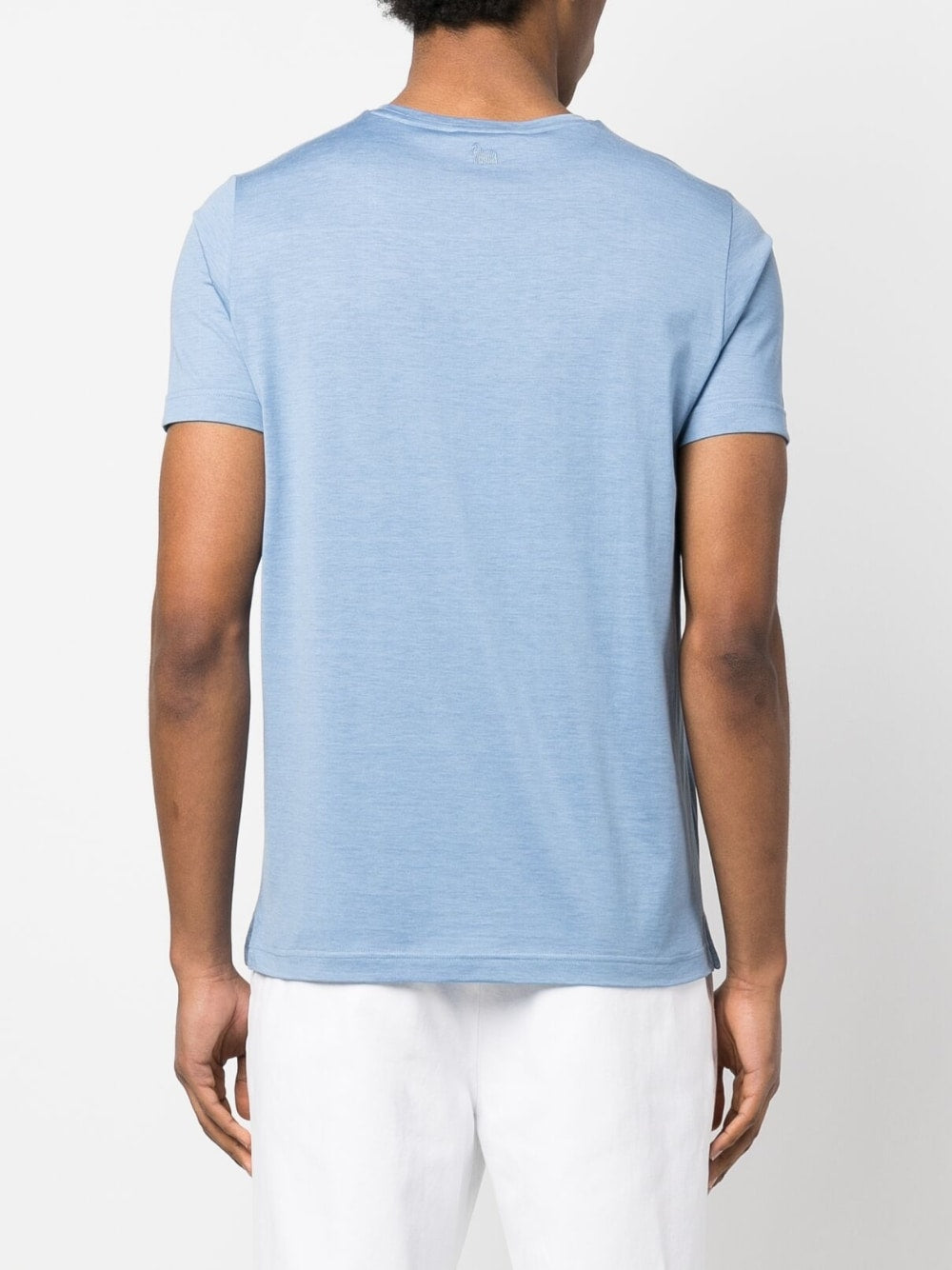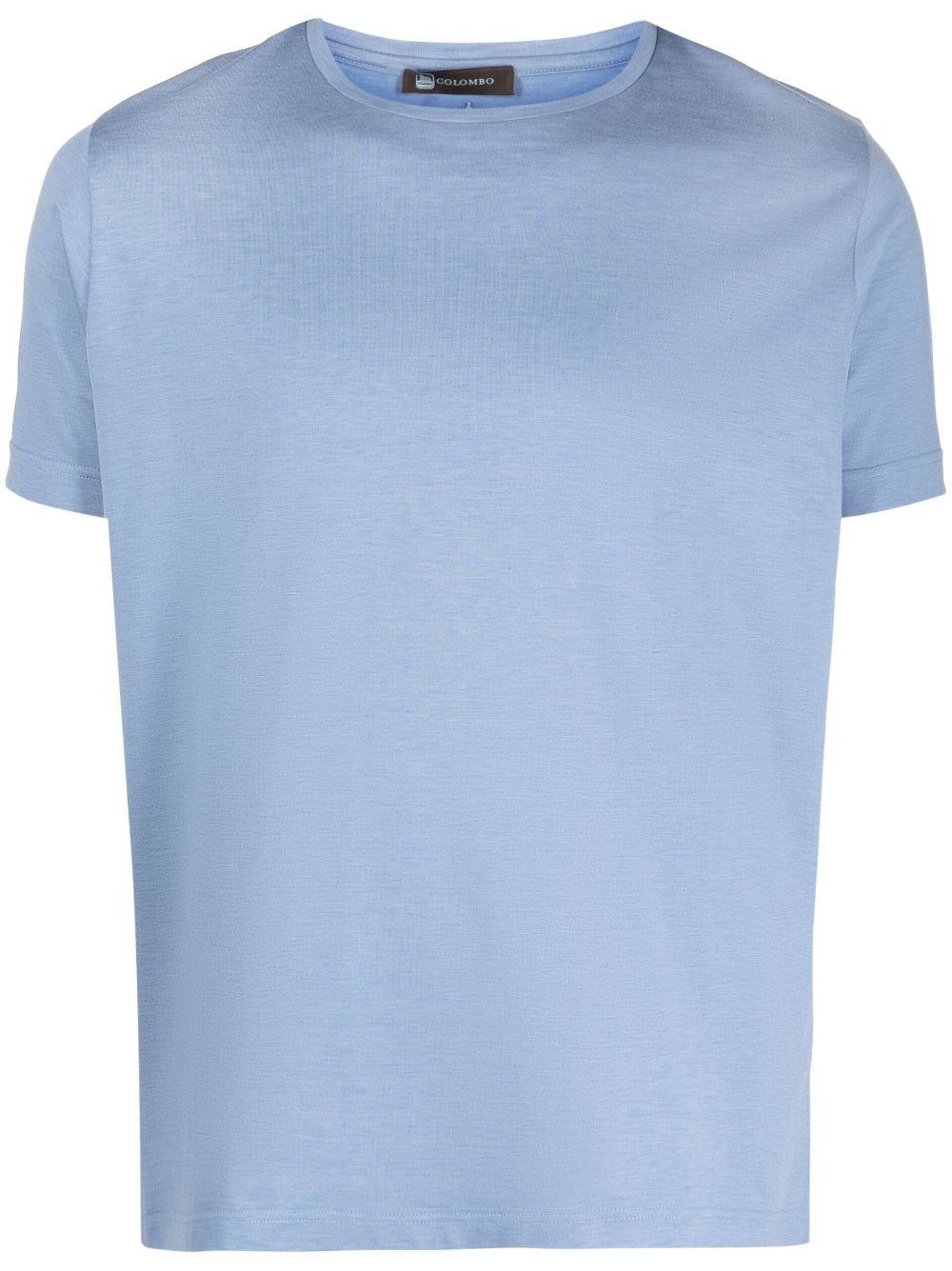 Camiseta de seda de Colombo con azul claro, mezcla de algodón y cañón, cuello de la tripulación, mangas cortas y dobladillo recto.