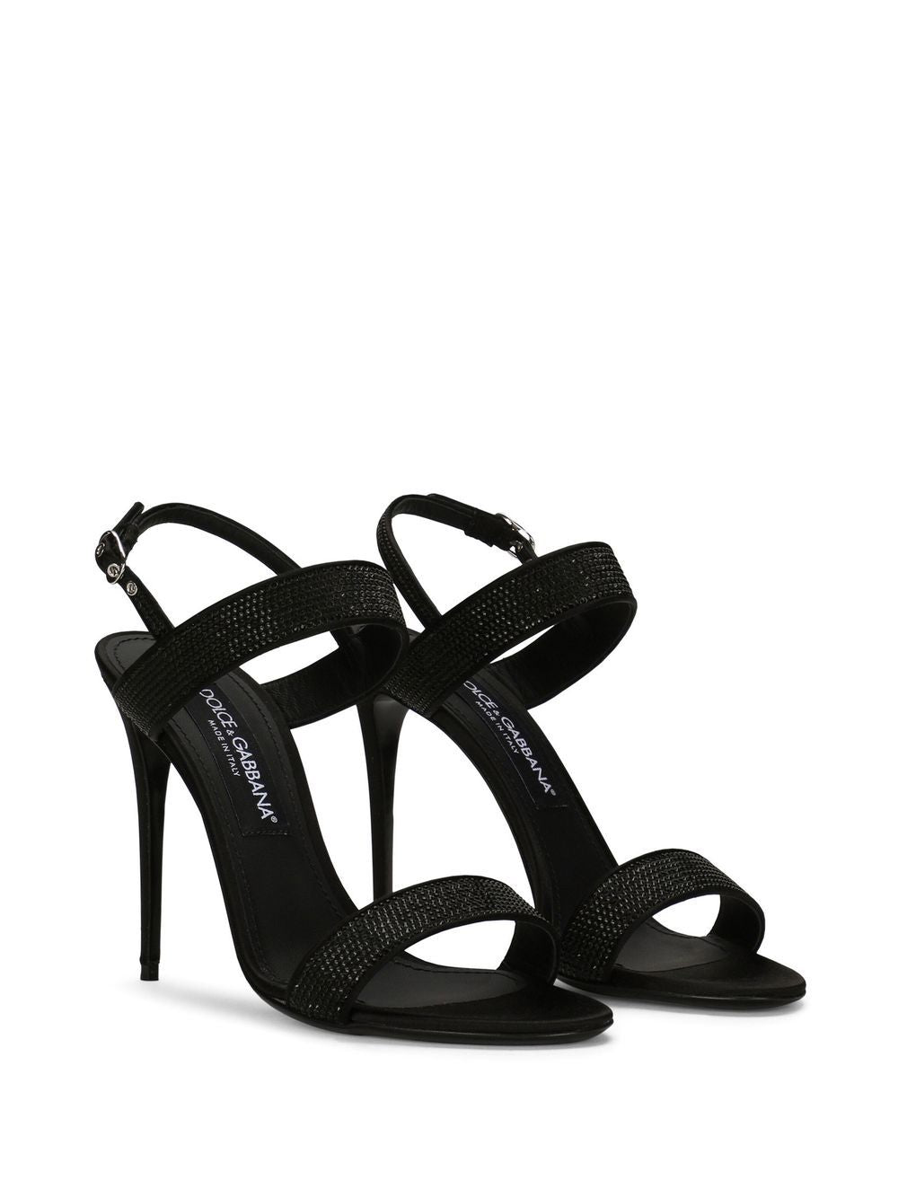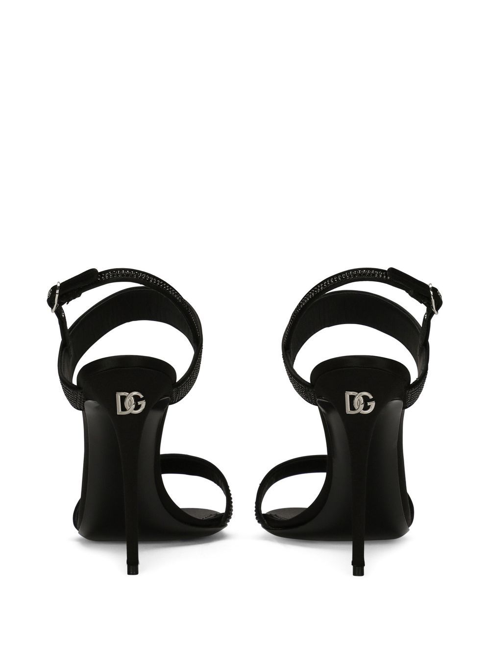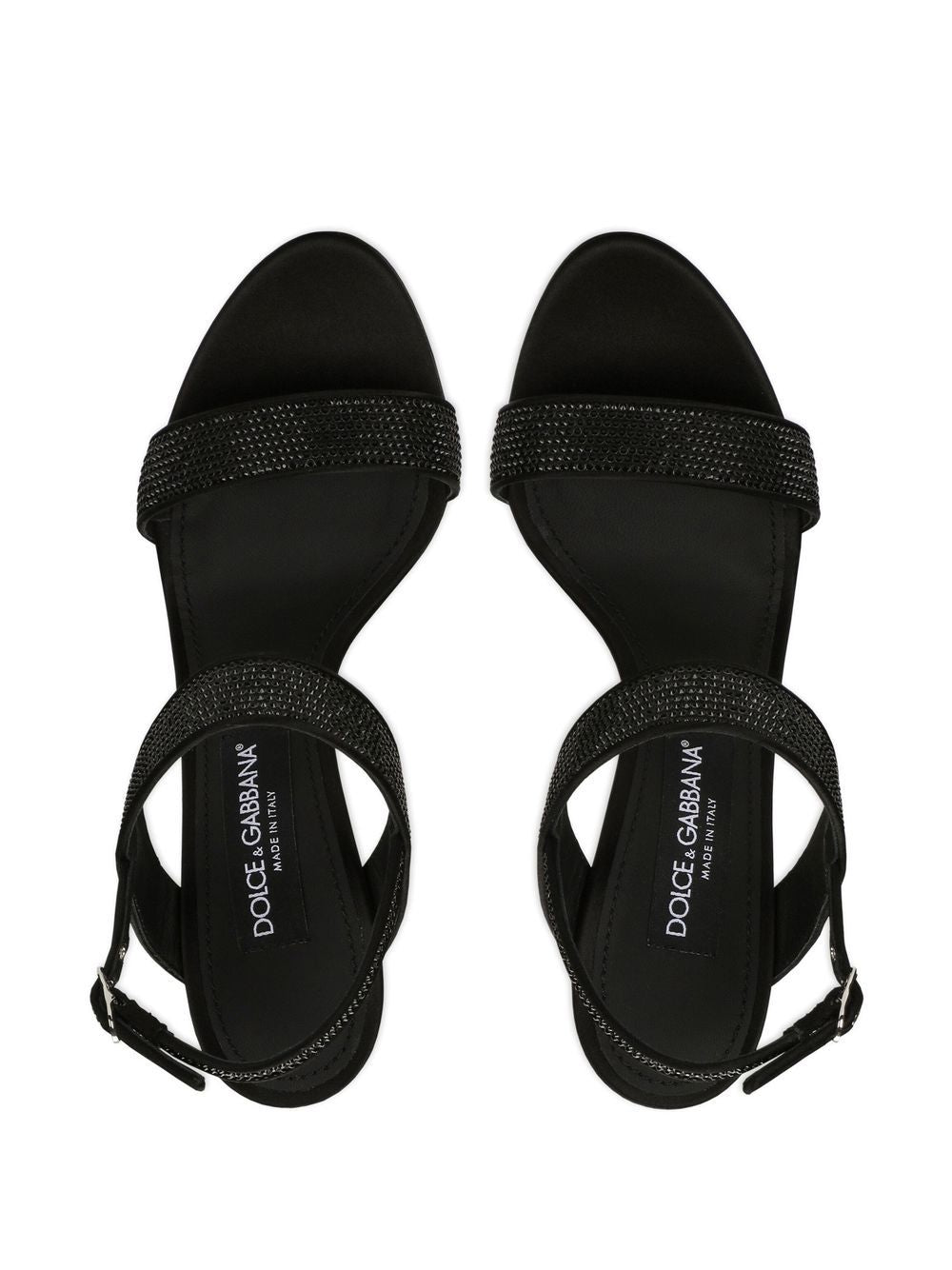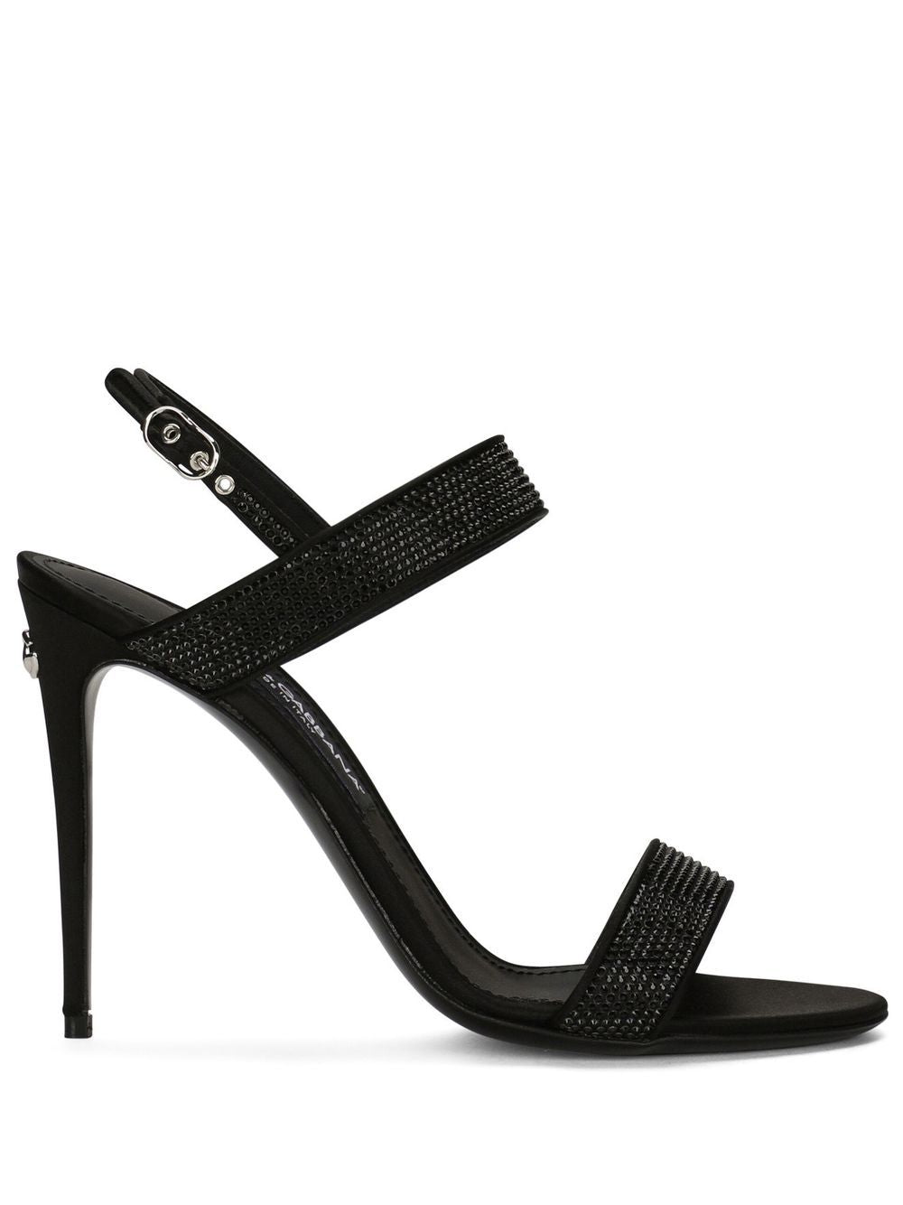 Sandalias de trineo con adornos de cristal de Dolce & Gabbana con adornos de cristal, correa de trineo, negro de seda/cabra, piel abierta, placa de marca y talón alto.