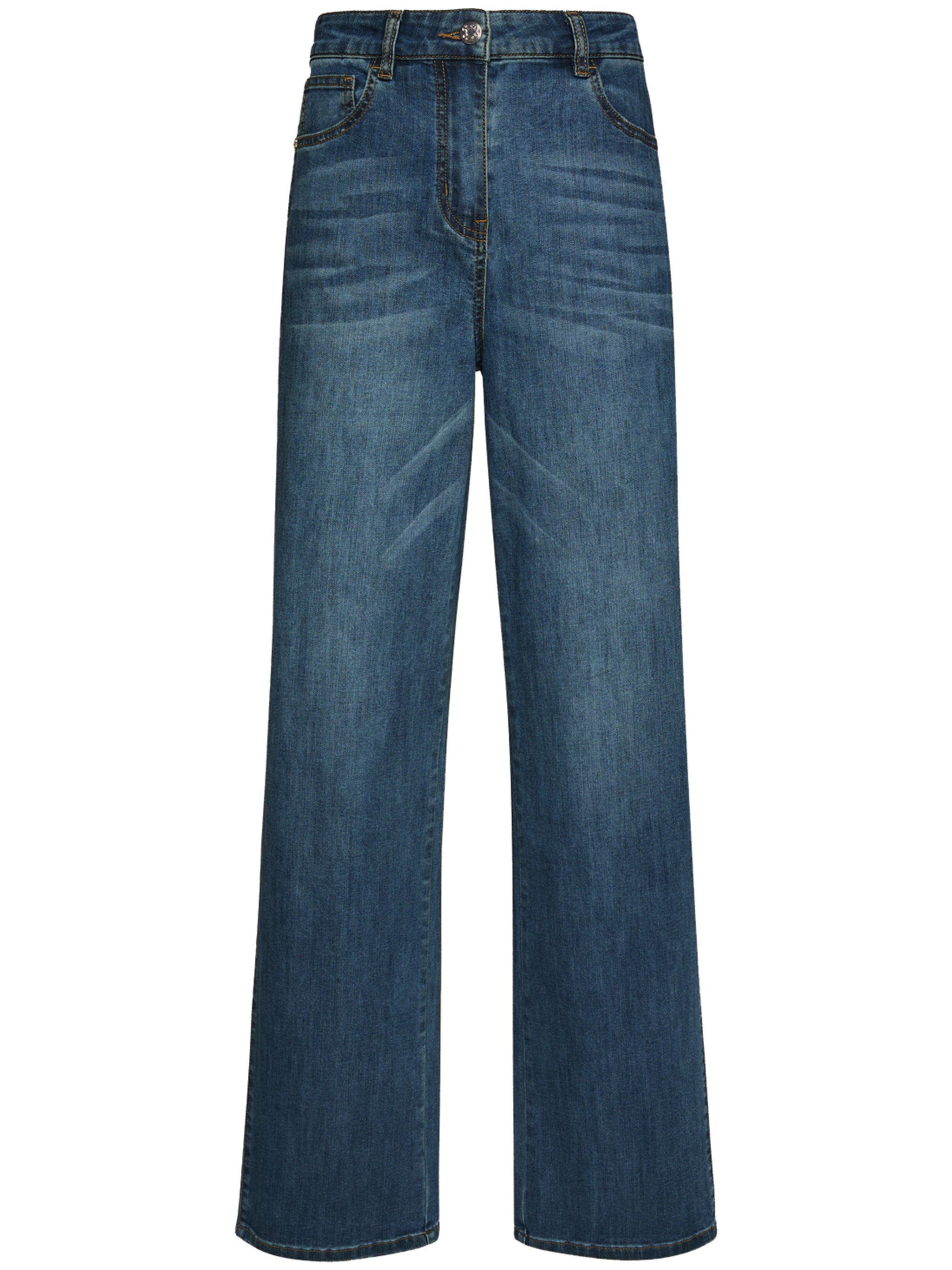 Jeans cinco bolsillos con diseño de pierna ancha, con pierna ancha y ligeramente acampanada. El tono azul medio, obtenido de una delicada piedra lavada y bigote, da un aspecto vintage. El corte lateral opina la silueta, mientras que el bordado de monograma a juego en el bolsillo trasero agrega un toque distintivo.