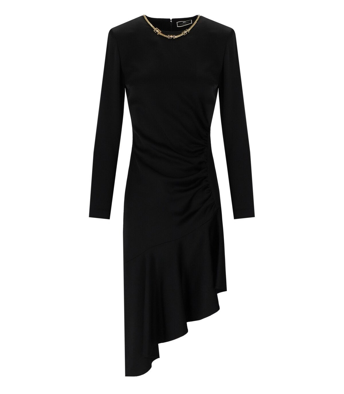 Vestido de Elisabetta franchi hecho de satén de crepe negro, con un corte asimétrico con volteo y detalles reunidos a un lado. Collar redondo adornado con un collar de metal dorado extraíble con logotipo, cierre de cremallera en la espalda y cremalleras invisibles en las mangas. Composición: 66% de acetato, 34% viscosa.