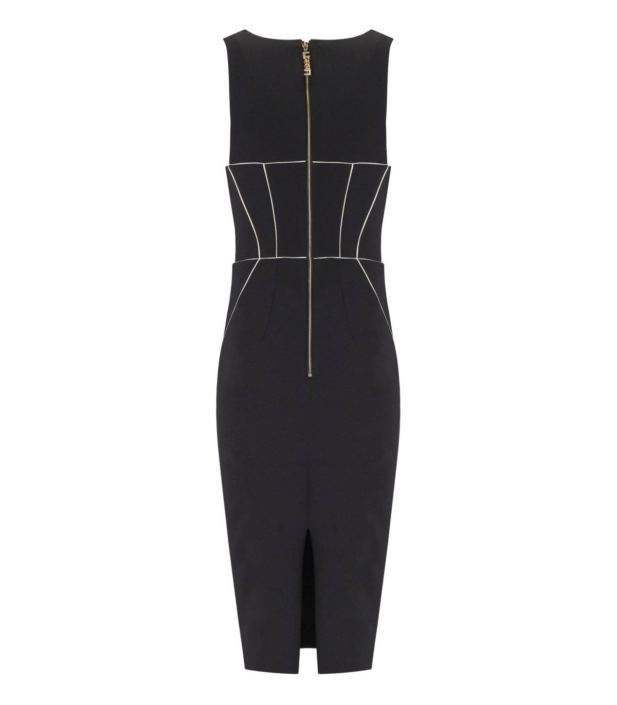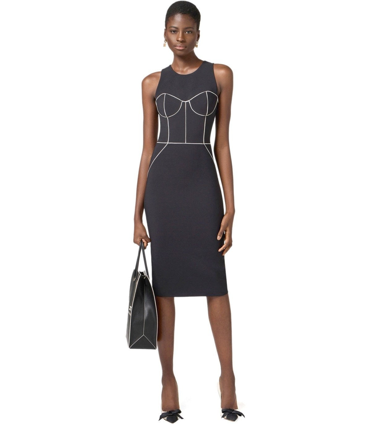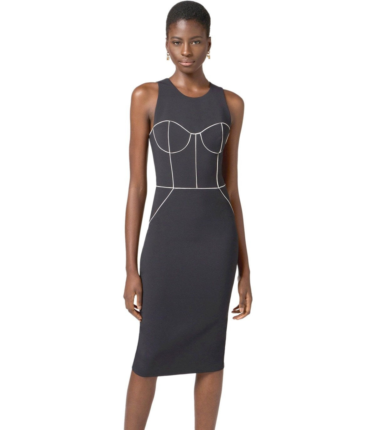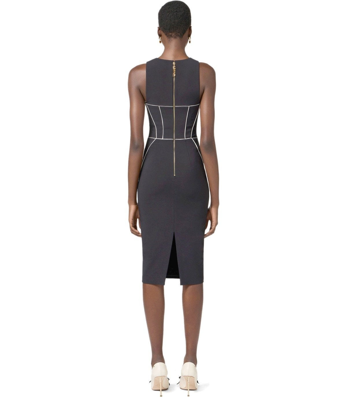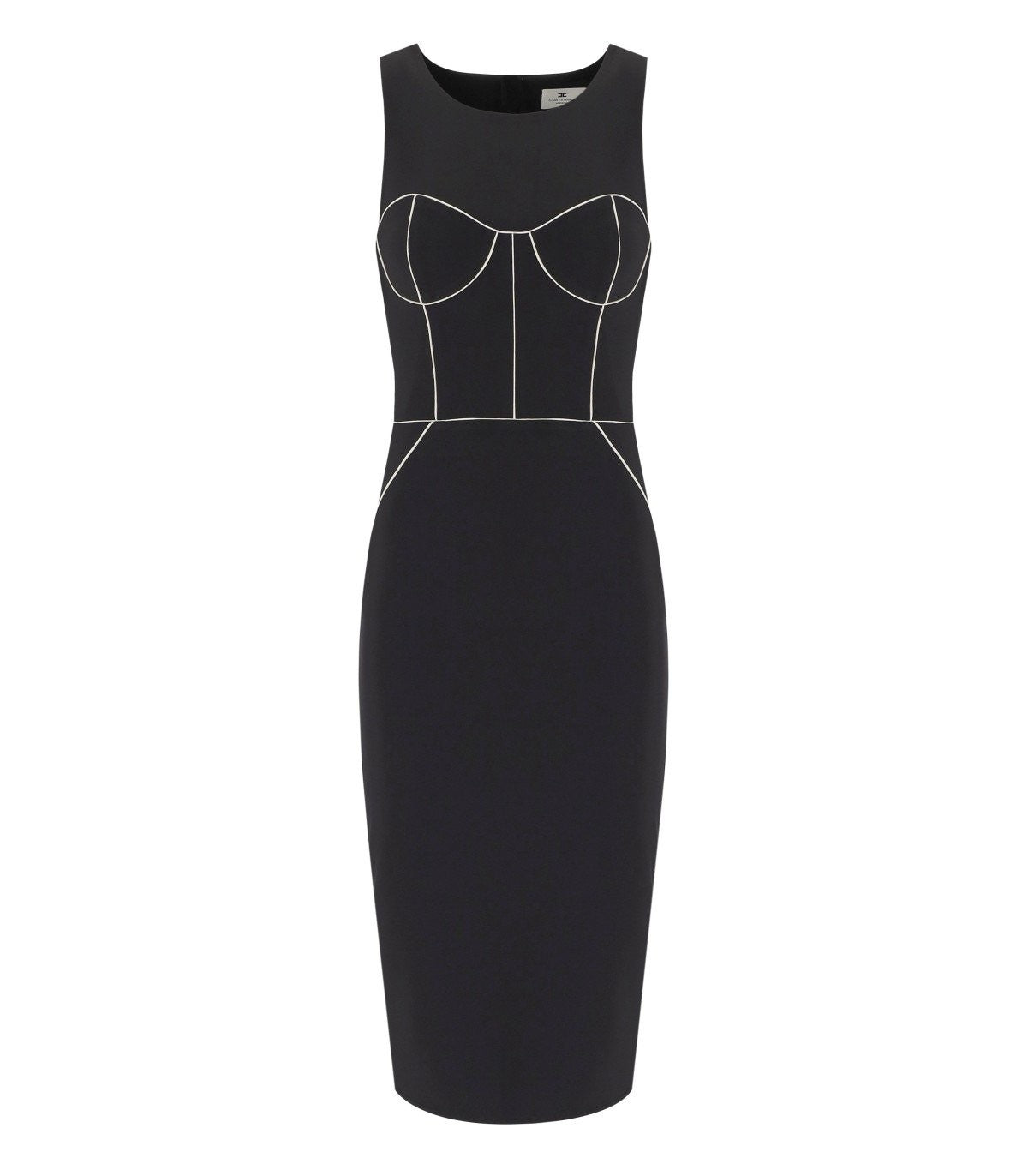 Vestido de vaina sin mangas de Elisabetta franchi hecho de crepé elástica en tonos en blanco y negro. Caracterizado por un estilo gráfico distintivo, presenta detalles de tuberías contrastantes que crean un efecto más bustiente con Trompe d'oeil. Terminado con una falda lápiz, tiene una hendidura en la parte posterior y hasta la rodilla. El cierre de la cremallera con un detalle logo en metal dorado. Forrado internamente en Monogram Satin. Fit delgado. Composición: 95% de poliéster, 5% de elastano.