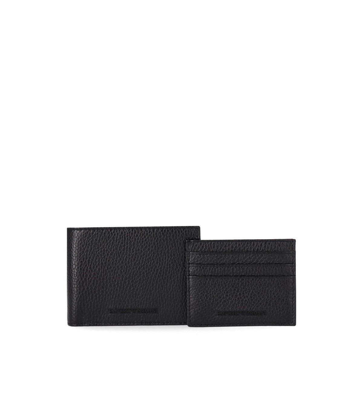 Emporio Armani Set que consta de billetera y soporte de tarjetas en cuero martillado negro, decorado con logotipo a juego. La billetera mide 12.5x8.5x2 cm, el soporte de la tarjeta mide 10x8 cm.