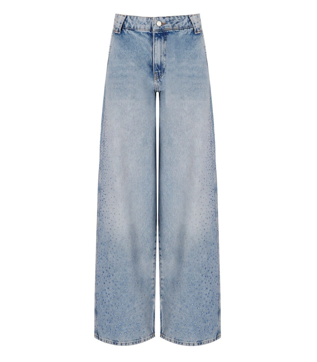 Essentiel Antwerp Hit Jeans hechos de mezclilla de algodón liviano en tonos azul claro. Con un cierre con una cremallera y un botón ocultos, tiene una cintura con bucles de cinturón. Equipado con bolsillos de aleta en la parte delantera y trasera, tiene una cintura alta y una pierna ancha adornada con diamantes de imitación a juego. Fit relajado. El modelo mide 170 cm de alto y usa tamaño S. Composición: 100% algodón. Diamantes de imitación: 100% de vidrio. Finamiento de bolsillo: 65% de poliéster, 35% de algodón.