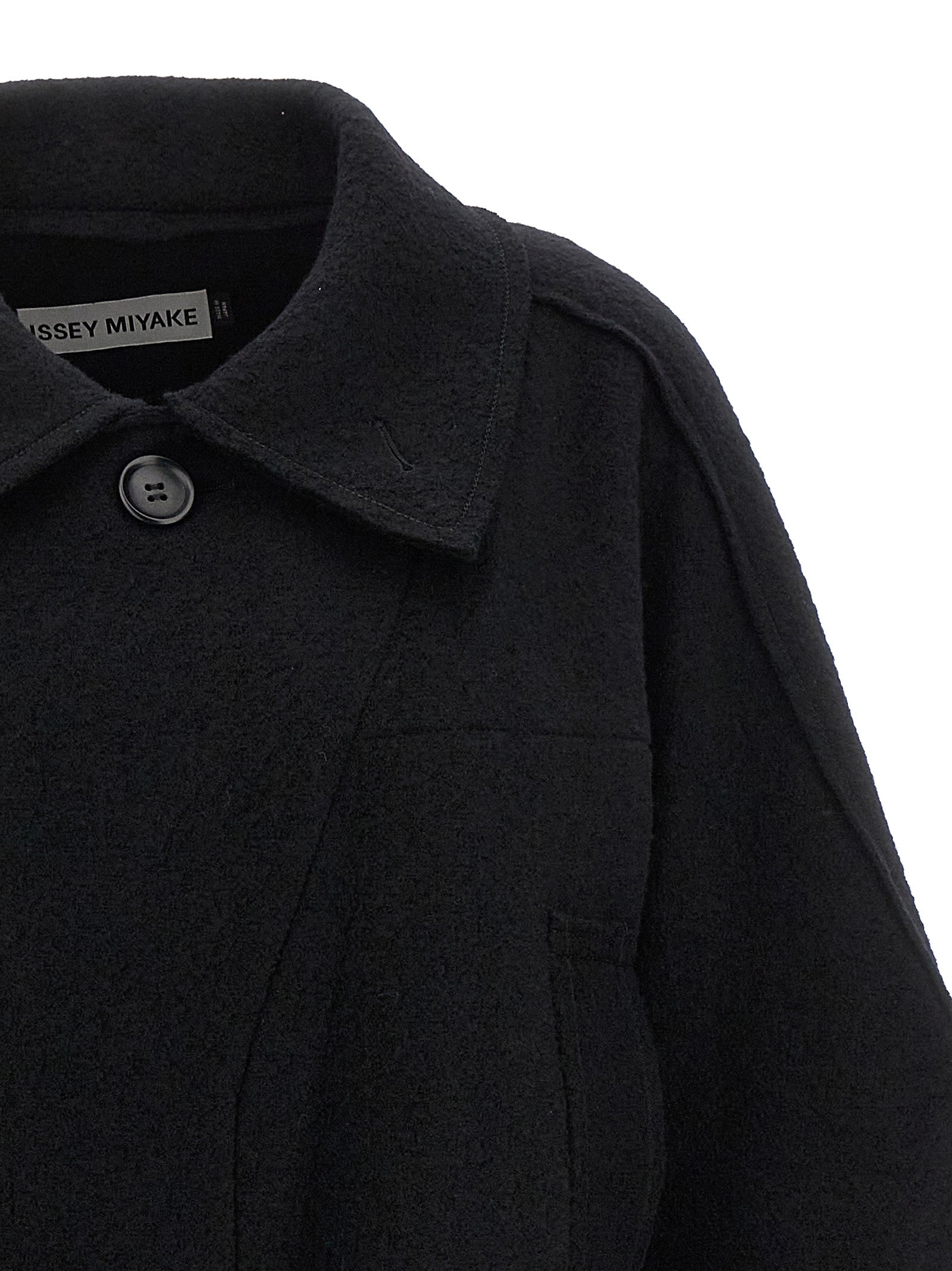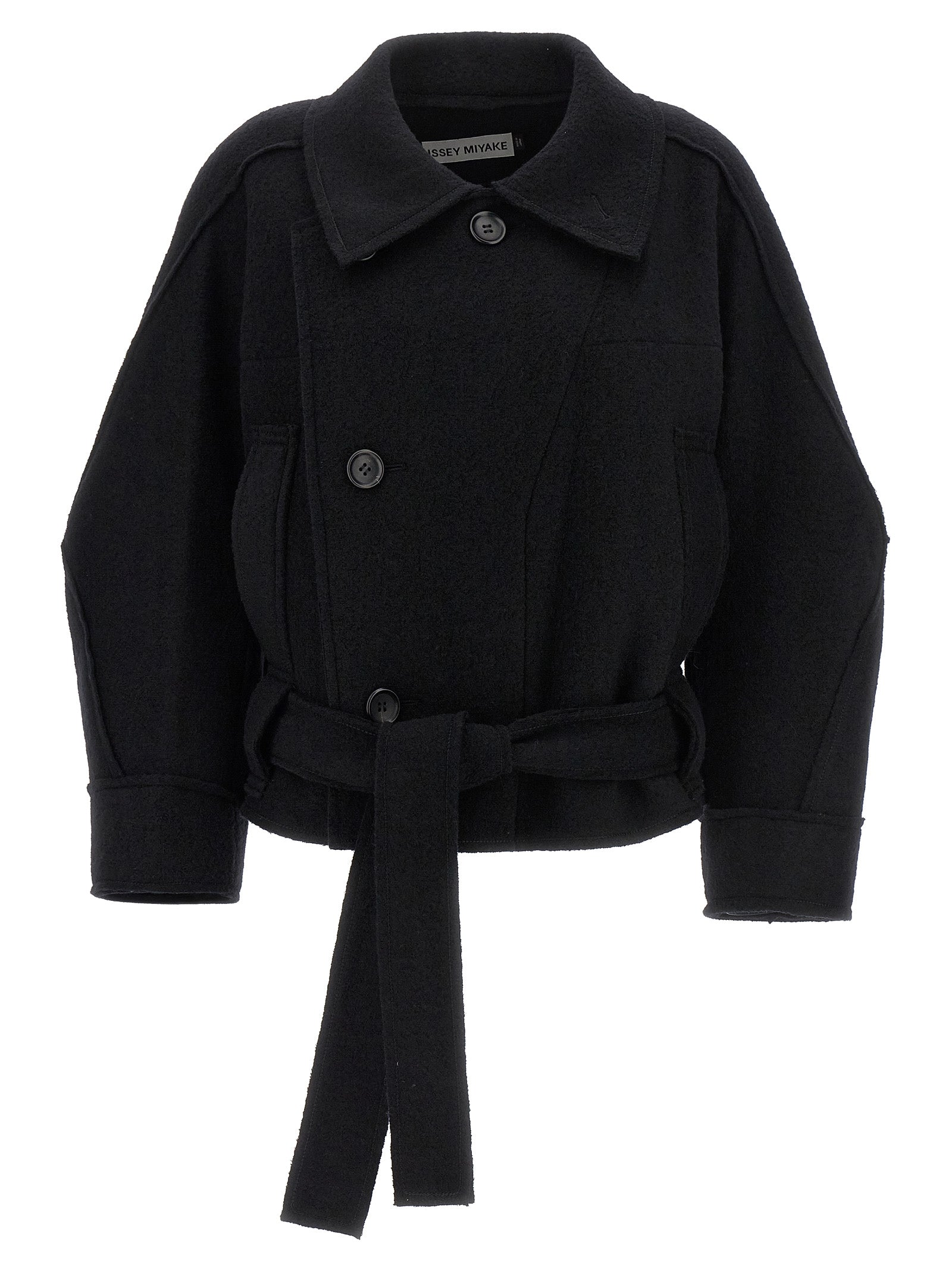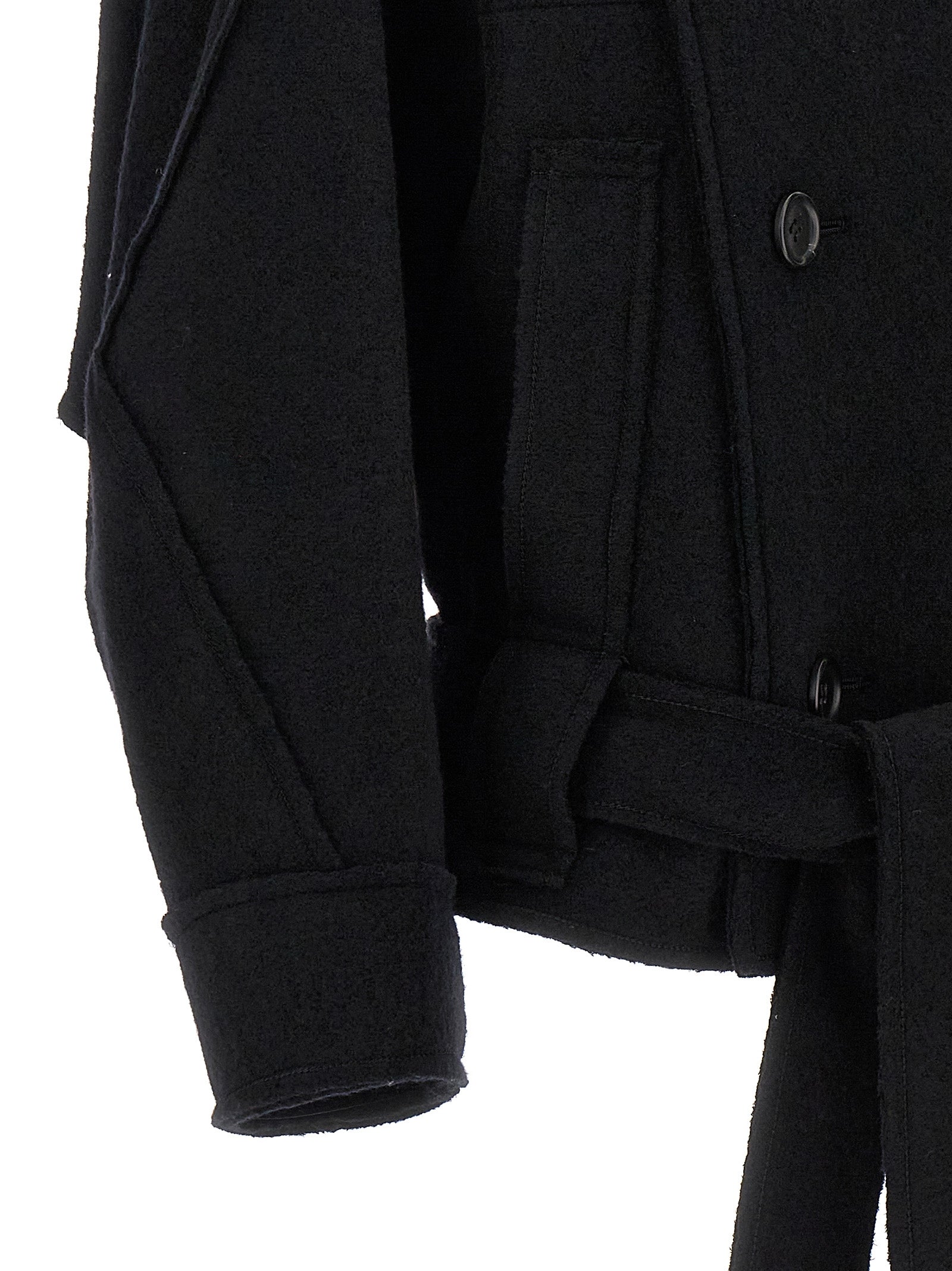 El abrigo de mezcla de lana corta 'fuera de un cubo' con cierre de botones y cinturón en la cintura, mangas largas.