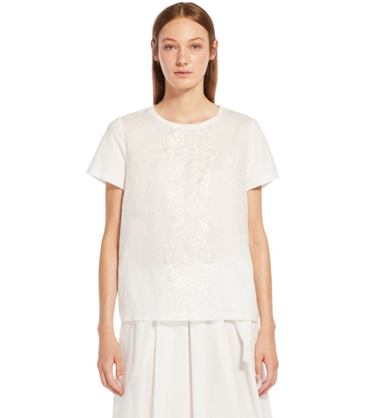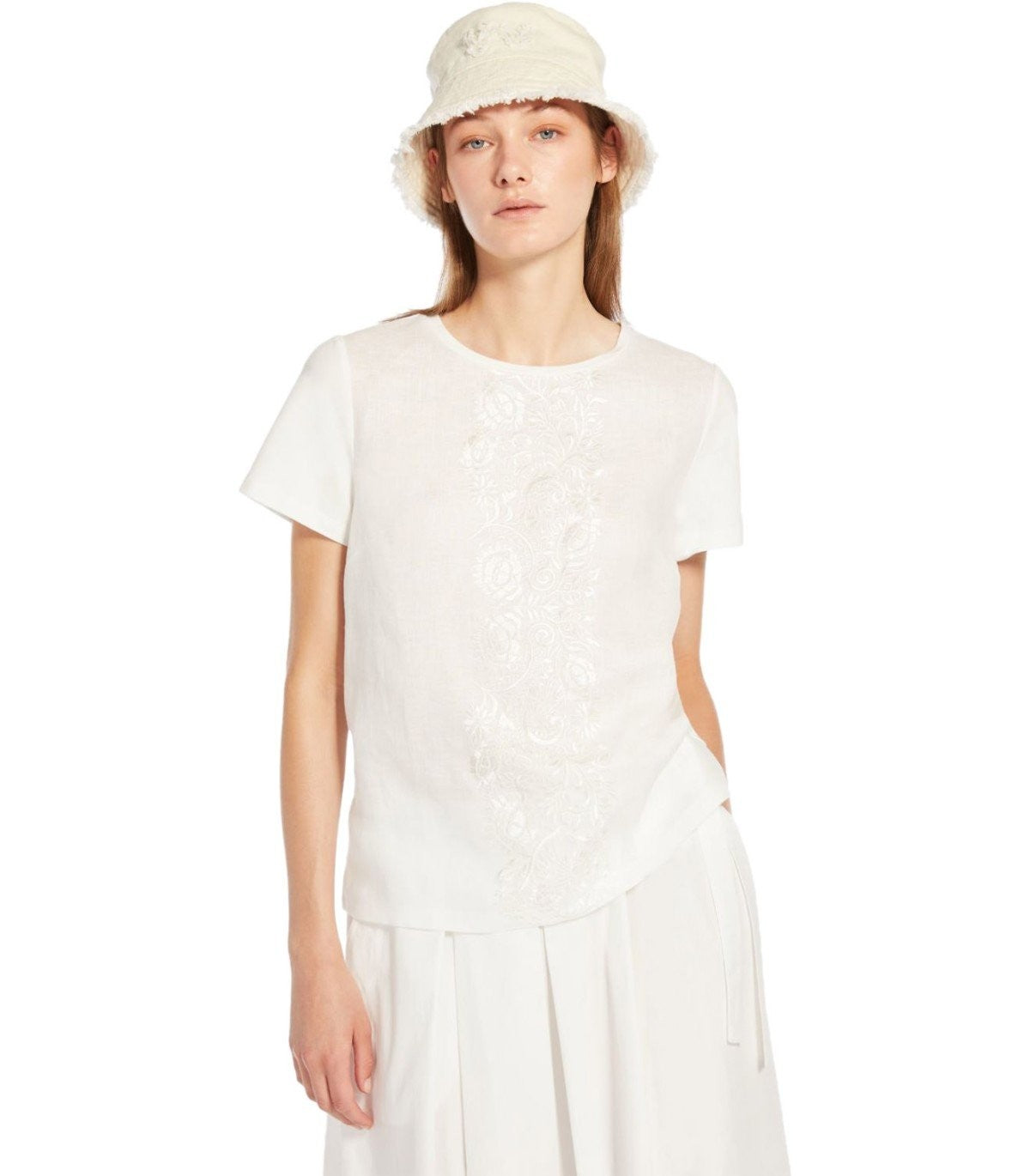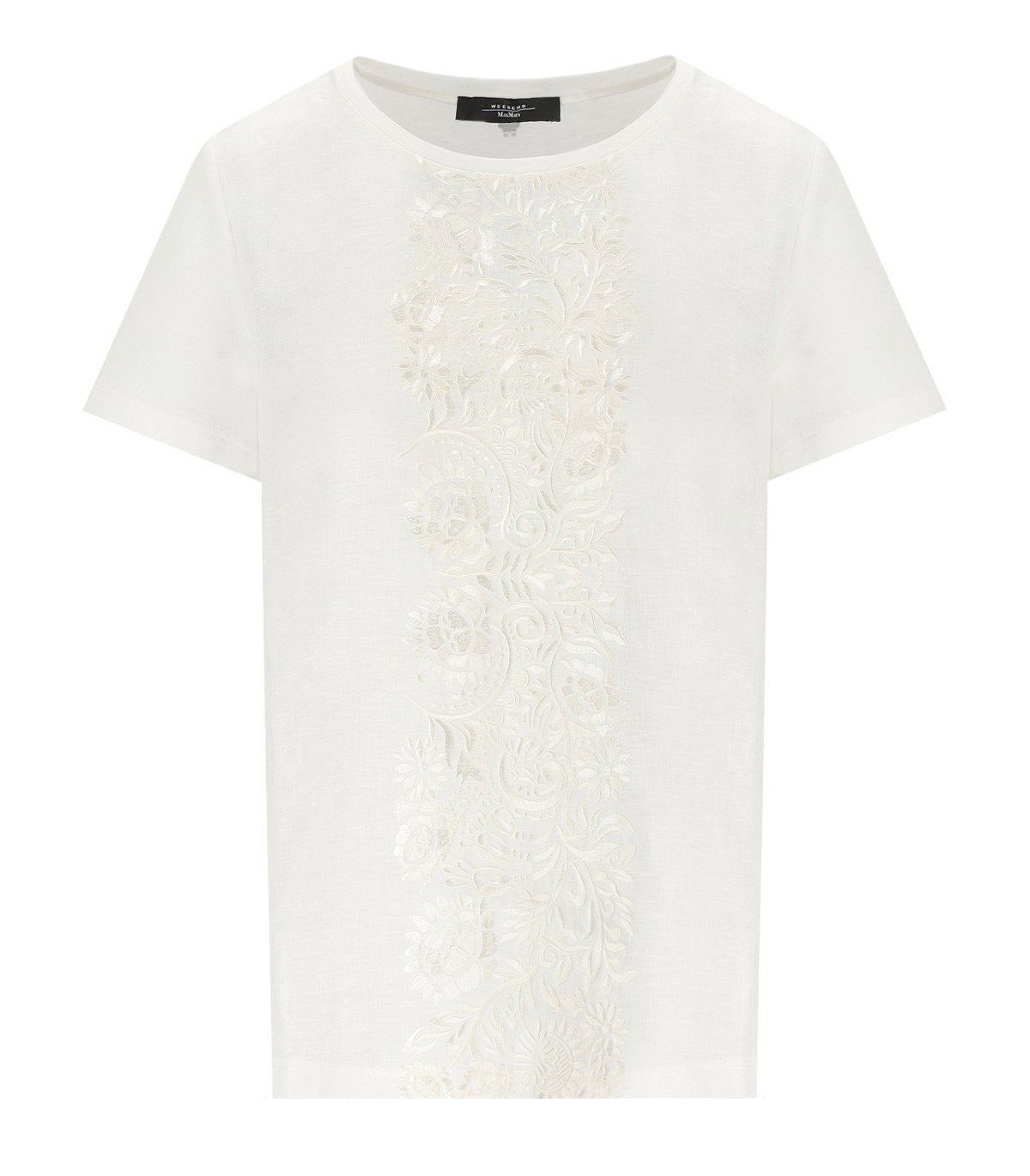 Camiseta Magno de Max Mara Weekend Hecha de camiseta de algodón blanco. Parte delantera en lienzo de lino con bordado tonal. Impresión del logotipo en la parte posterior del cuello. Ajuste suelto. Composición: 94% algodón, 6% elastano. Parte delantera: 100% de lino.