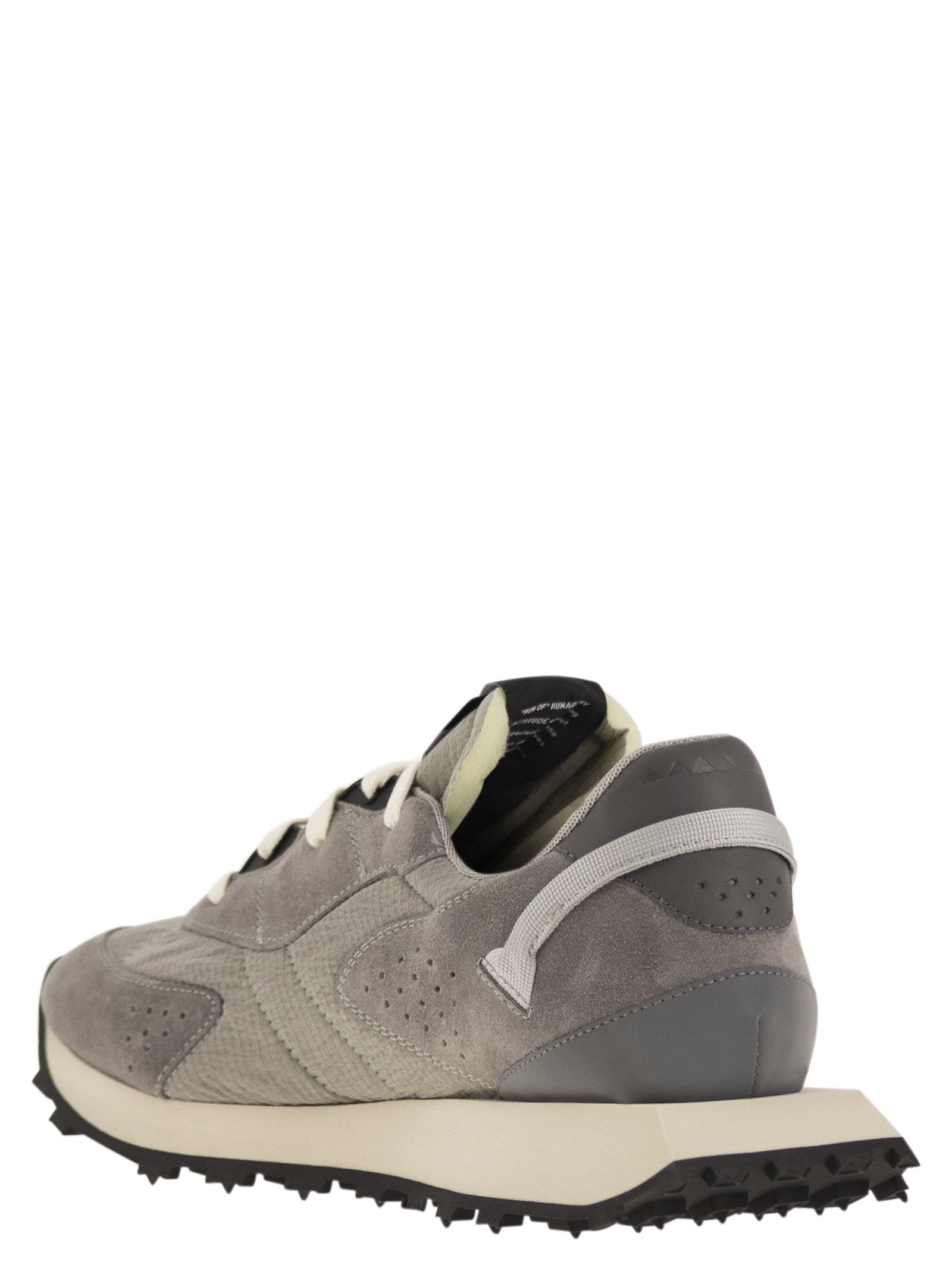 Hombres's gamuza, entrenadores de lona de algodón con pestaña del talón y color contrastante, forro de cuero y algodón y respaldo de goma micro inyectado. - Hecho a mano en Italia - Memory Gel y cuero Fussbet - Lengua de espuma de estilo vintage - Capios de algodón ID de diseñador: oxígeno M 40282 cemento