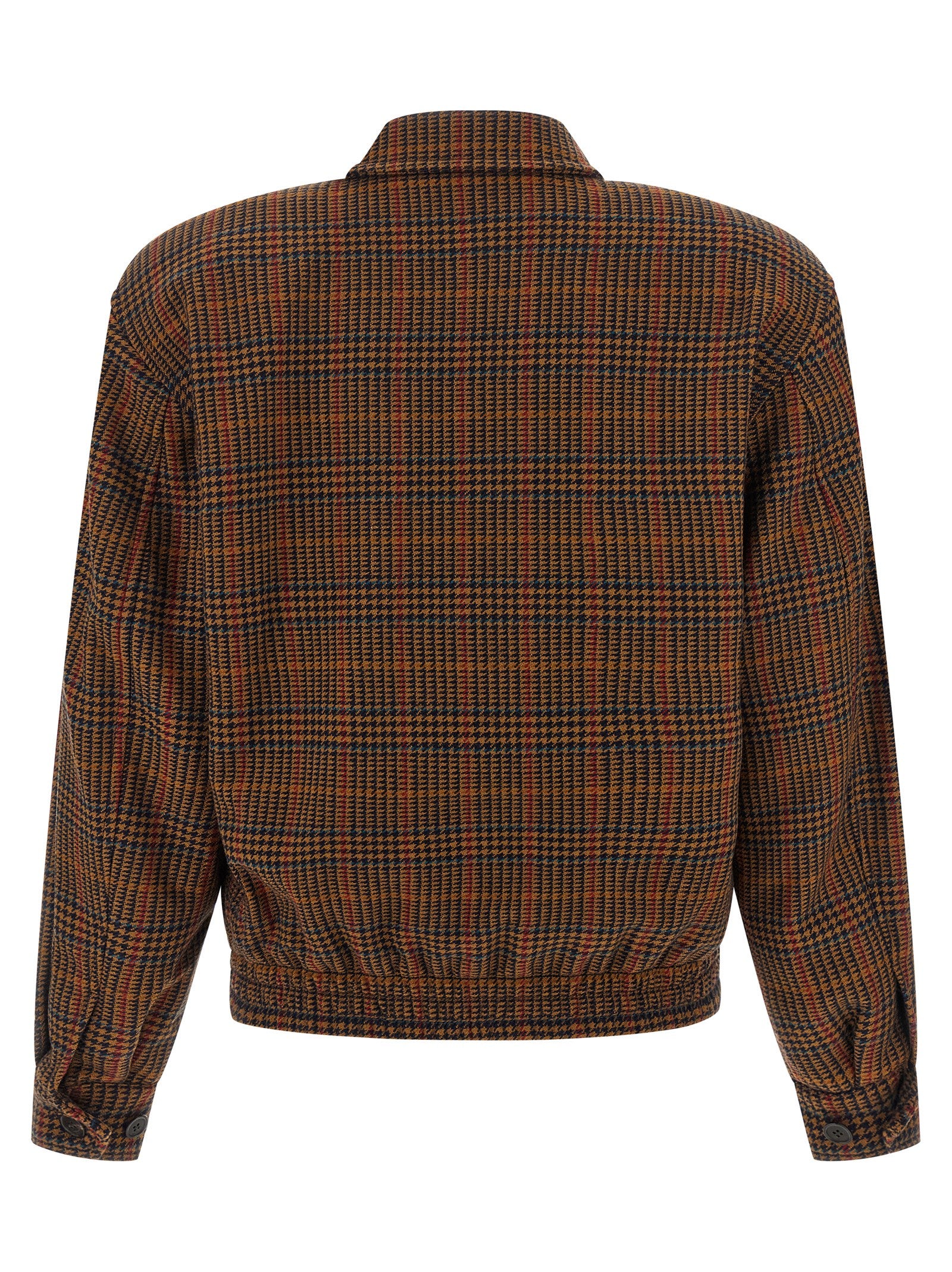 Cazadora bomber de lana, cuello camisero, hombros acolchados, cierre de cremallera, bajo elástico, manga larga con puño ajustable con botón.
