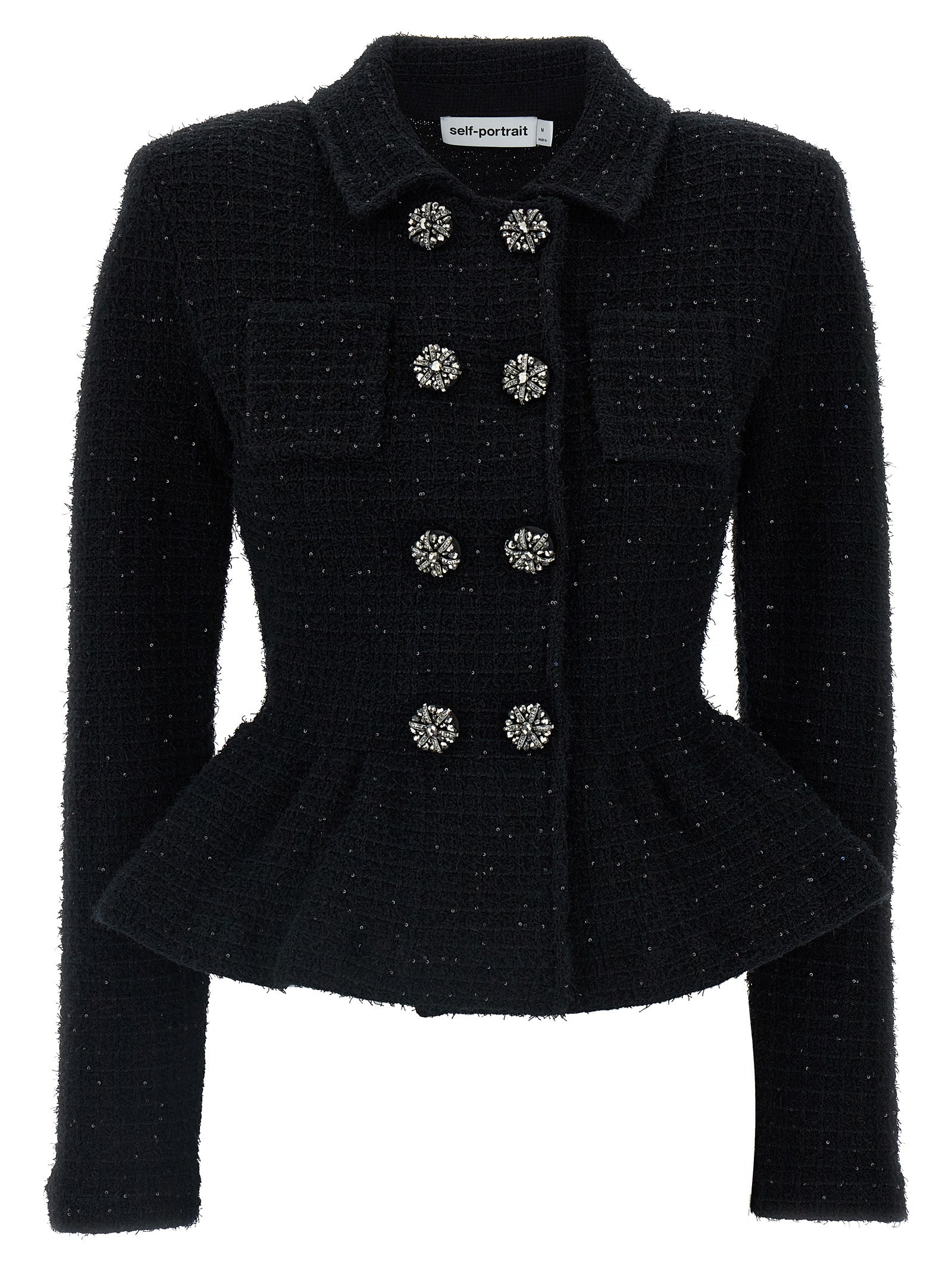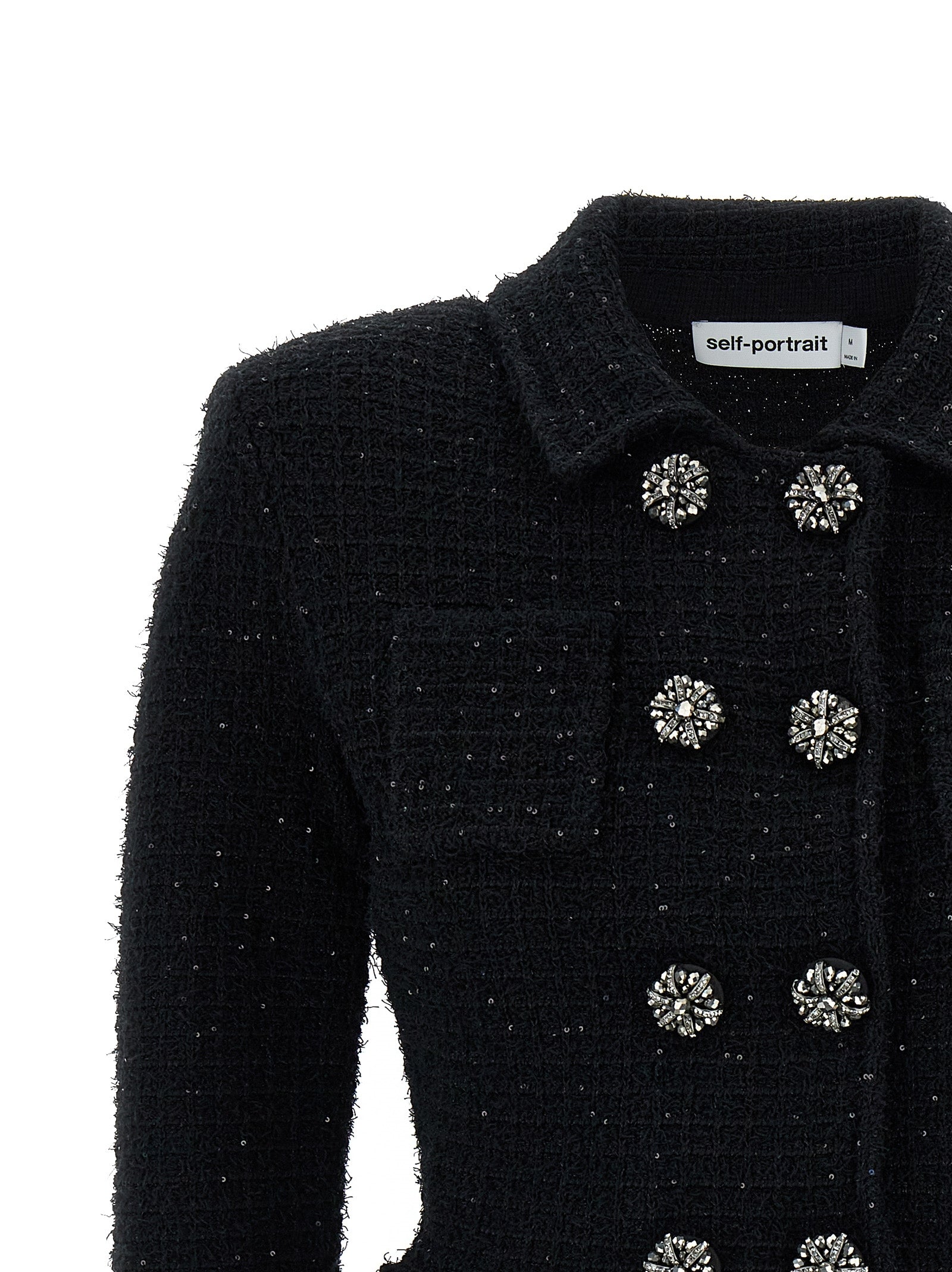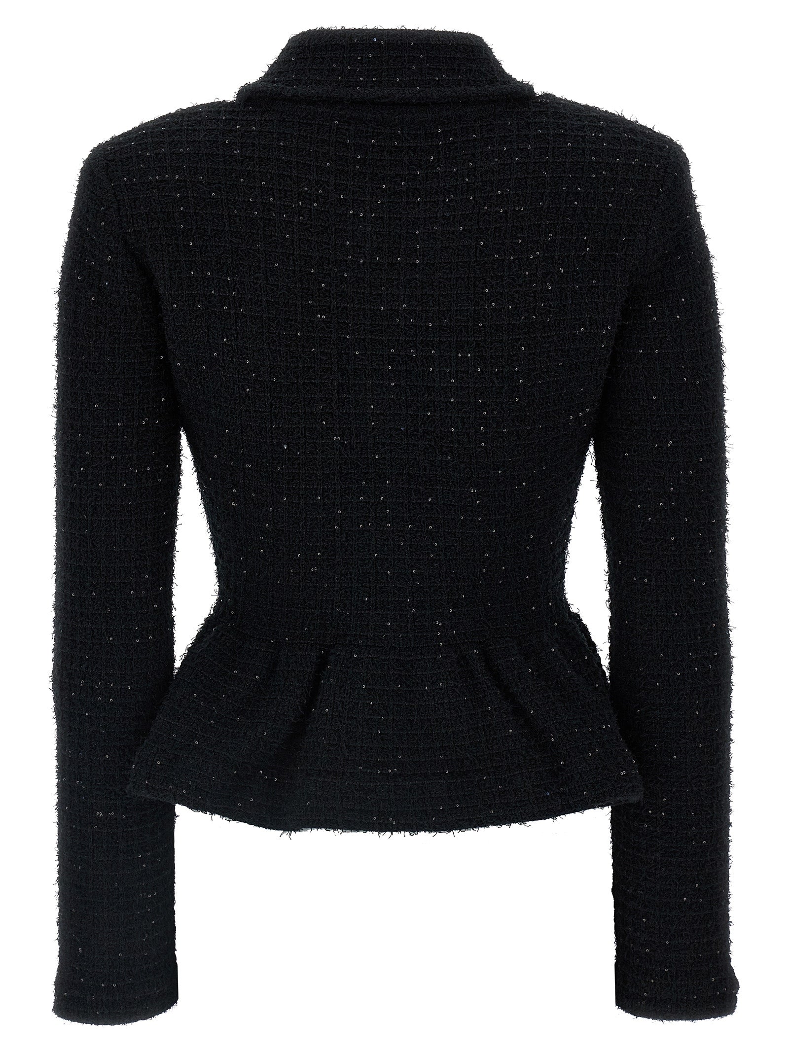La chaqueta de tweed de punto de punto de textura negra con aplicación de lentejuelas, cierre de botones de doble pecho, aplicación de botón de joya delantera, bolsillos, mangas largas y volantes en el dobladillo.