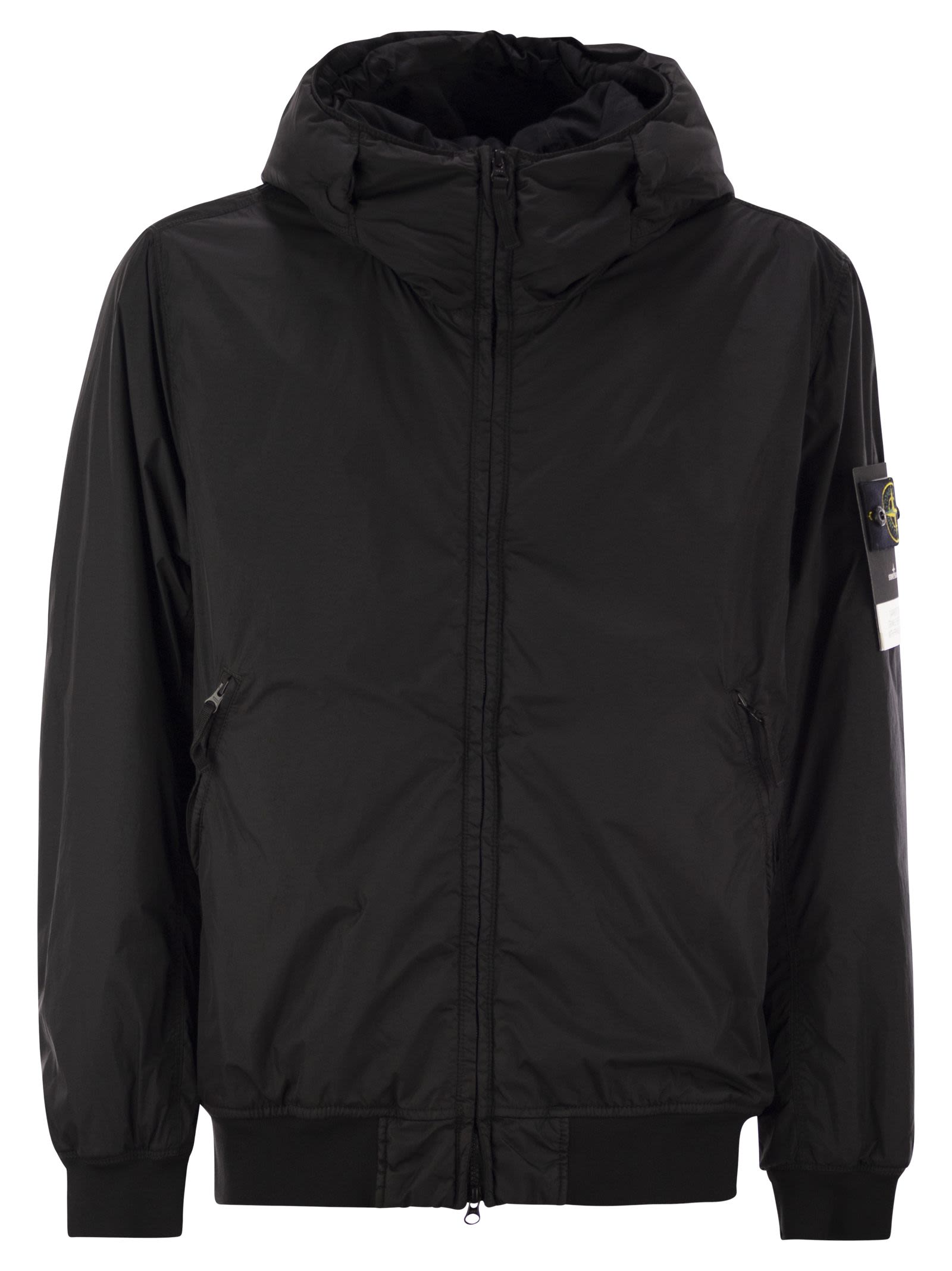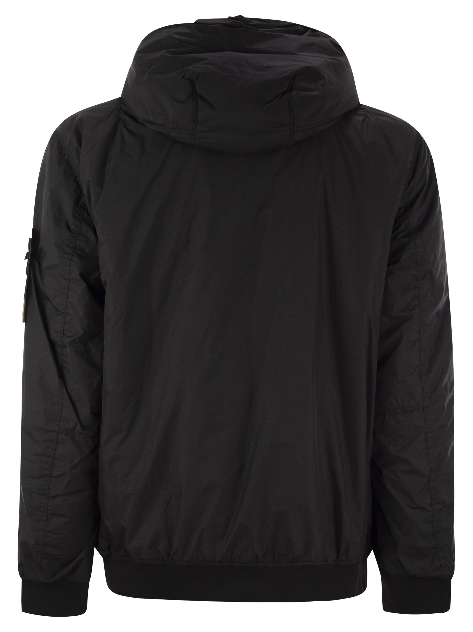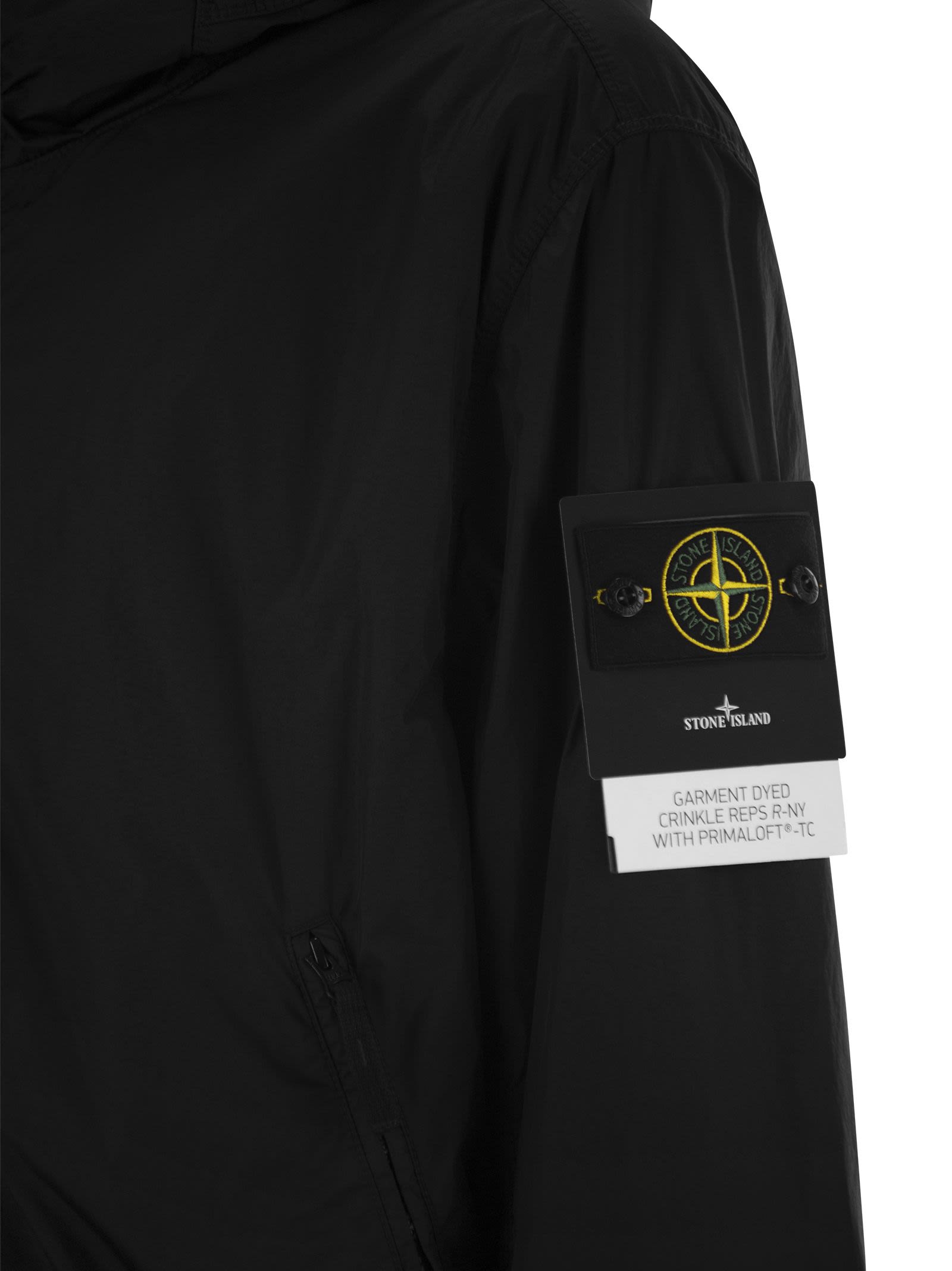 Blausón con capucha hecho de repeticiones de nylon livianas 100% recicladas con una construcción de tejido de ultra narración. El recubrimiento de resina en el lado interno lo hace a prueba de viento y parcialmente repelente al agua. La prenda está acolchada con una capa de Primaloft®-TC, una combinación exclusiva de 70% de fibras de aislamiento recicladas, diseñadas junto con Stone Island para soportar las altas temperaturas de los procedimientos de teñido sin comprometer la tela o sus propiedades de aislamiento. Como el material está recubierto de resina, el tinte penetra de manera desigual en la tela, dando una apariencia ondulada a la superficie. La adición de un agente especial libre de PFC a la fórmula de tinte hace que la prenda anti-drip. - capucha con cordero - bolsillos inclinados con fijación de cremallera oculta - Insignia de isla de piedra en la manga izquierda - puños acanalados y banda de dobladillo - ID de diseñador de cierre de dos vías: 811540823 V0029