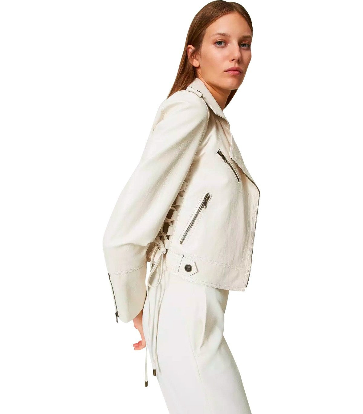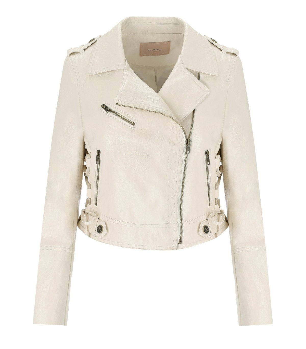 Chaqueta de motociclistas de Twinset en tonos blancos, con un efecto Nappa y detalles del corsé en los lados. Interior forrado, bolsillos en la parte delantera y cierre de cremallera. Ajustado. El modelo mide 178 cm de alto y usa tamaño 40IT. Composición: 75% viscosa, 14% poliéster, 7% de algodón, 4% de metal.
