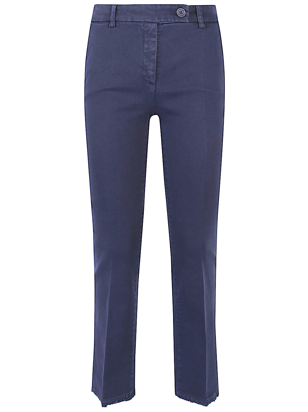 Jeans de pierna recta con dobladillo caído, dos bolsillos delanteros, dos bolsillos traseros y cierre de cremallera y botón.