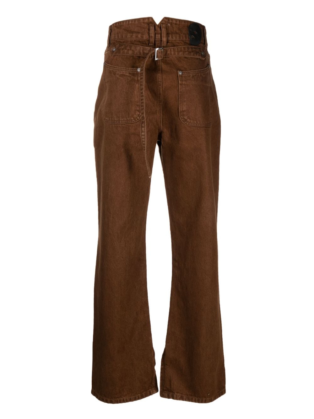high-rise straight-leg trousers from Youths In Balaclava featuring cedar brown, cotton, denim, logo patch to the rear, embroidered design, high waist, belt loops, front button and zip fastening and classic five pockets.