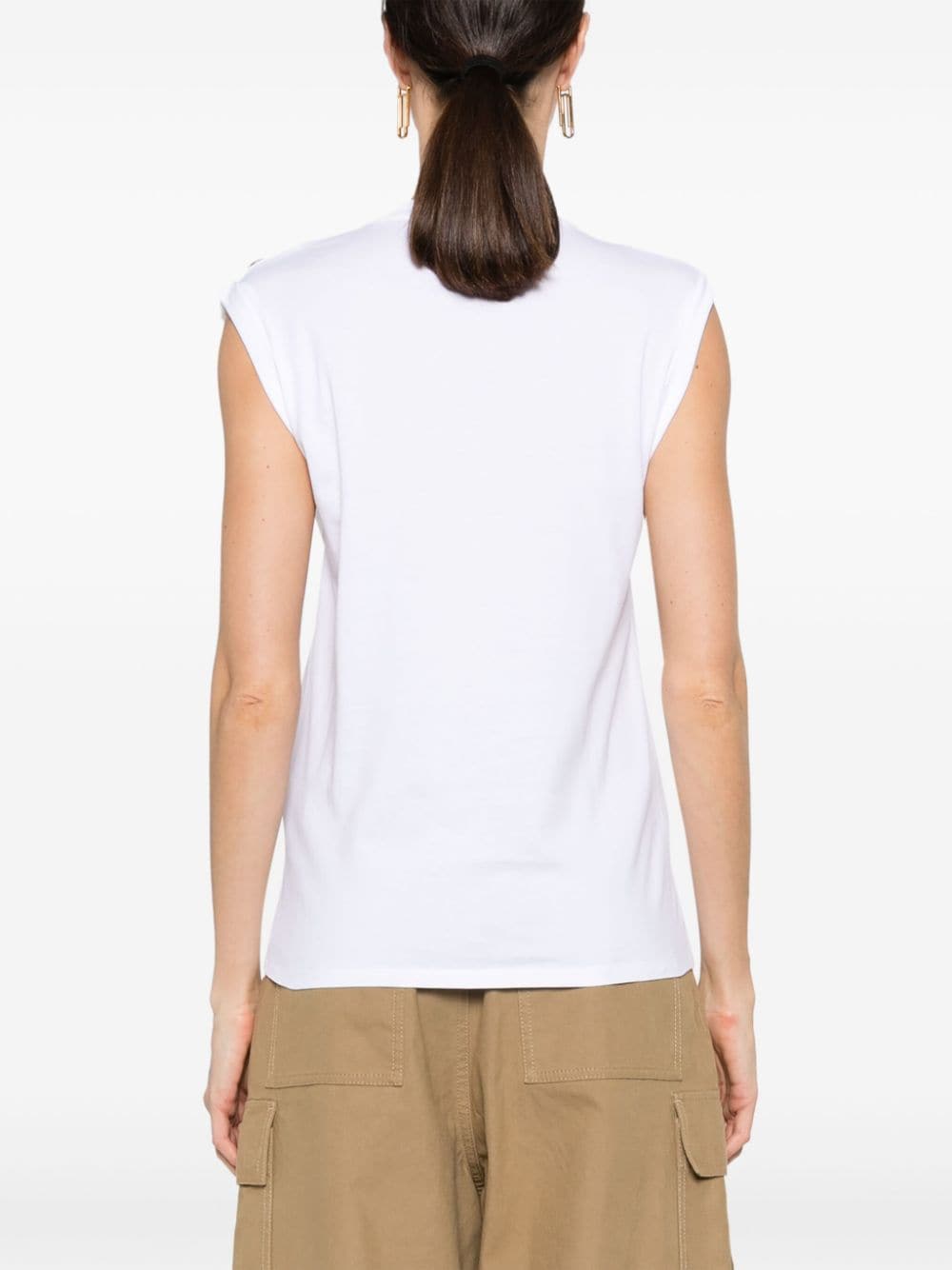 Logotipo de algodón blanco óptico Impresión al botón frontal sujetar en el hombro cuello redondo sin mangas recta