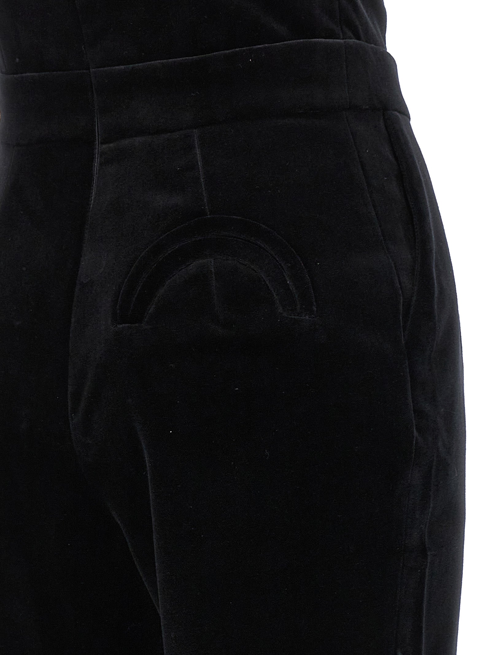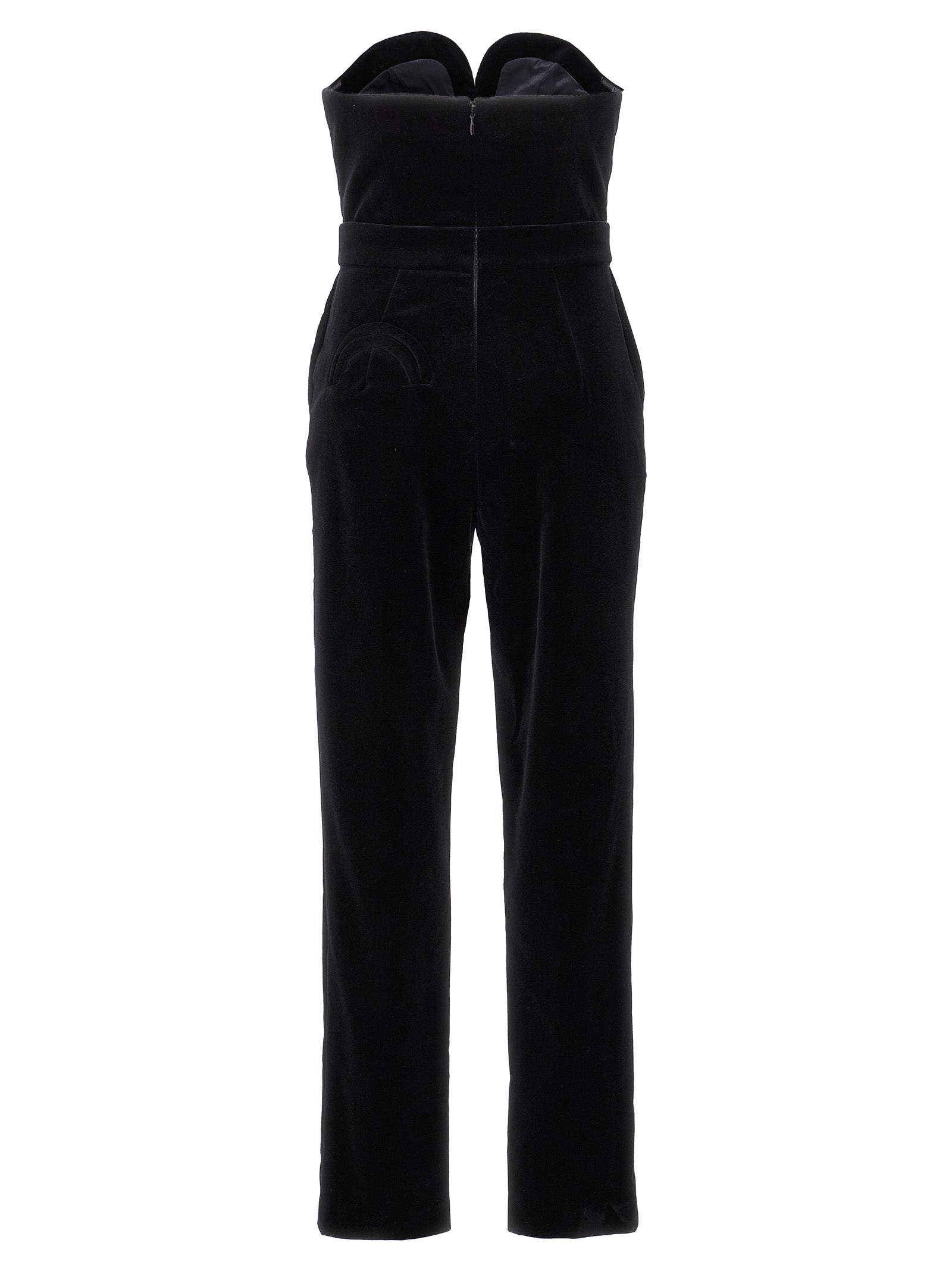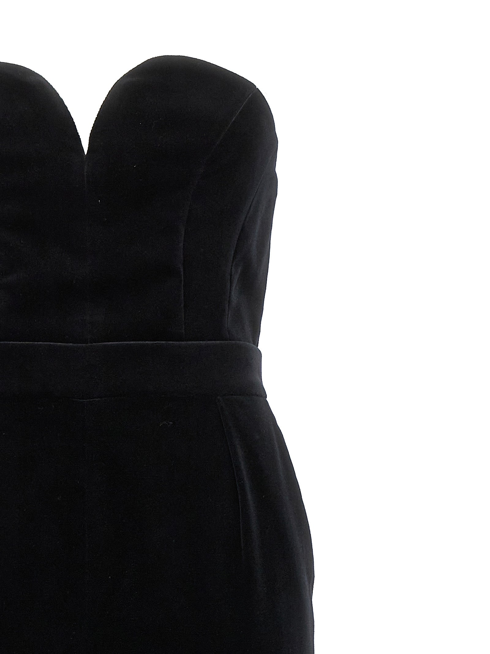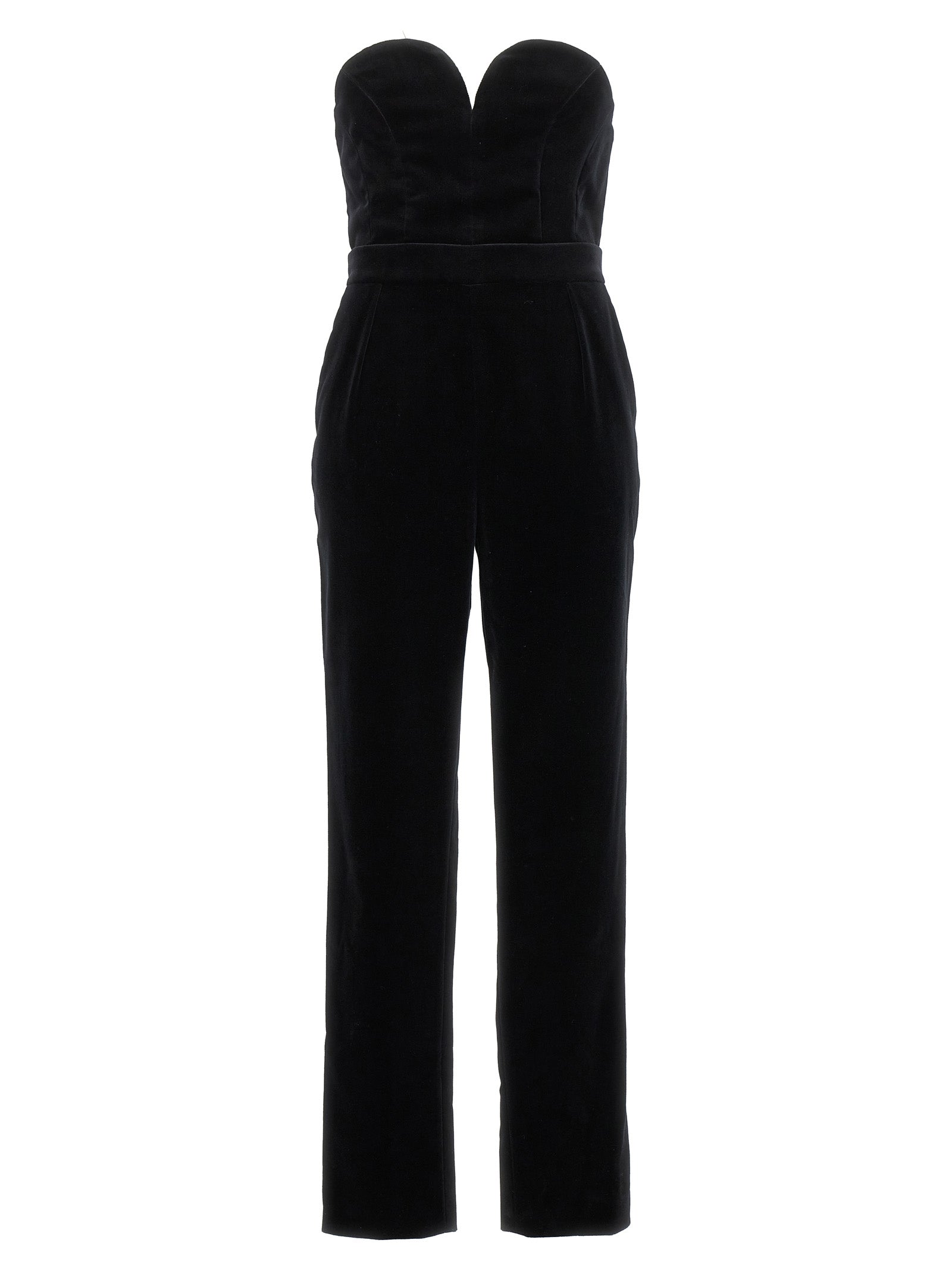 Jumpsuit de terciopelo con celos sin hombros con escote corazón y cierre de cremallera trasera.