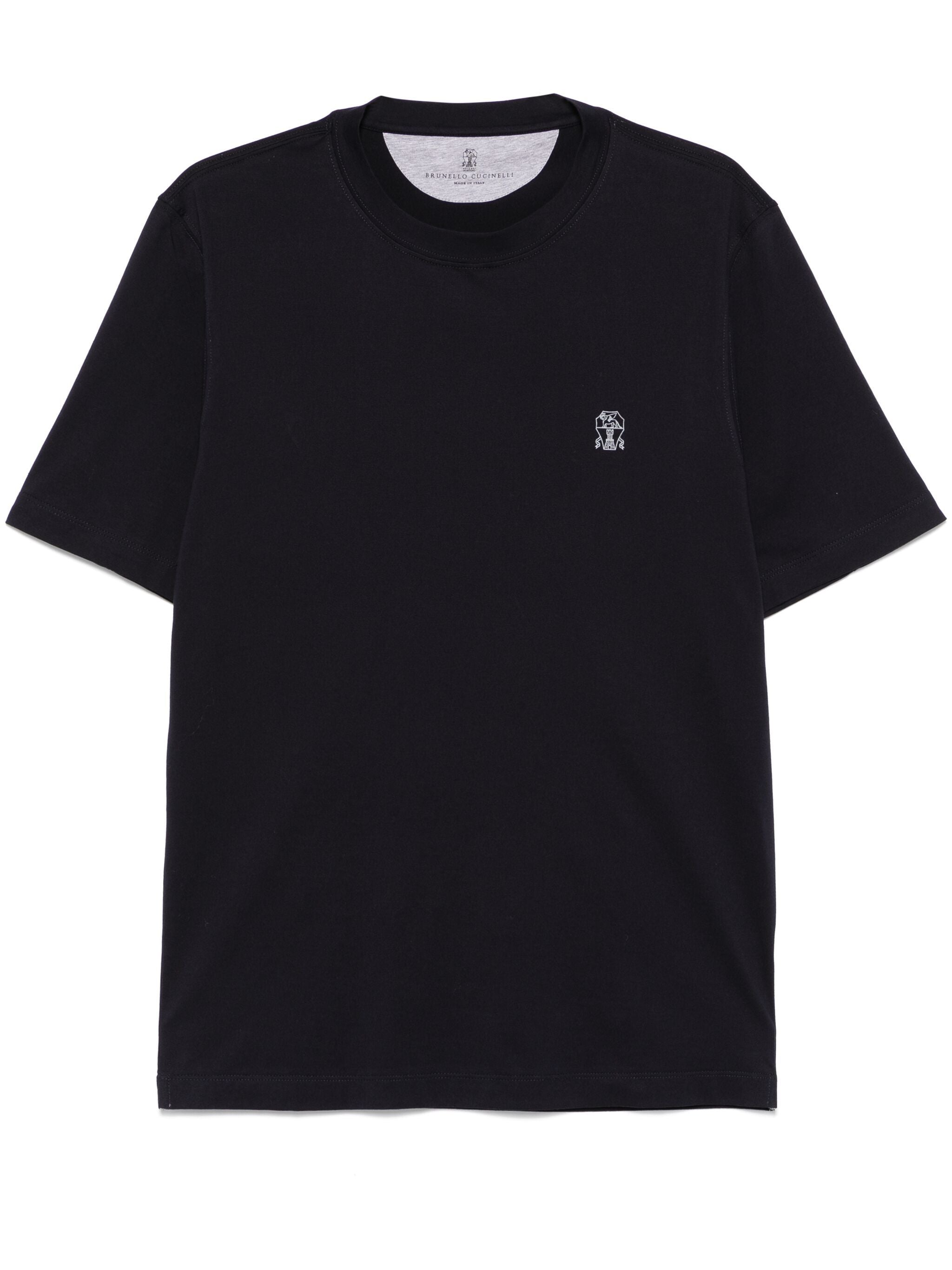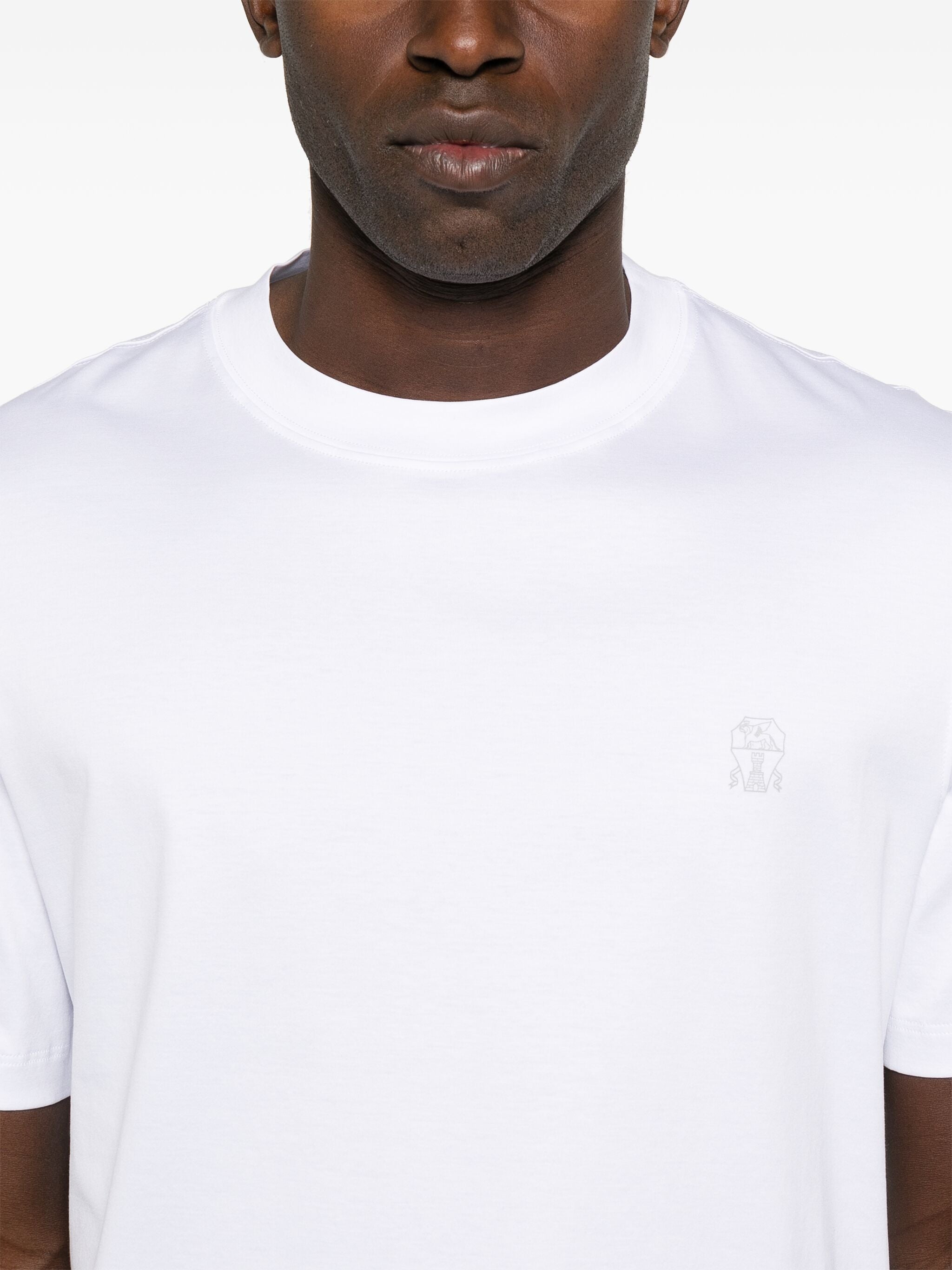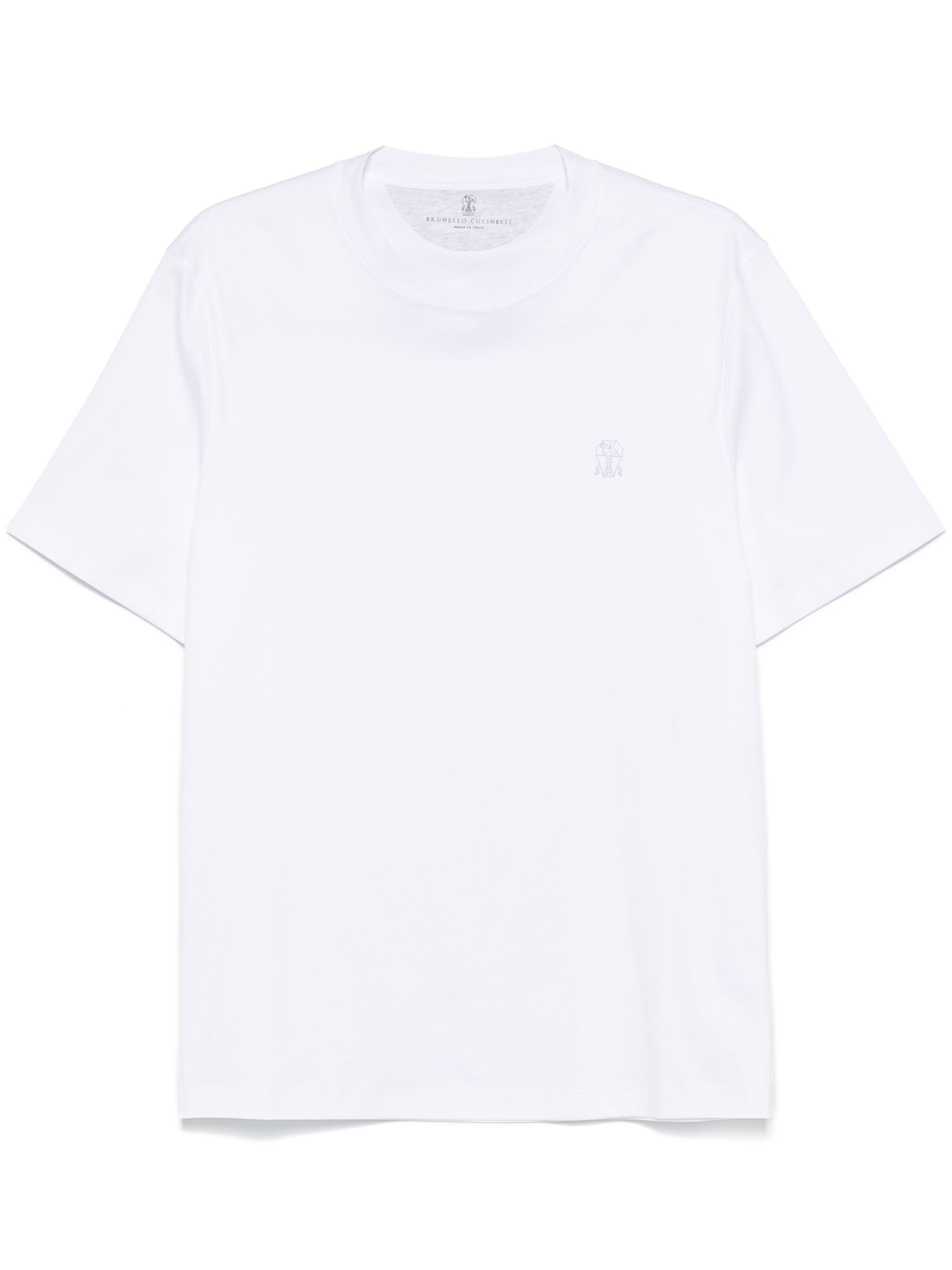 La T-shirt girocollo in jersey di cotone di Brunello Cucinelli unisce comfort e stile casual. Il morbido cotone esalta le tonalità di stagione, mentre il logo stampato sul petto aggiunge un tocco distintivo. La vestibilità basica con polsini e fondo ribattuti completa un look versatile ed elegante.