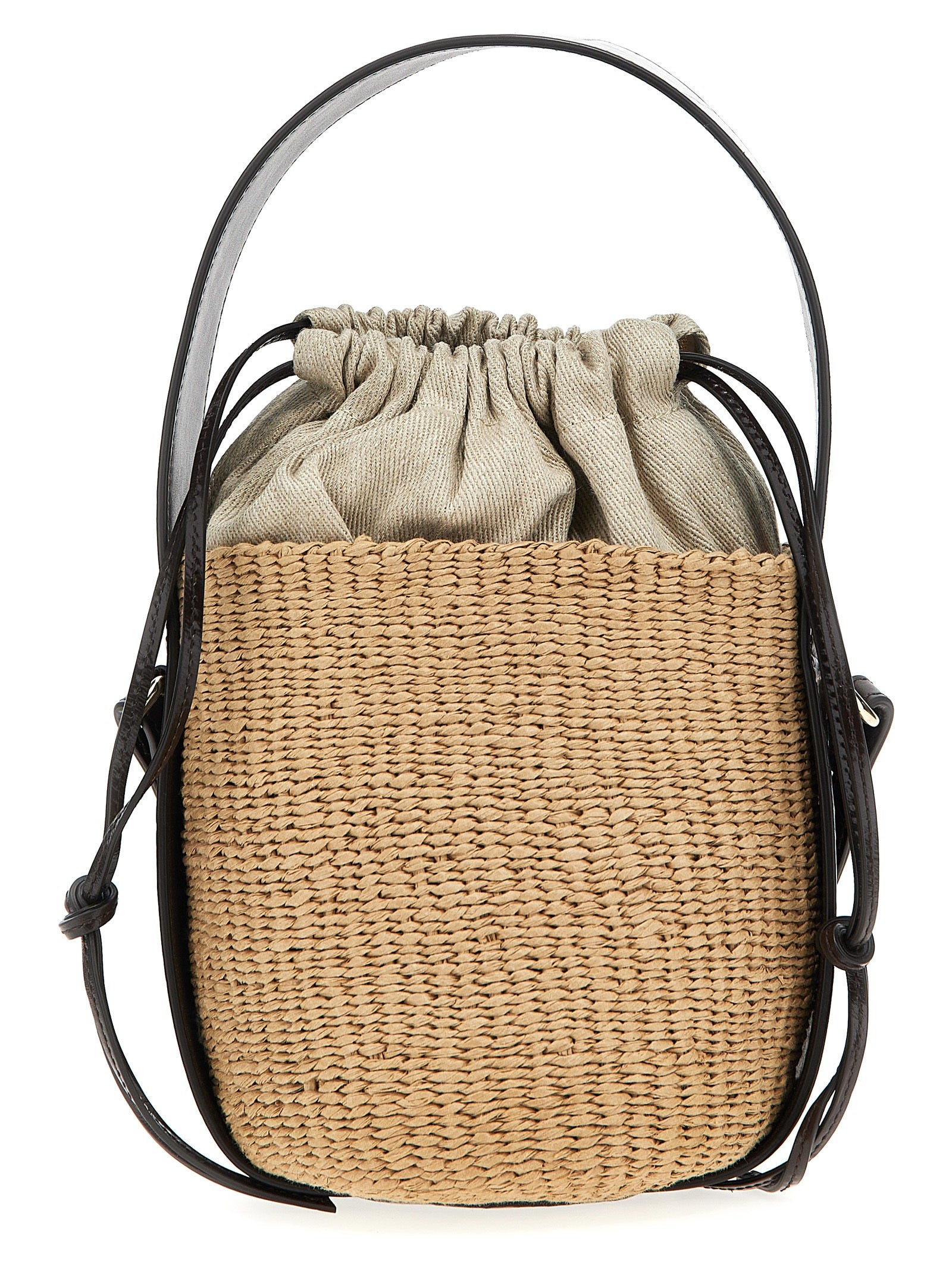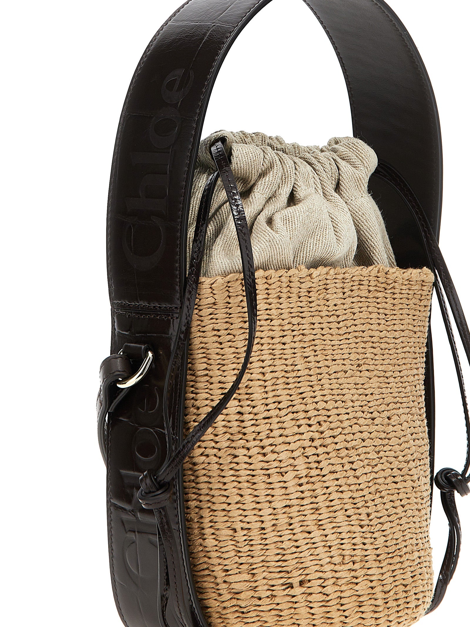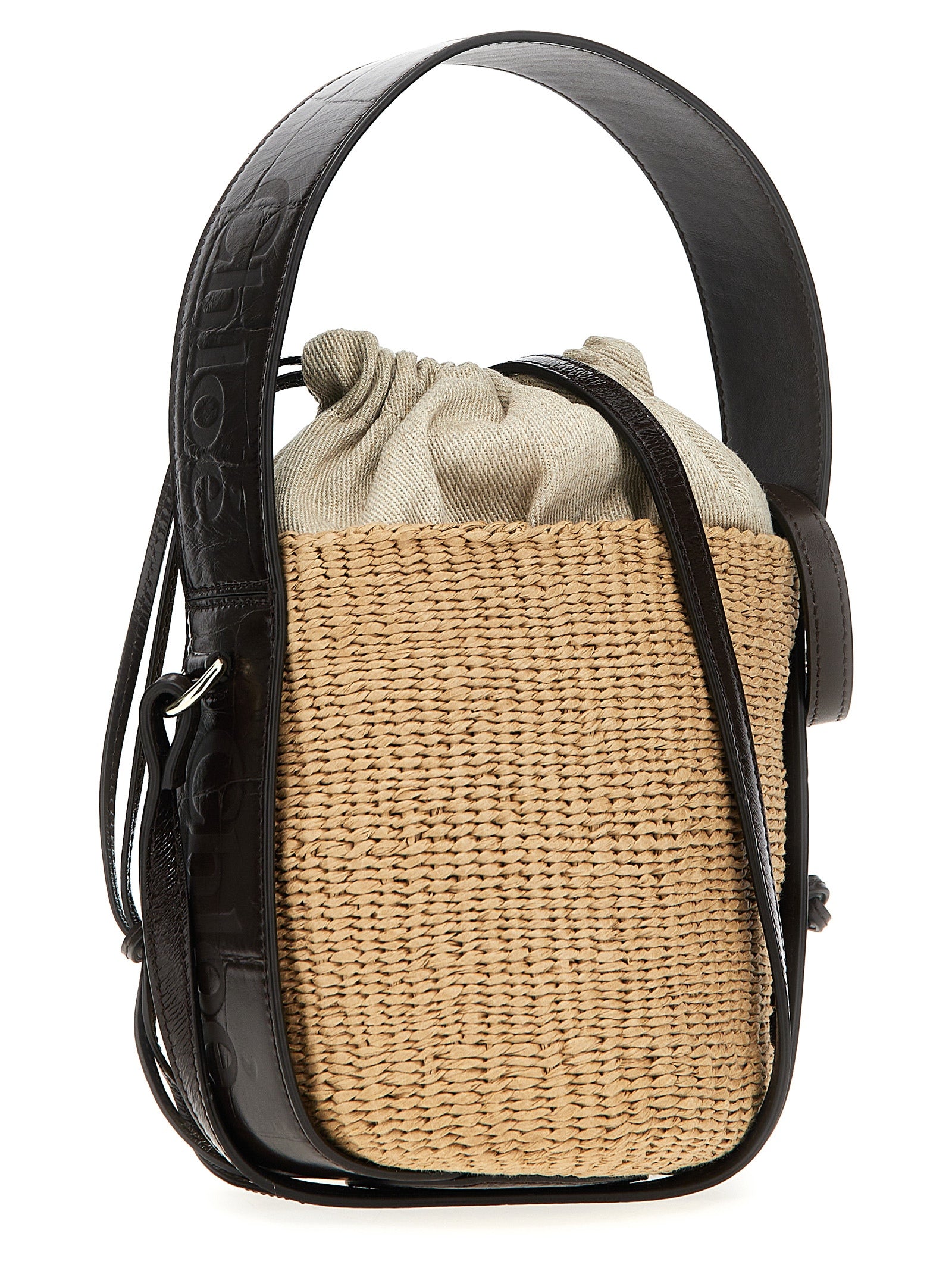 Pequeña bolsa de cuerpo cruzado 'leñosa' en rafia tejida, revestimiento de lona, ​​detalles de cuero con estampado de cocodrilo, cierre de cordón, mango corto fijo, correa para el hombro.