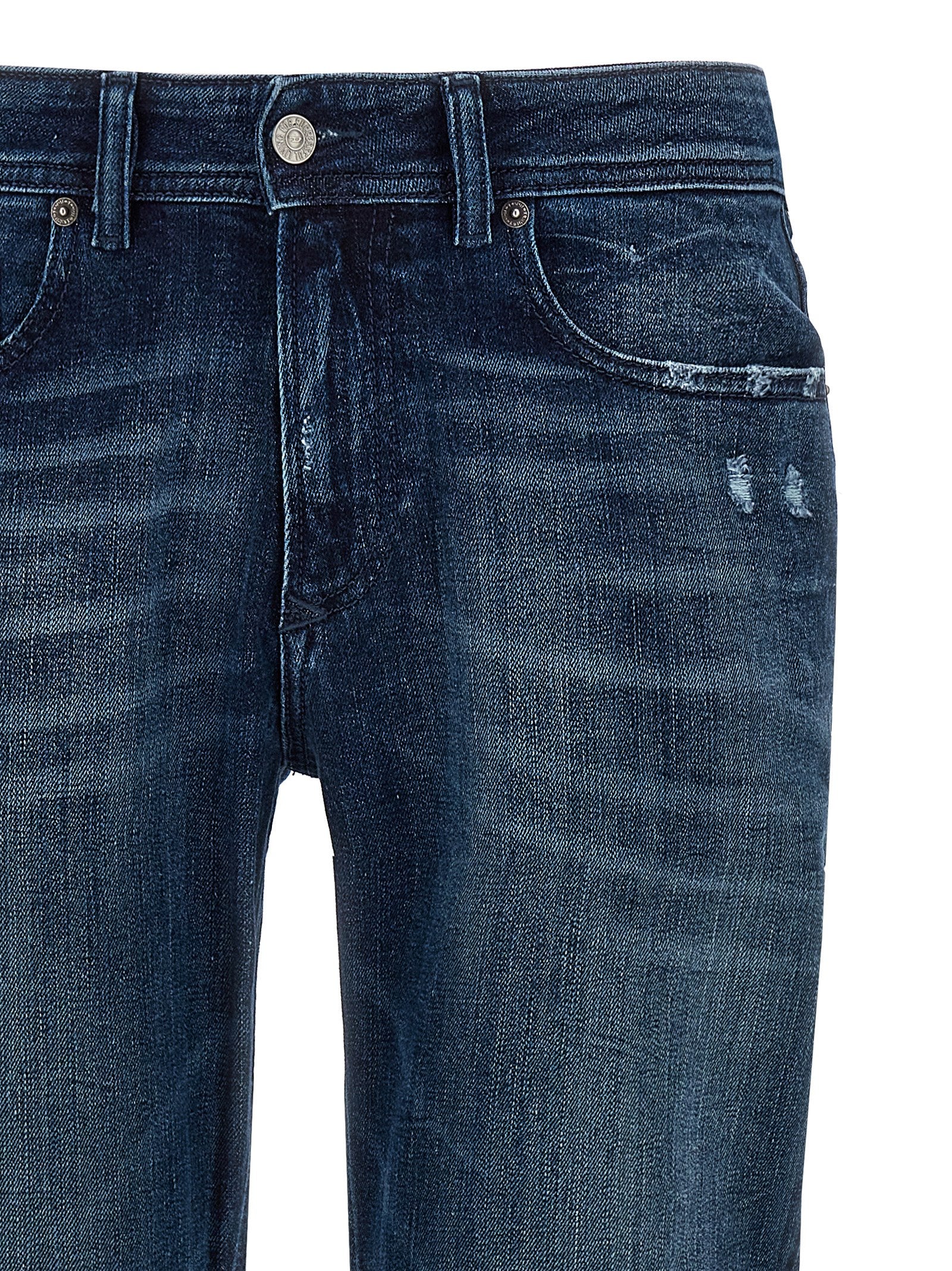 1979 Sleenker 'Jeans de mezclilla de algodón de algodón de piedra usados con efecto usado con cintura baja, pierna larga extra, cinco bolsillos, cierre de cremallera y botón, etiqueta de logotipo posterior.