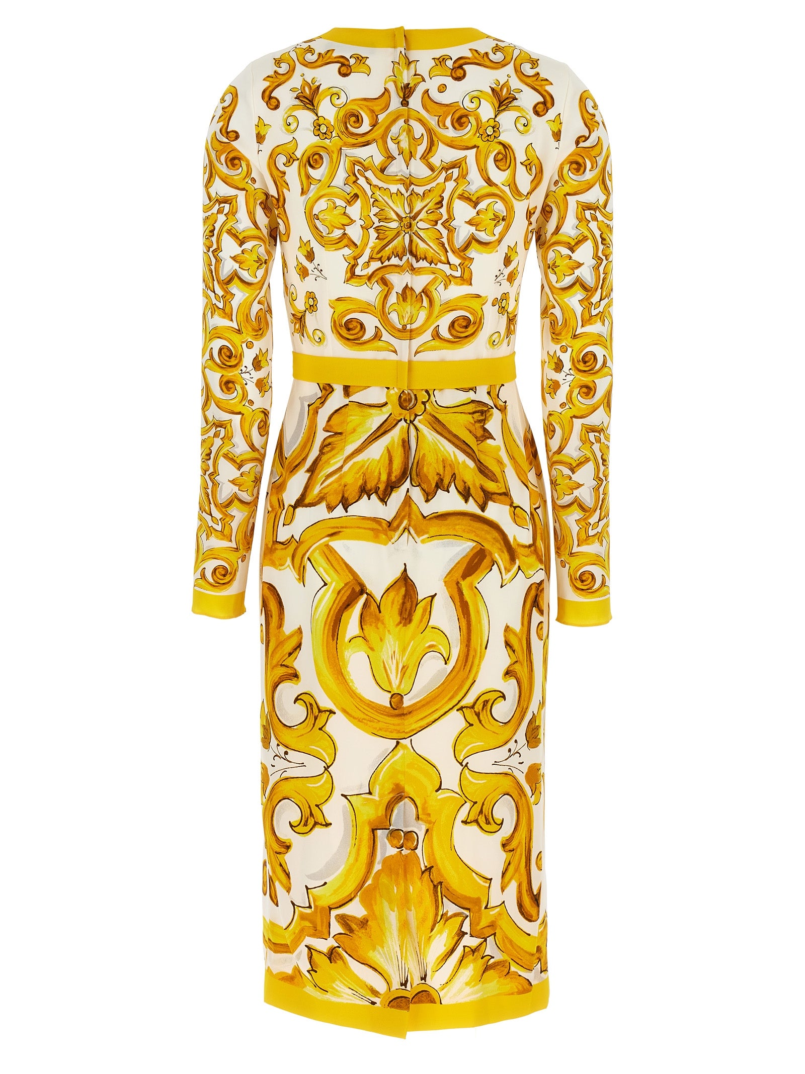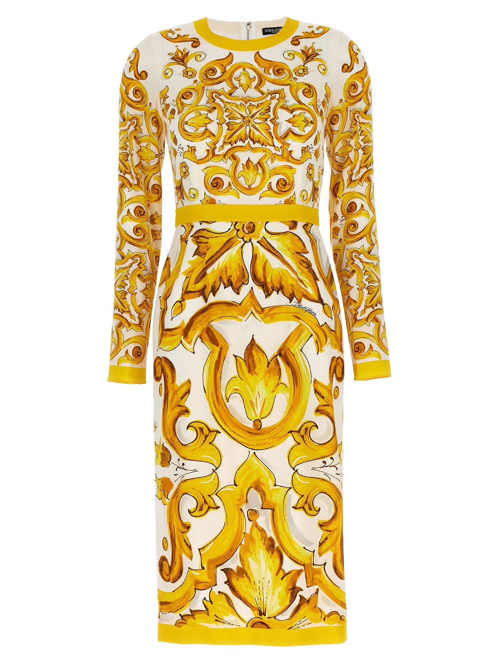 Vestido de vaina Longuette en Charmeuse de seda con estampado 'Maiolica', cierre de cremallera trasera, mangas largas.