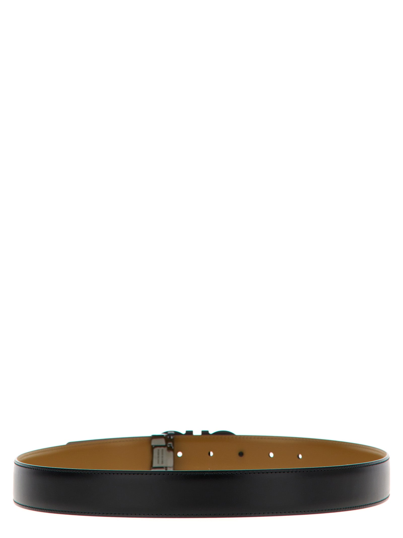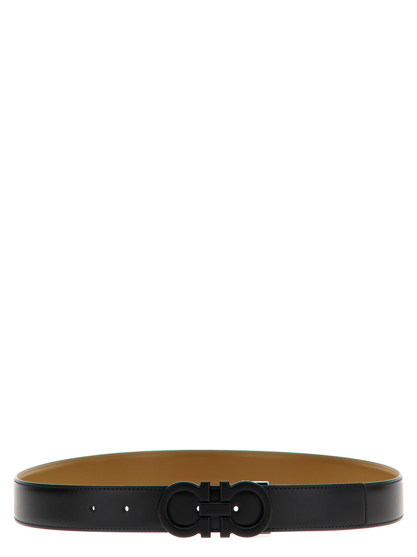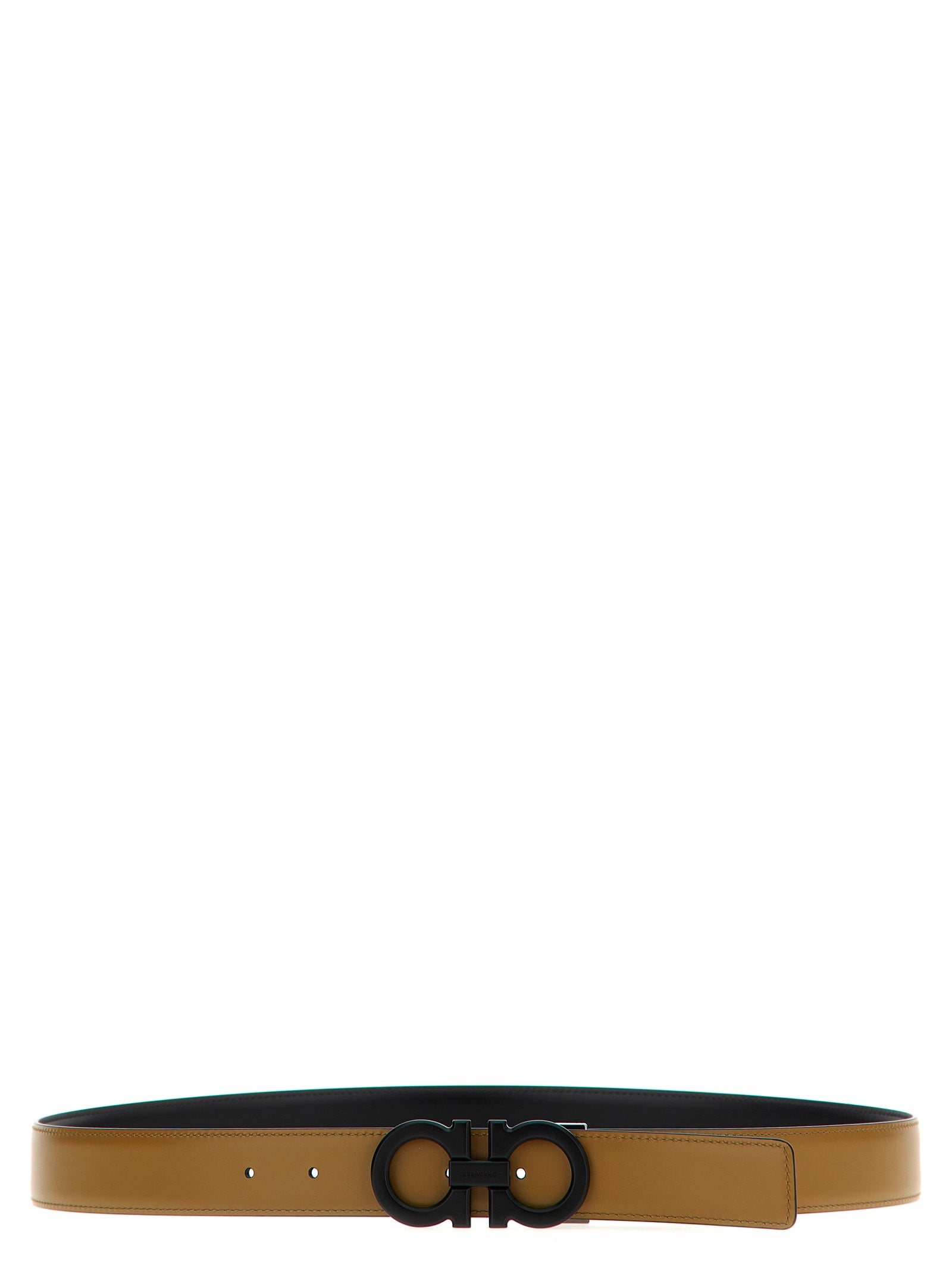 Cinturón reversible en beige y cuero negro, hebilla de metal con ganchos.