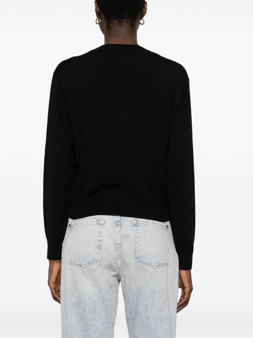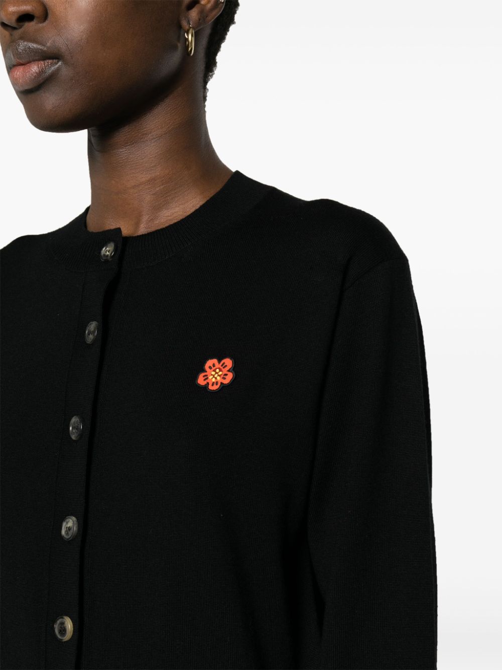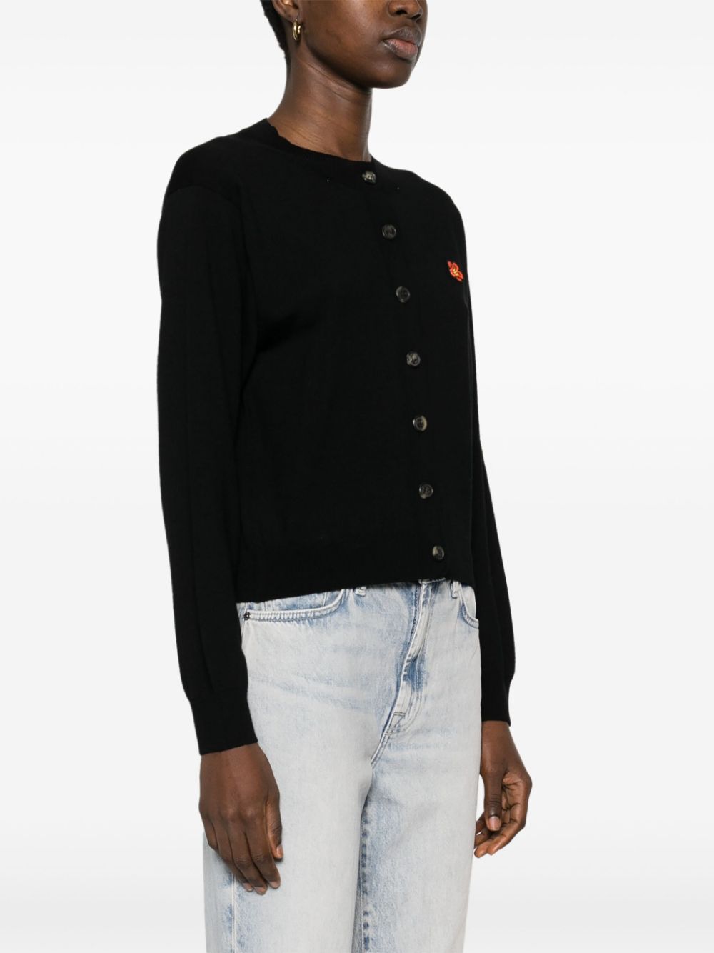 Patch de flores de bok de punto de punto de lana negro de lana de lana en la tripulación de la tripulación botón delantero del cuello en mangas largas y dobladillo sin dobladillo
