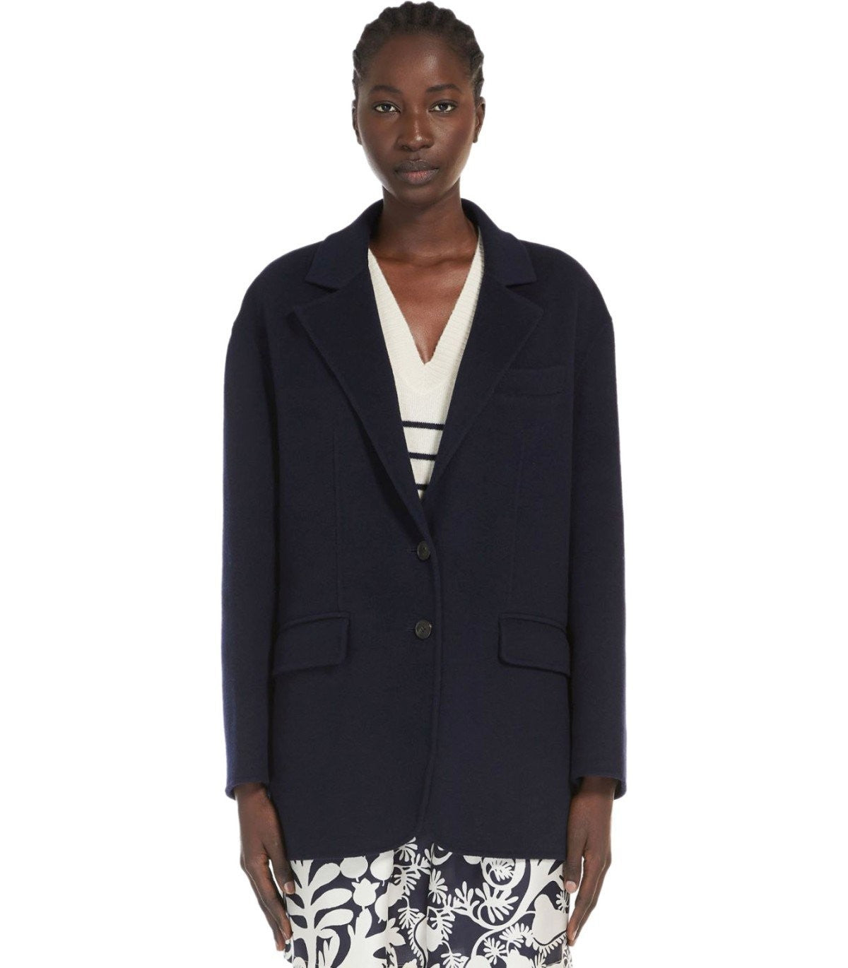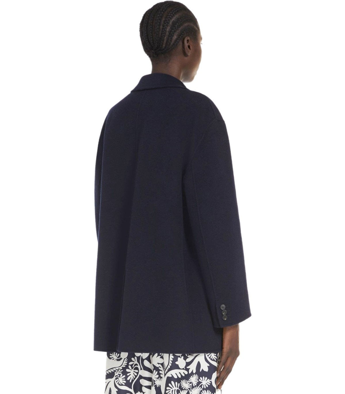 La chaqueta de fin de semana de Max Mara hecha de lana de color azul oscuro puro. Caracterizado por una línea recta y suave, presenta un collar de solapa, dos bolsillos de colgajo central y un pequeño bolsillo superior. El cierre incluye dos botones negros. El modelo usa tamaño 40 (IT) y mide 179 cm de altura. Composición: 100% lana, 50% viscosa, 50% de poliéster.