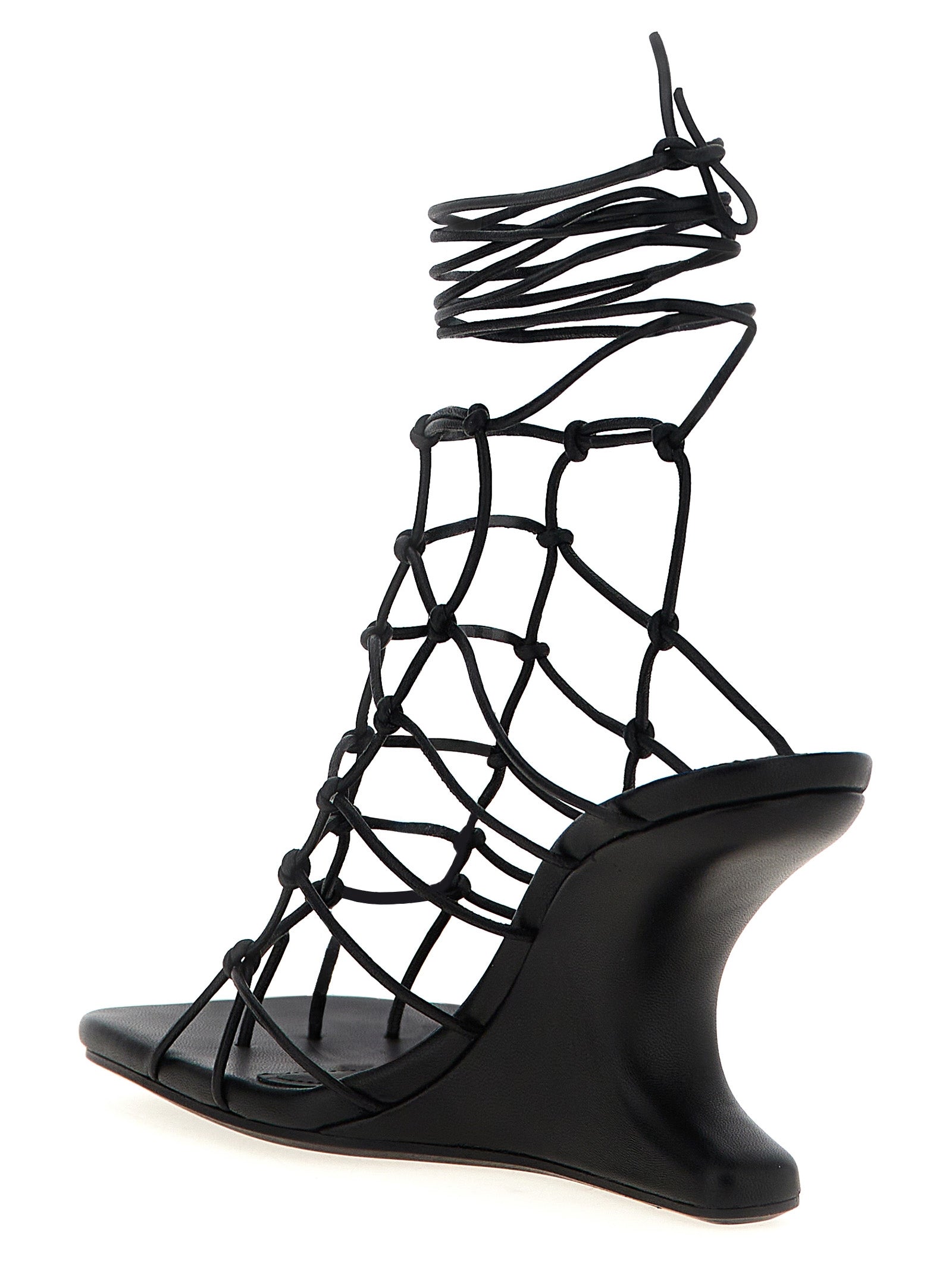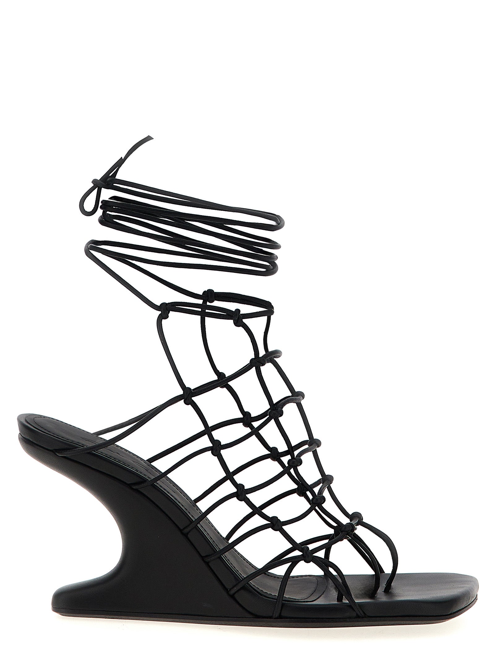 Sandalias de cuero trenzadas de 'voladizo web' con dedo del pie cuadrado, corbatas de tobillo, tacón en voladizo, suela de cuero.
