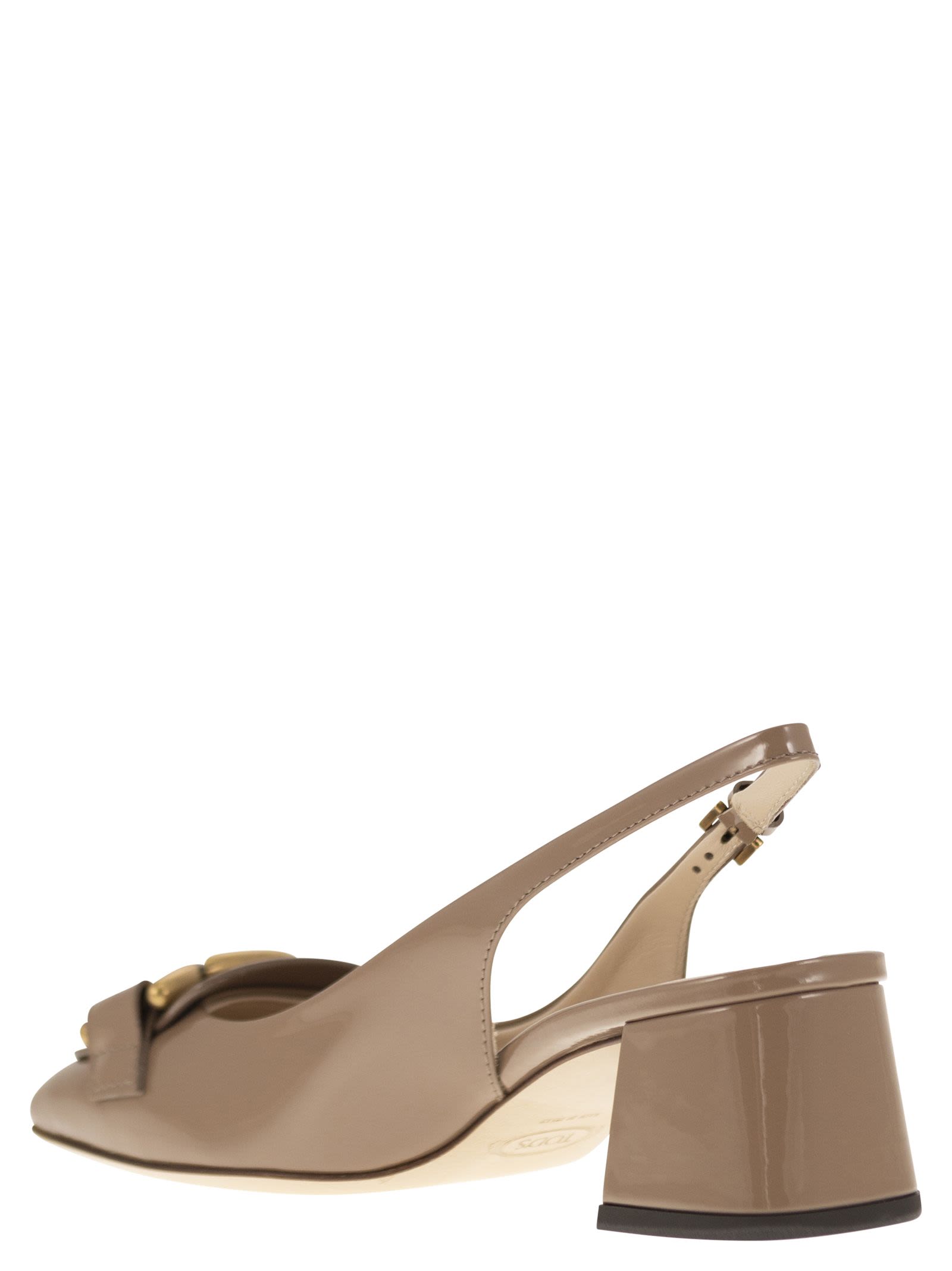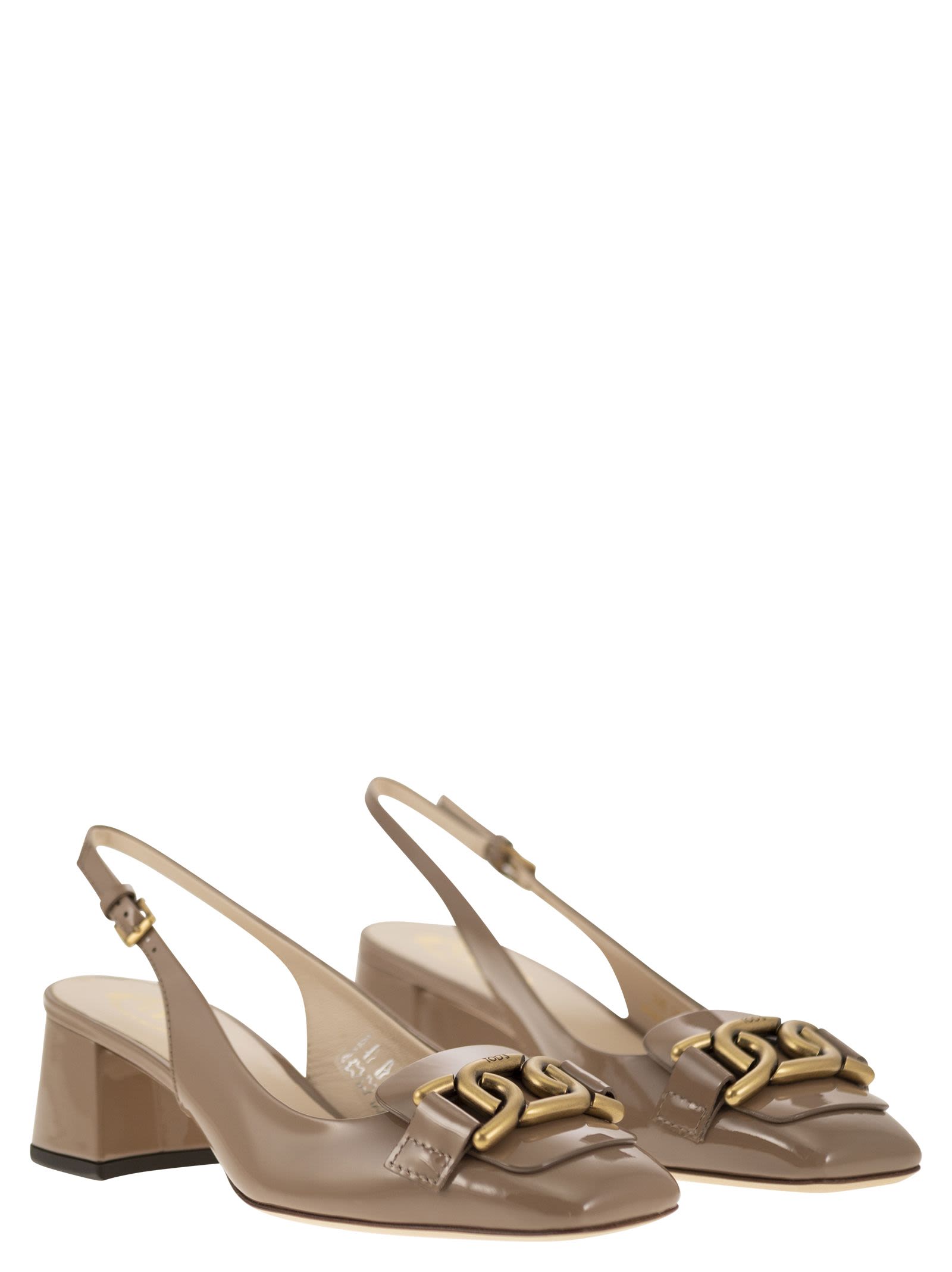 Bomba de hojas de cuero de patente con dedo cuadrado y accesorio icónico de cadena de metal personalizado. Con un talón cubierto mediano y una suela de cuero, es un modelo refinado que combina comodidad y elegancia. - Superior de cuero de piel de ternera - Acabado varnado - Accesorio de cadena de metal personalizado - Correa del talón - ID de diseñador de plantillas de cuero: XXW96K0IB60SFKC413