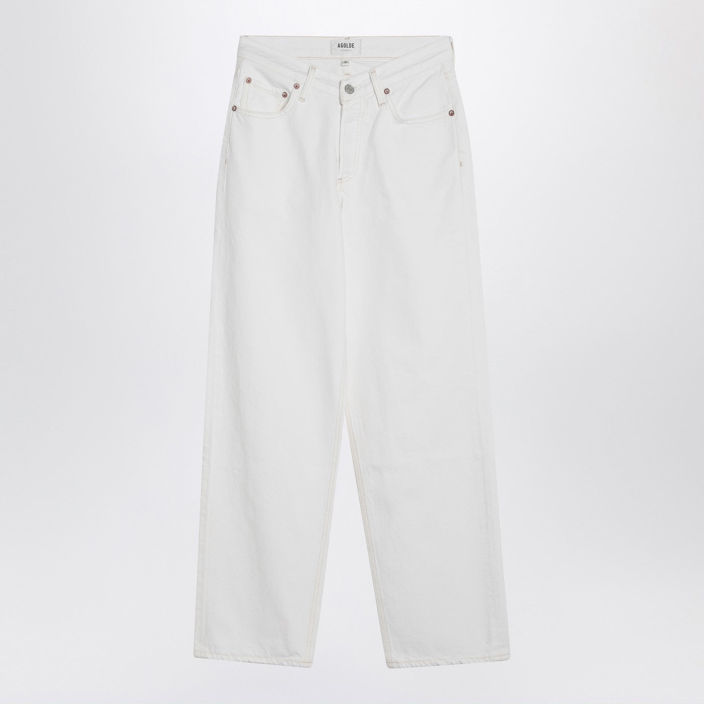 Los jeans Agolde en mezclilla de algodón regenerado blanco, con un cierre delantero y botón, bucles de cinturón, costuras de contraste y cinco bolsillos clásicos.