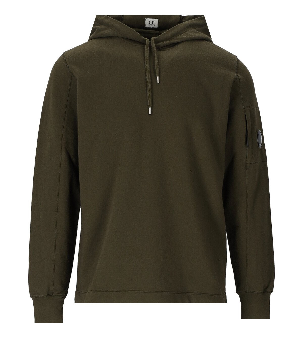 Light Fleece Hoodie de C.P. Compañía hecha en algodón verde militar. Capucha ajustable con inserto del logotipo trasero, bolsillo con cremallera decorada con la lente icónica en la manga izquierda. Puños en tela elástica. Composición: 100% algodón.