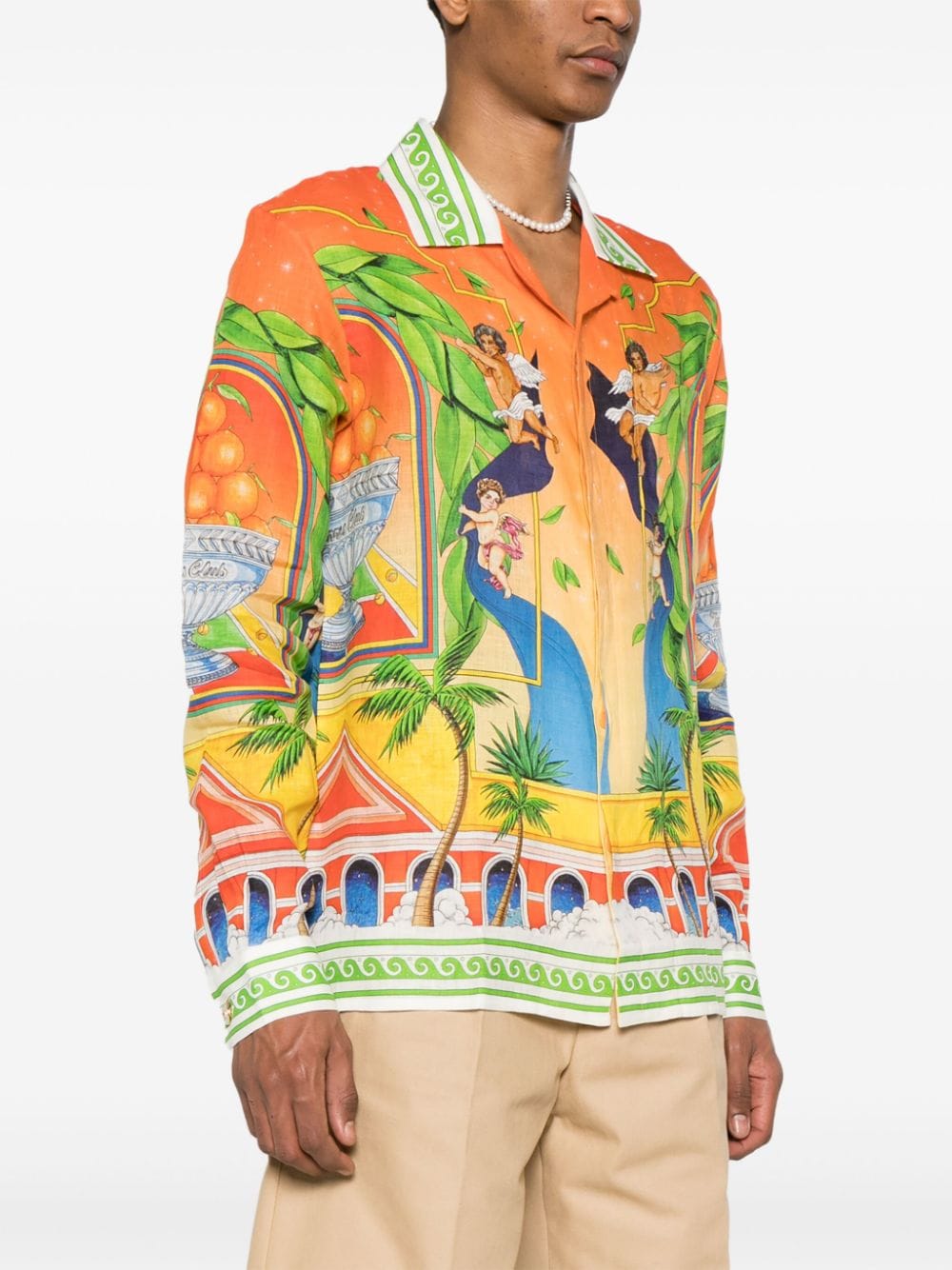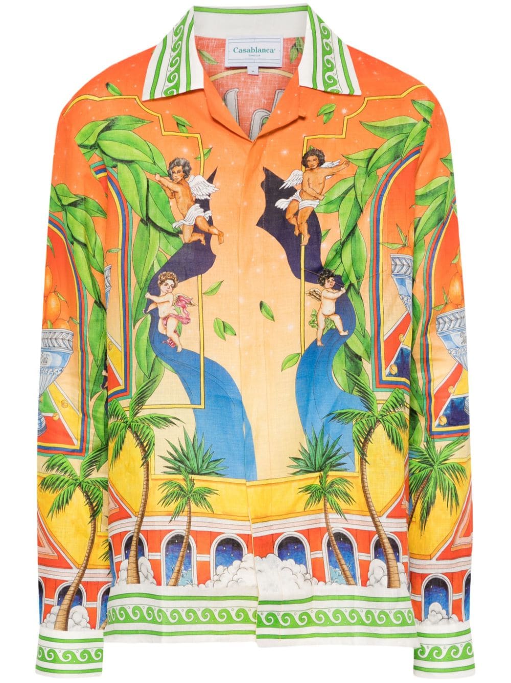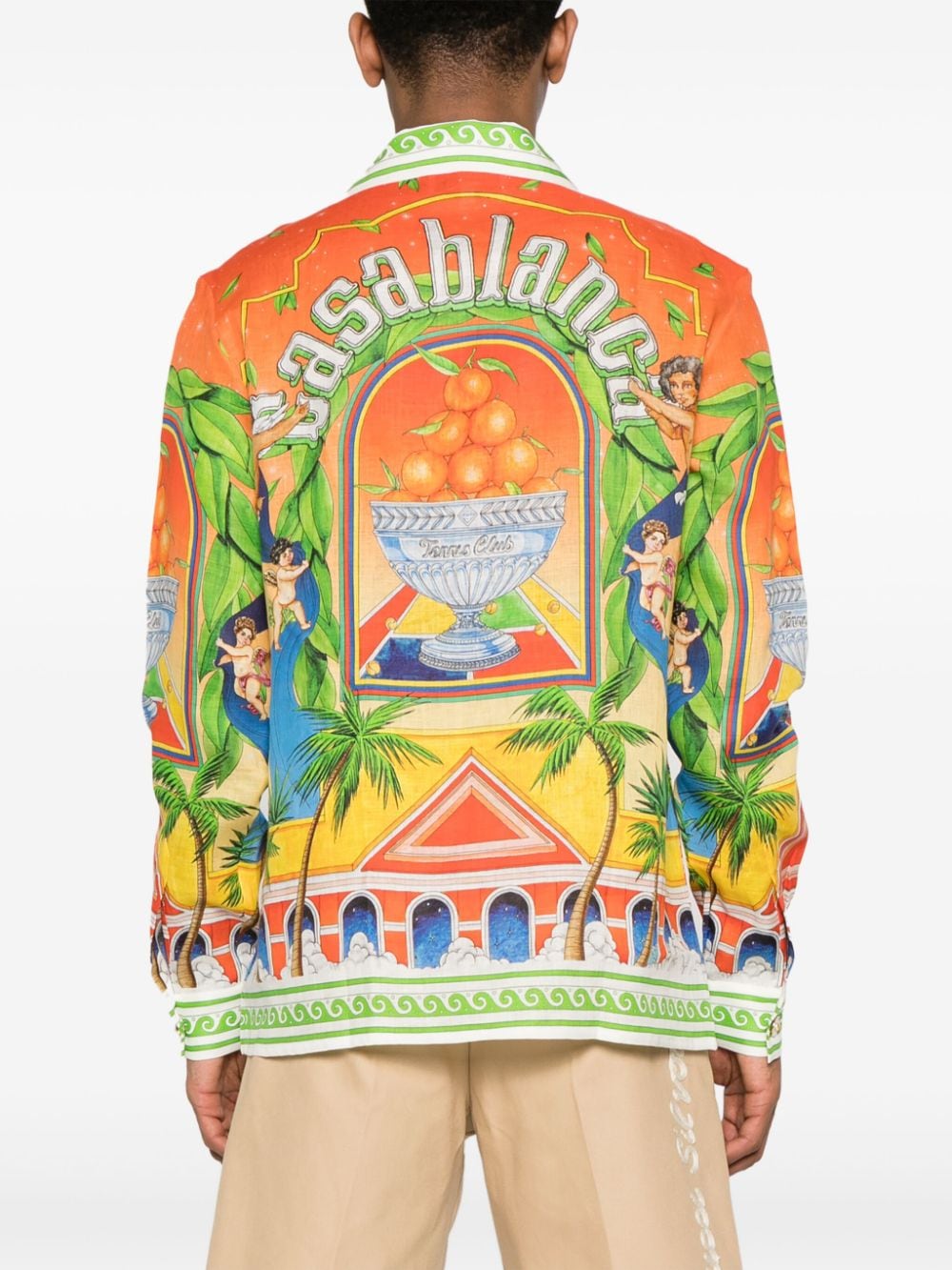 Naranja/multicolor de lino/lino trofeo estampado naranja collar cubano botón frontal oculto fijación de mangas largas embellecidas bosqueadas parche de pecho dobladillo recto