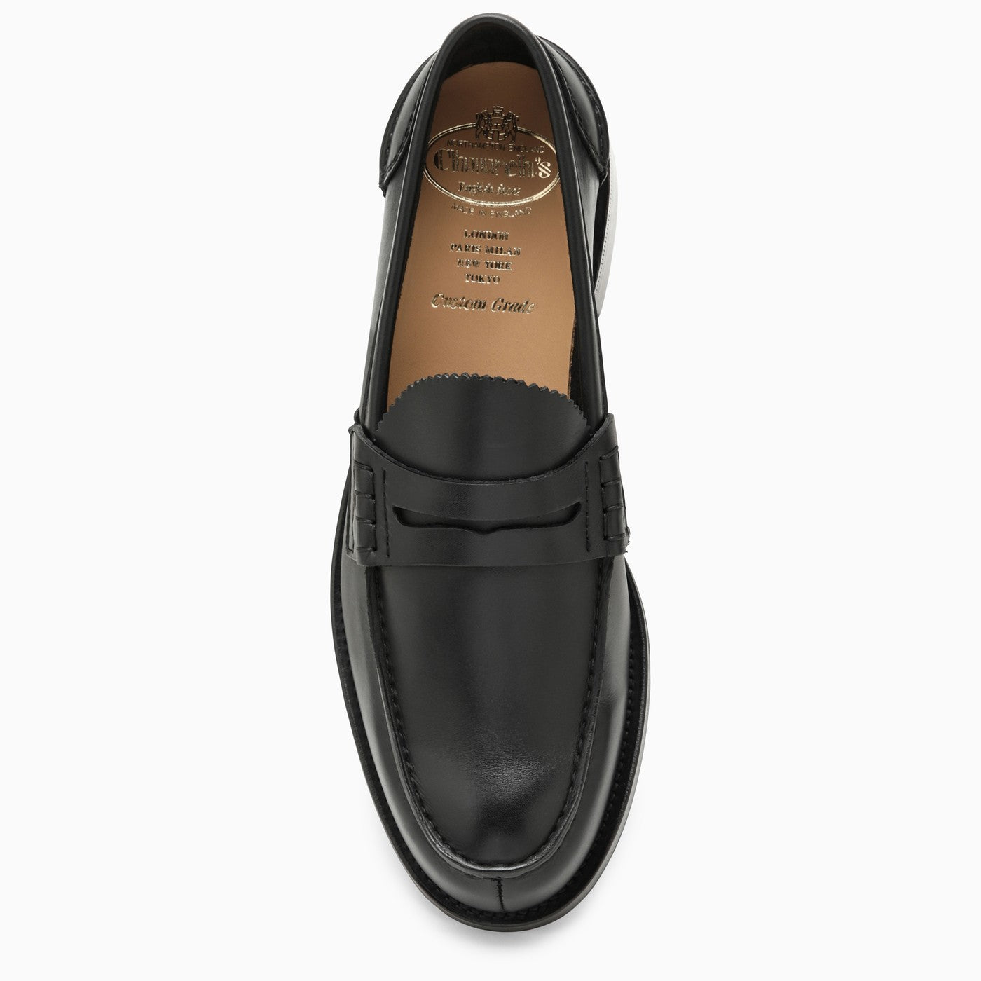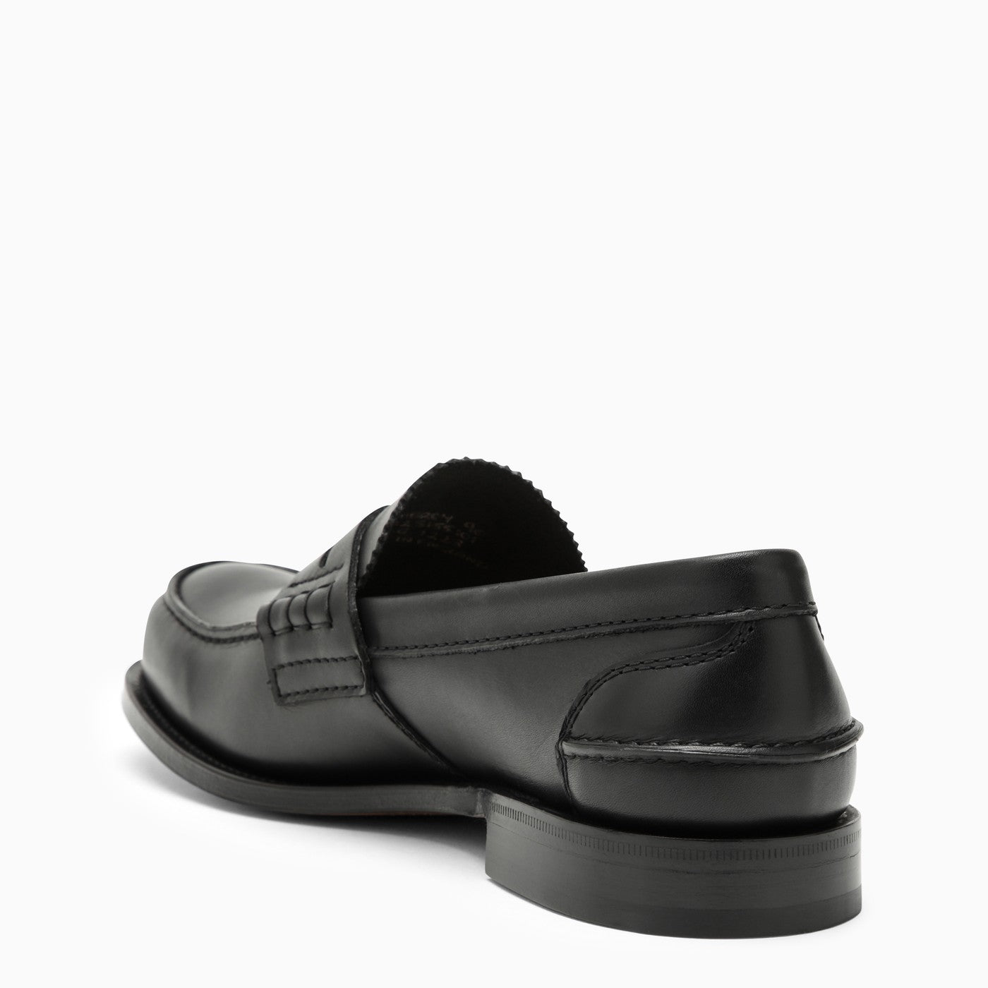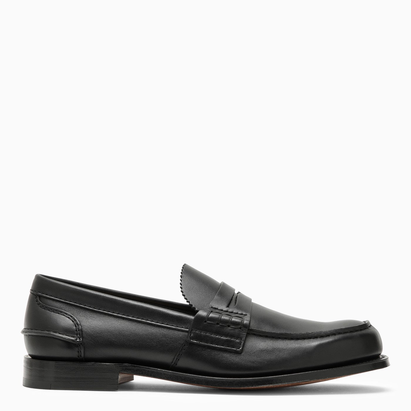 College Moccasin by Church en becerro ahumado negro brillante con un dedo redondo, soporte de talón interno, una plantilla de logotipo interna y una suela de goma.