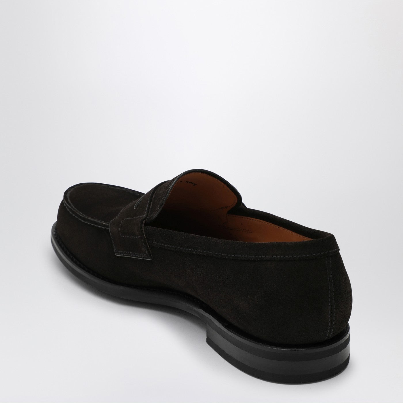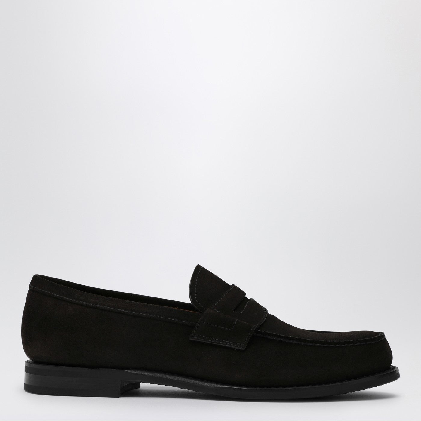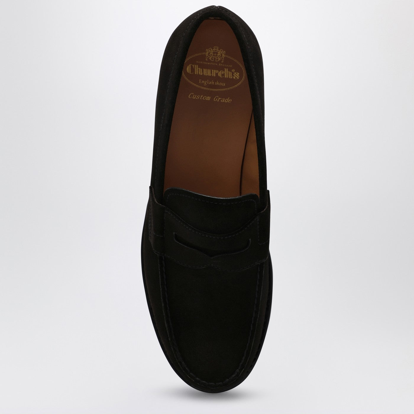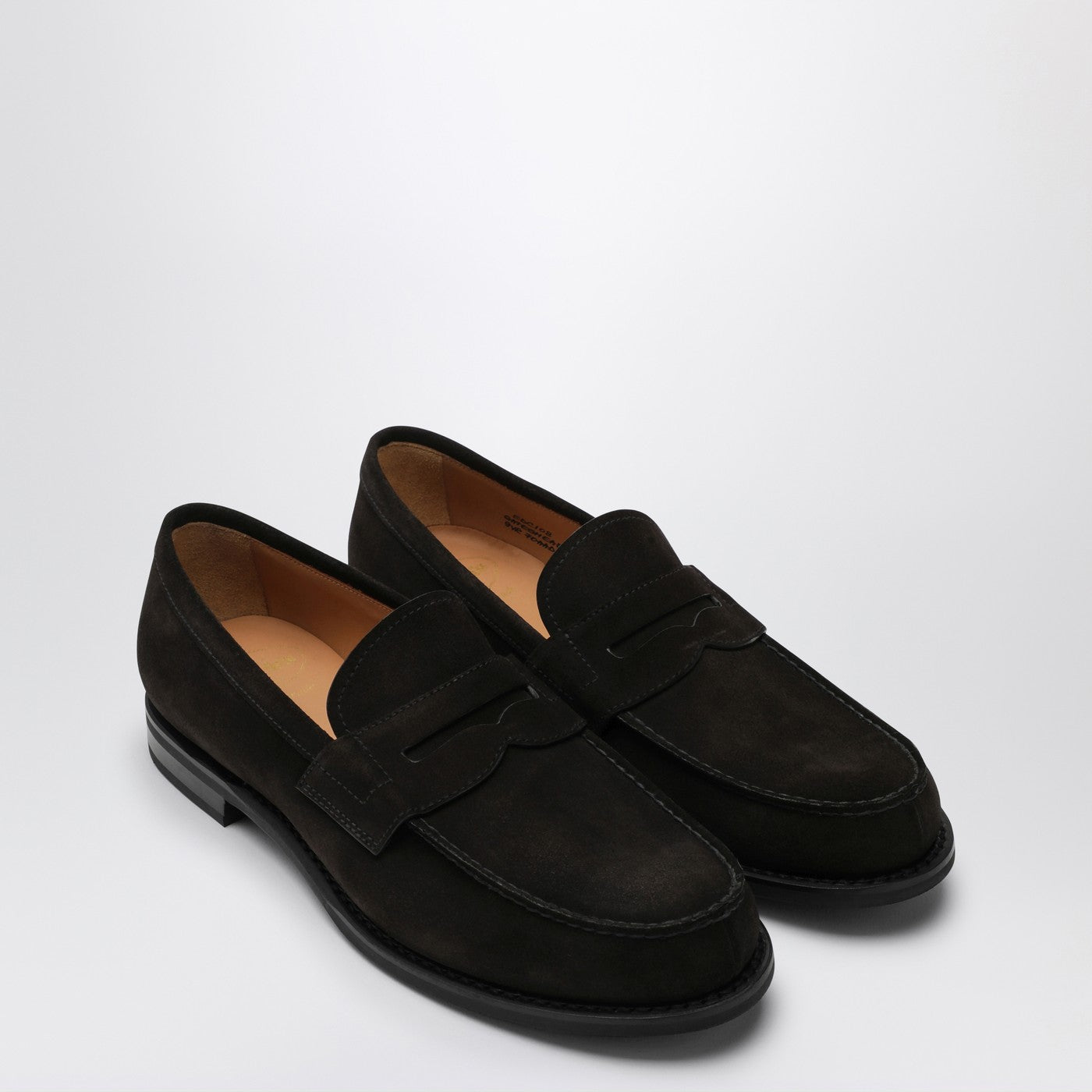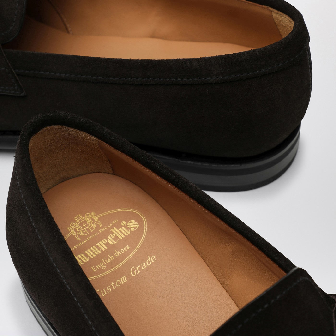 Iglesia de ante marrón 's mocasin con un dedo redondo, impresión del logotipo en la plantilla y suela y suela de goma.
