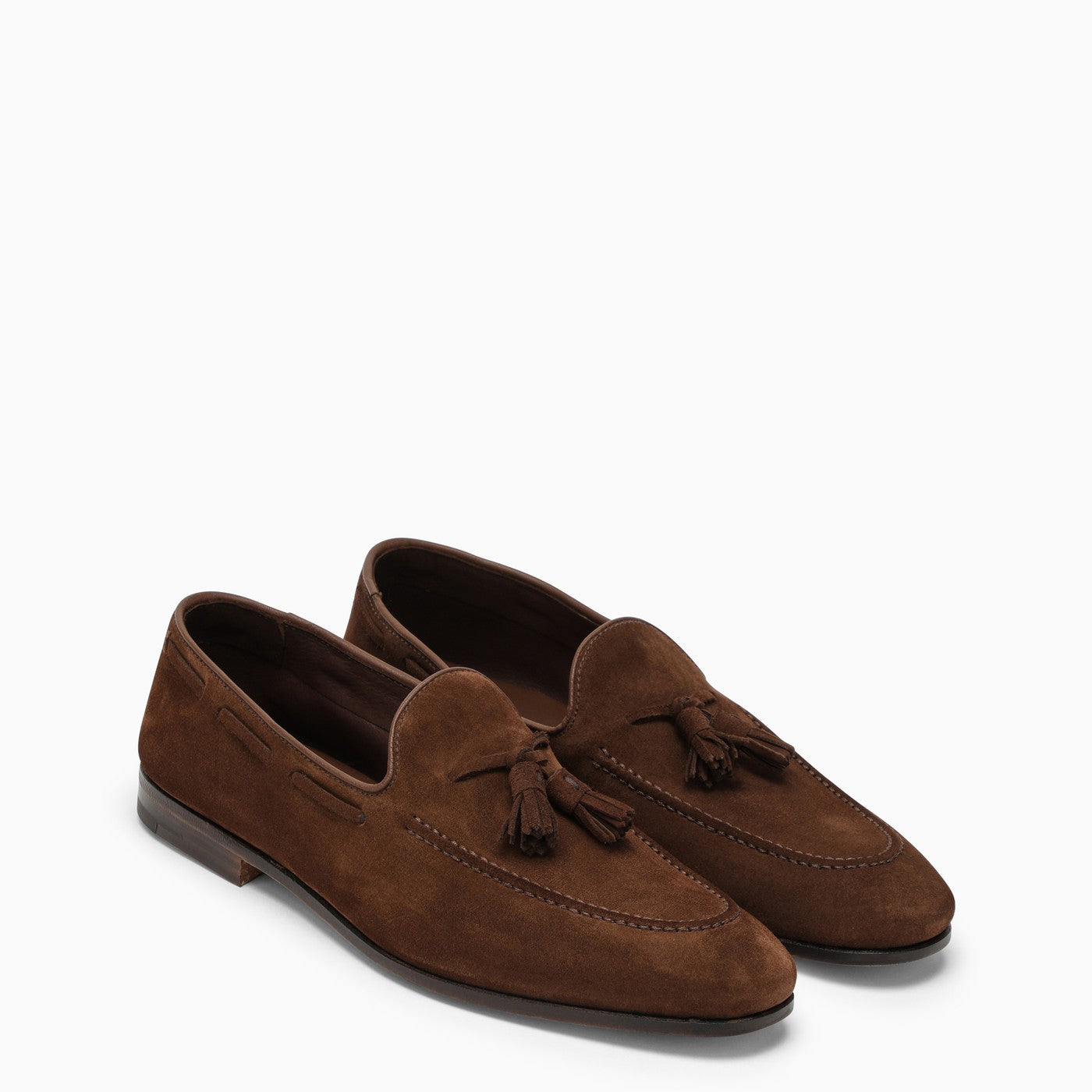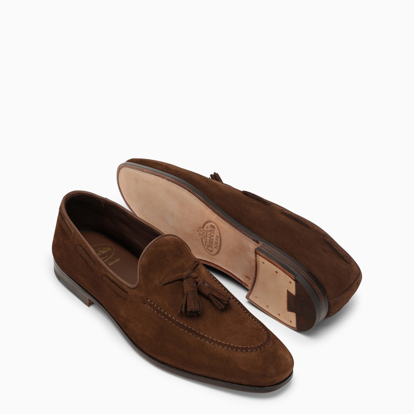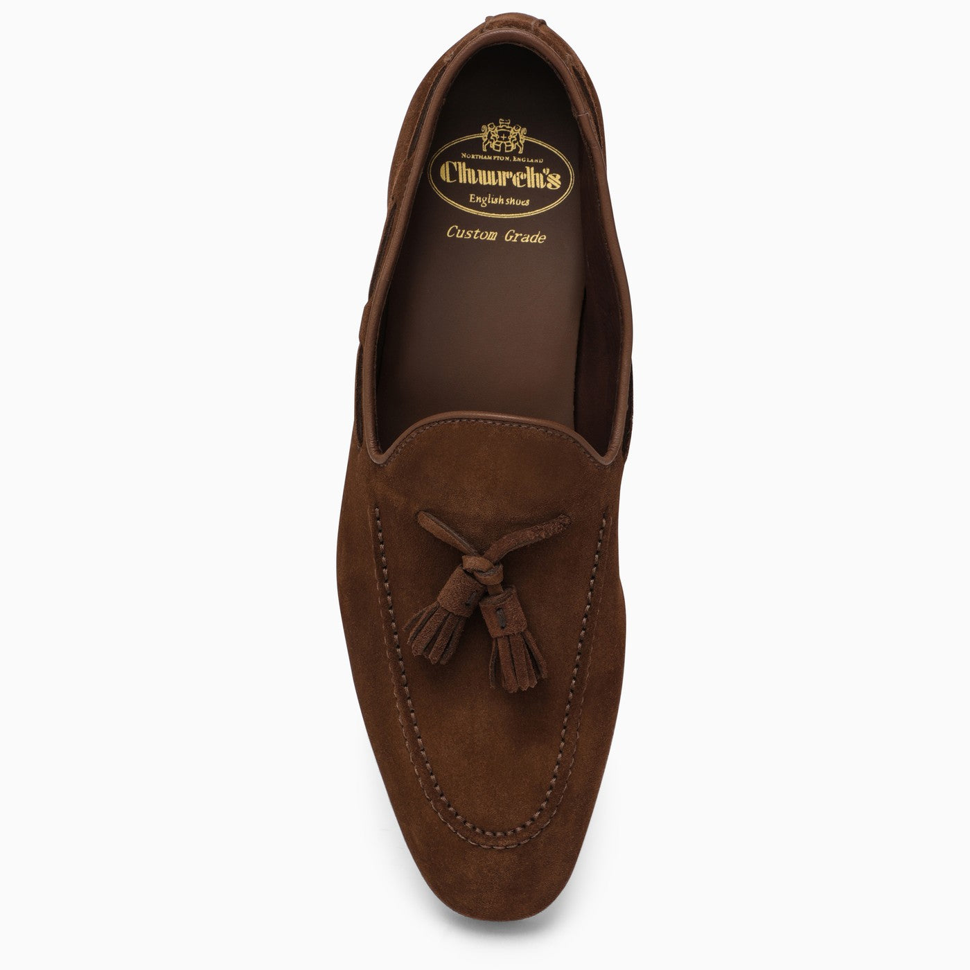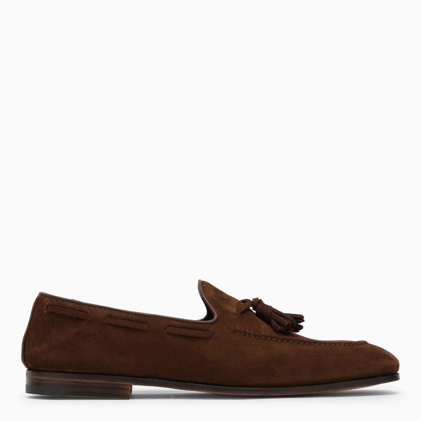 Mocasín de cuero marrón de la iglesia con un dedo redondo, detalle de borla en la parte delantera y suela de cuero.