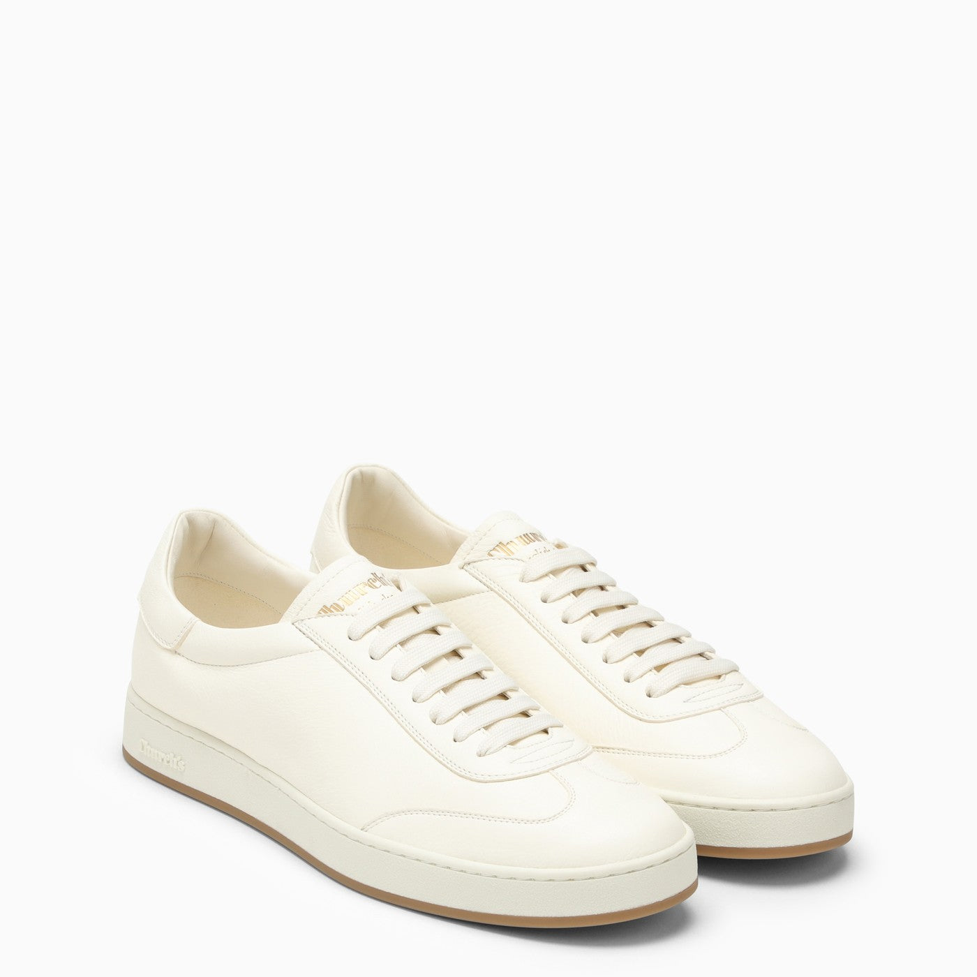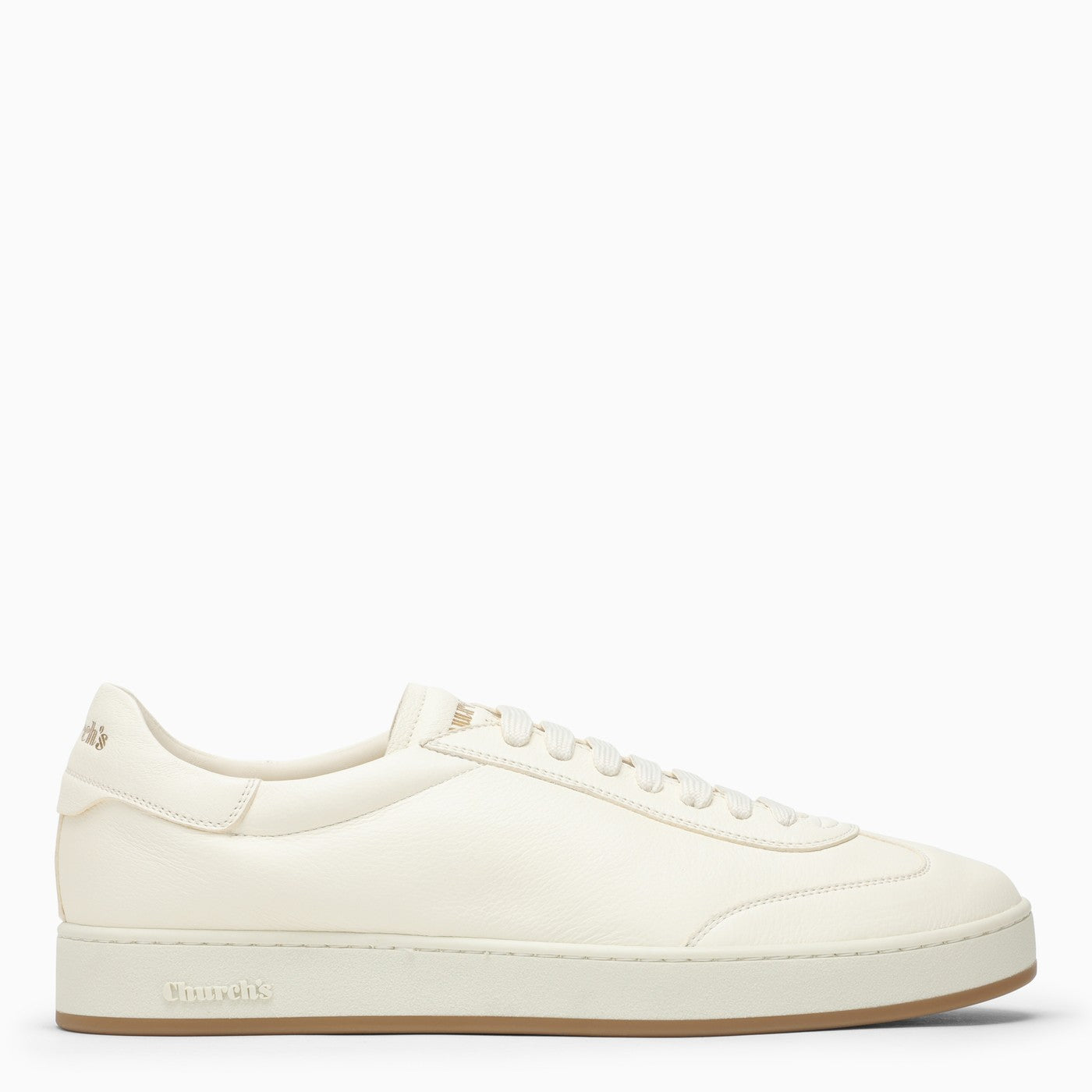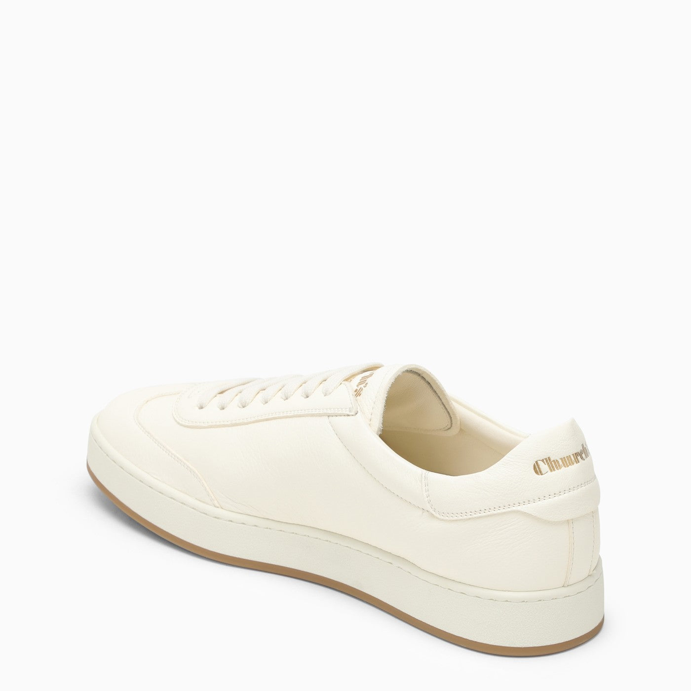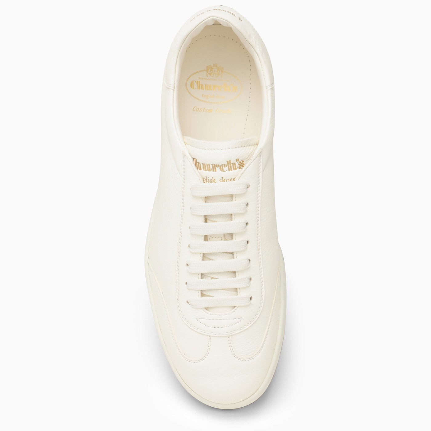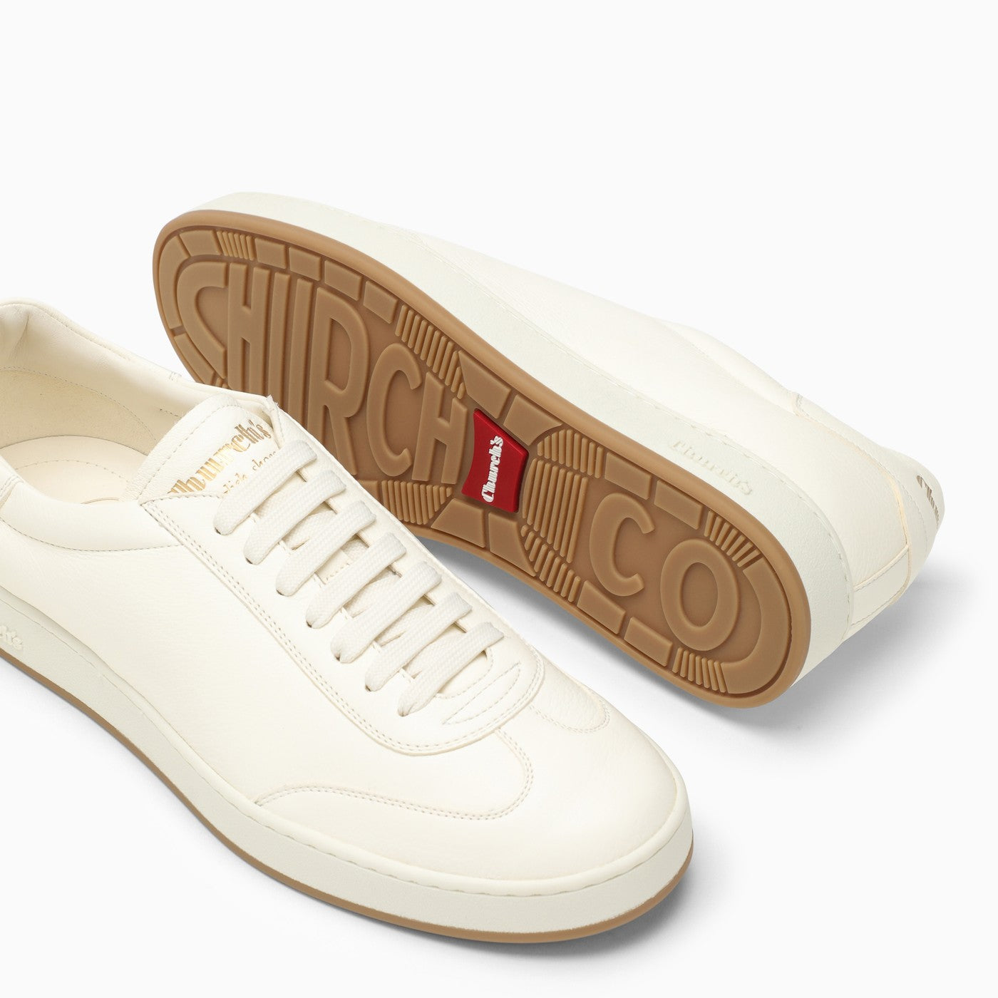 Entrenador de gamuza y piel de color marfil de la iglesia con una fijación de cordones, un dedo del pie redondeado, letras en contraste en la parte posterior y la lengua, una plantilla acolchada removible y una suela de goma.