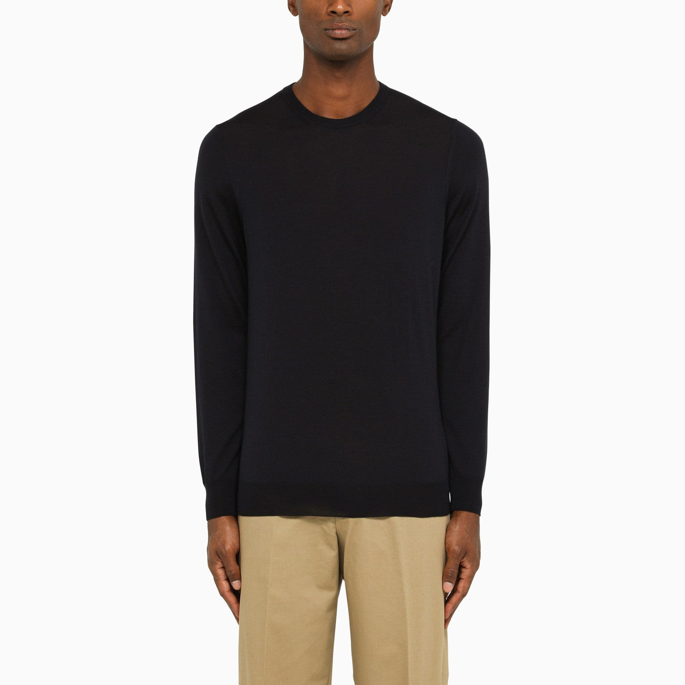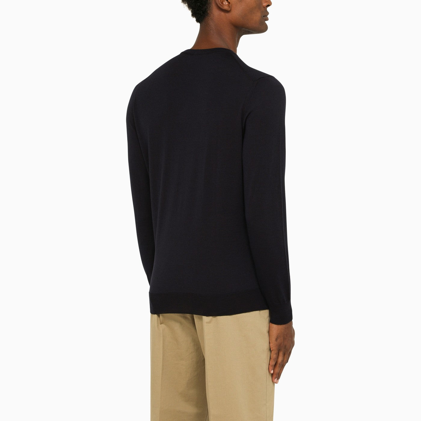Suéter de cuello de tripulación ligero de lana azul de Drumhr con mangas largas y adornos acanalados. Ajuste regular.